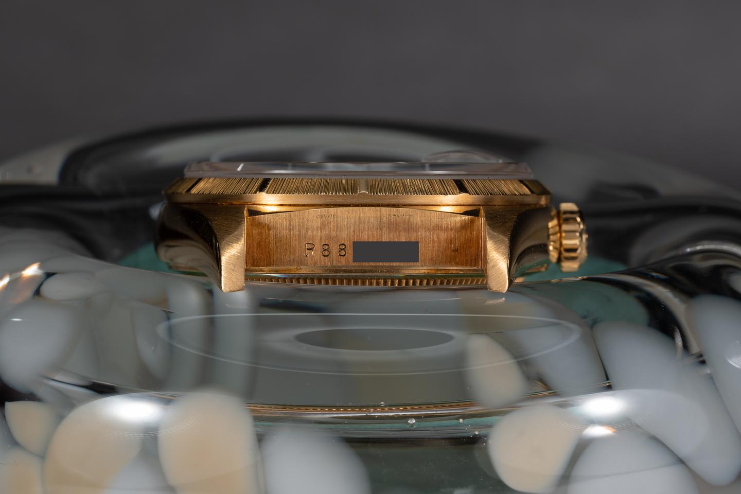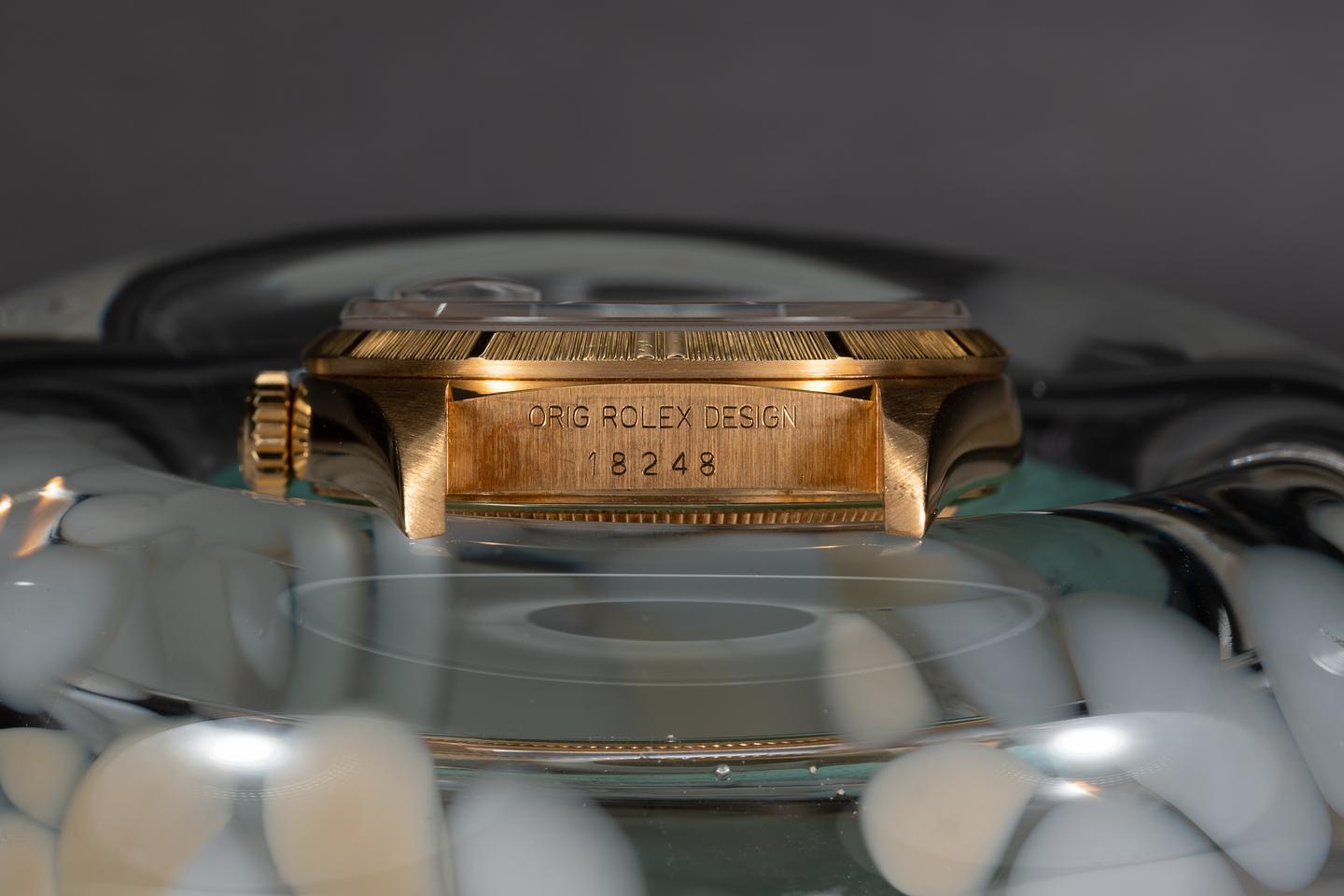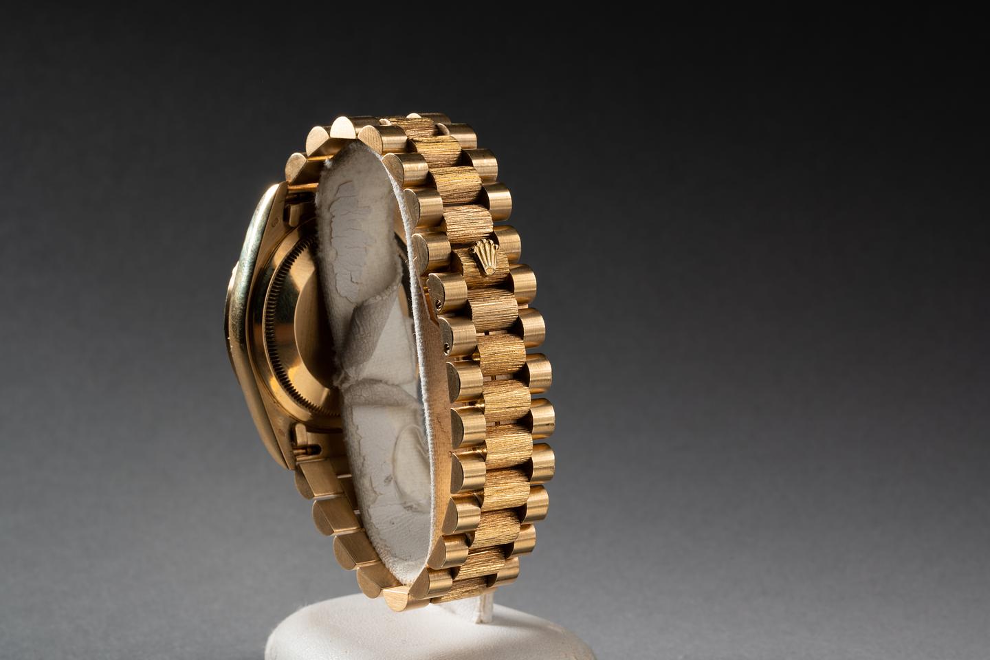 Bracelet: The 20 link 18K yellow gold President bark bracelet is excellent showing only very light stretch for its age. The clasp is stamped with a matching 1988 date code.