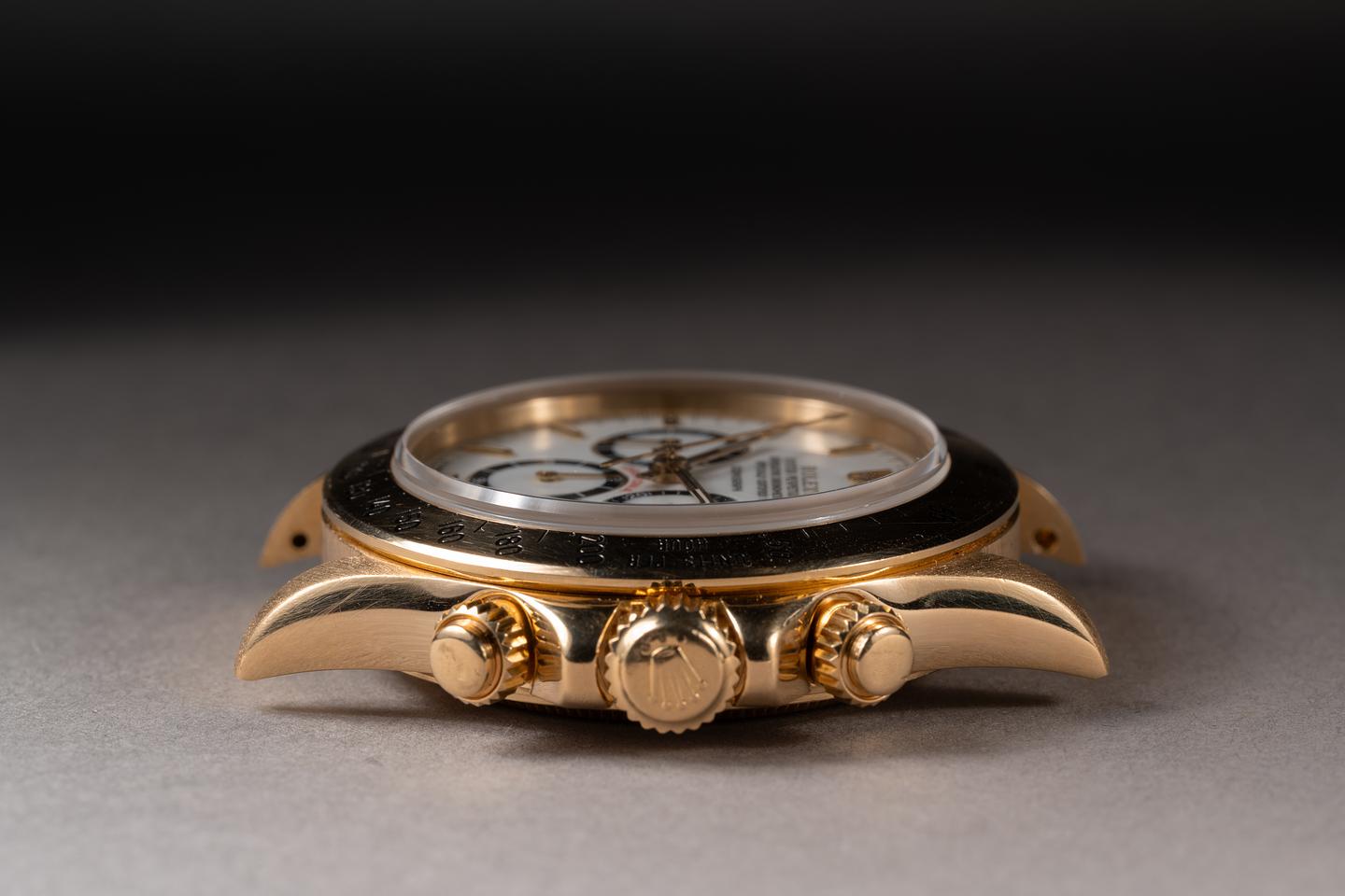 Case: The previously polished 18k yellow gold case is excellent showing only light wear from use. The 18k yellow gold bezel is also in excellent condition showing only light wear from use.
