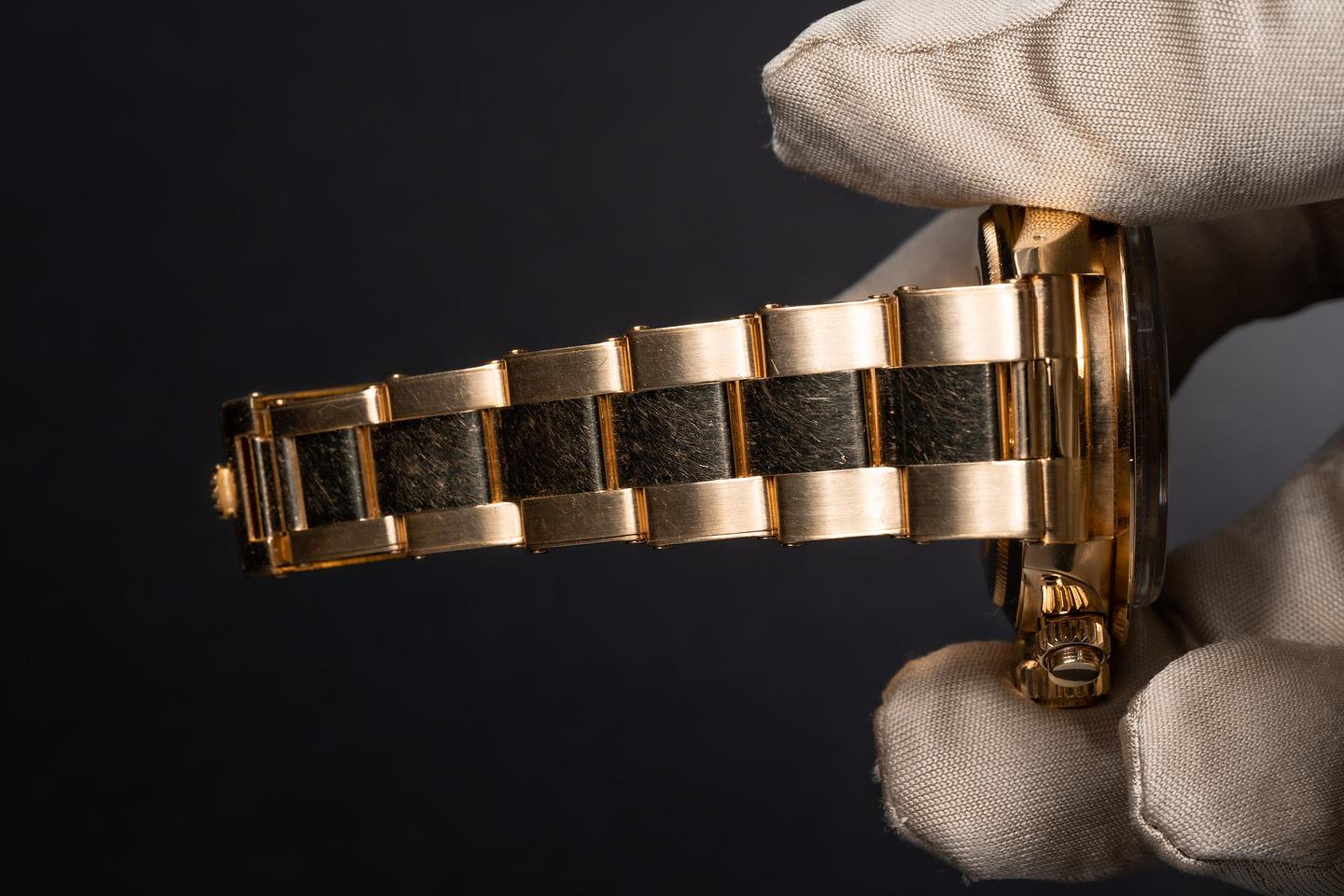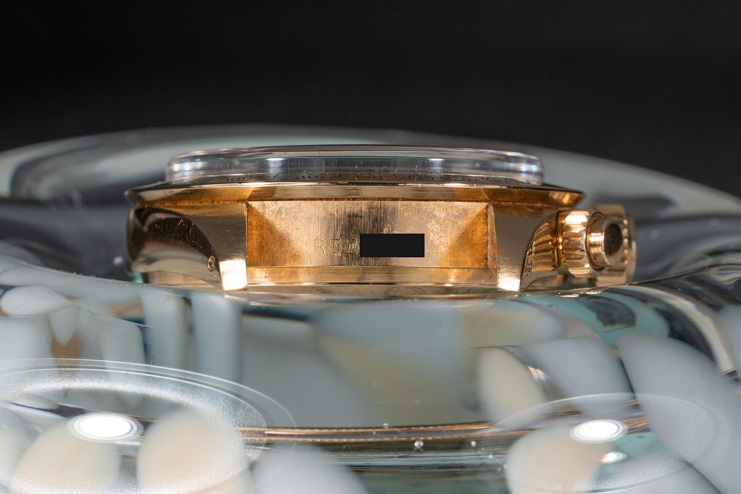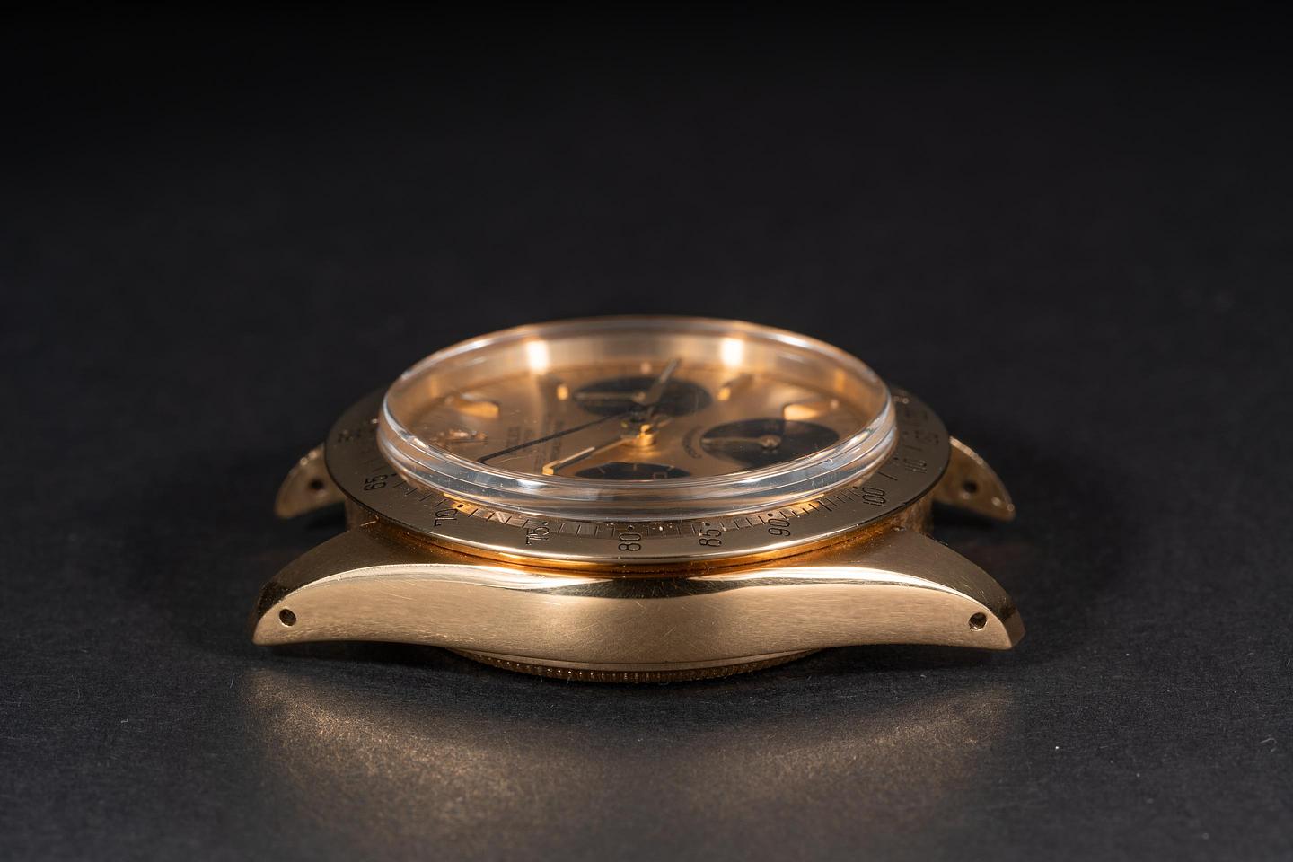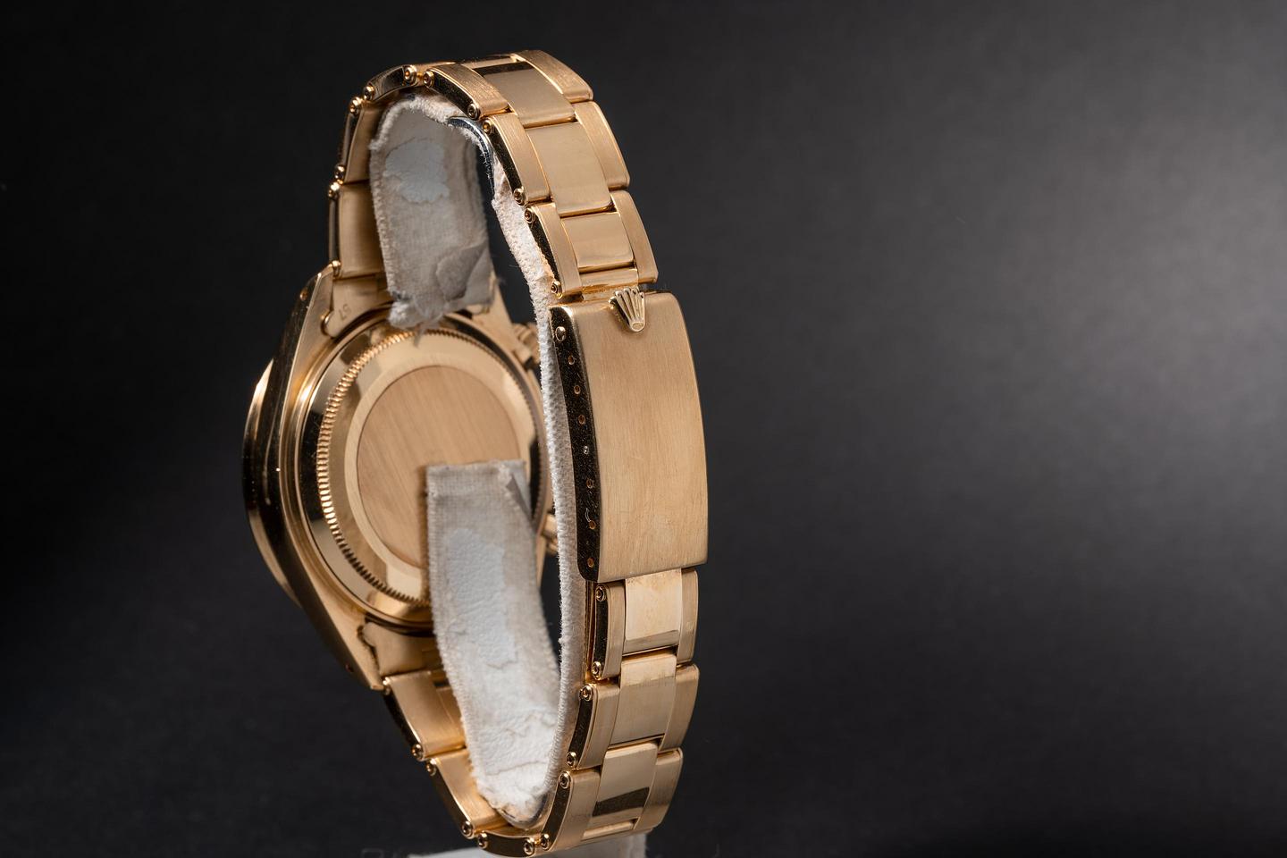 Case: The thick and even 18k yellow gold case is excellent showing only light wear from use. The 18k yellow gold bezel is also in excellent condition showing only light wear from use.