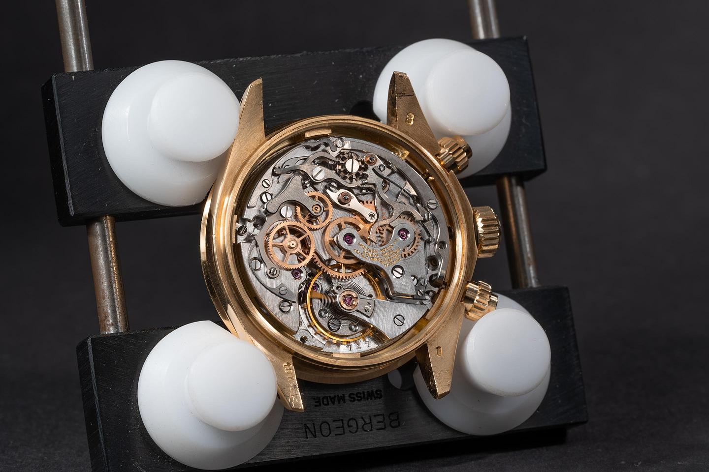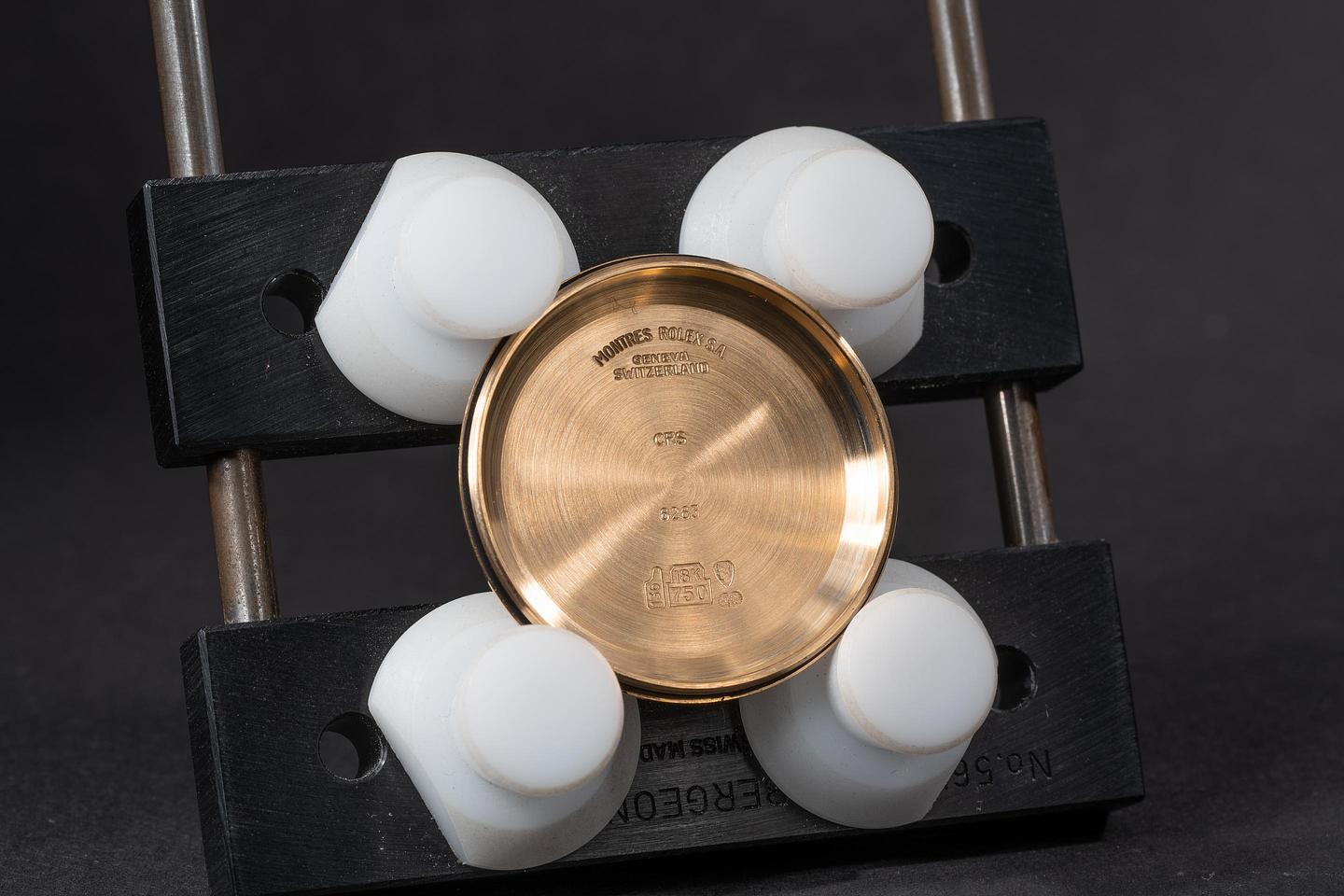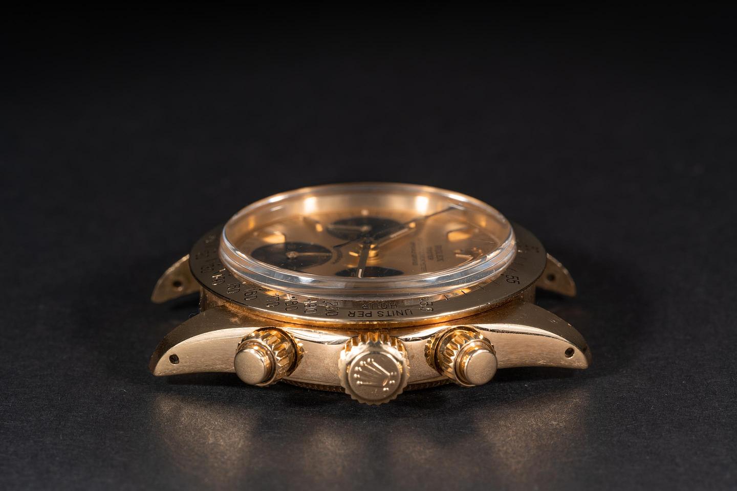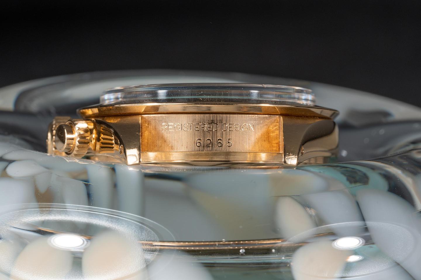 Case: The thick and even 18k yellow gold case is excellent showing only light wear from use. The 18k yellow gold bezel is also in excellent condition showing only light wear from use.