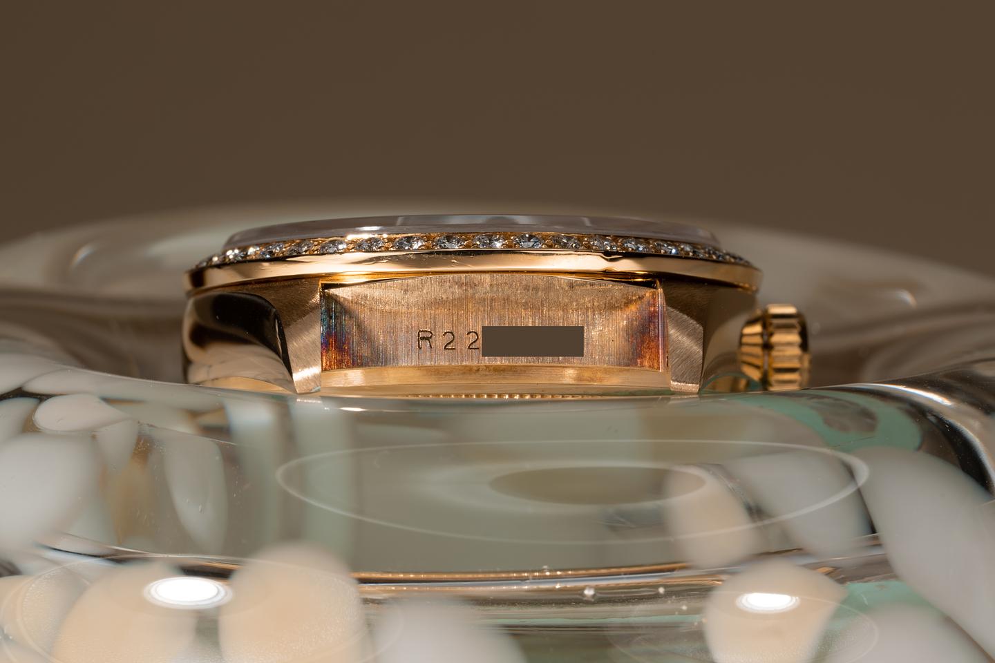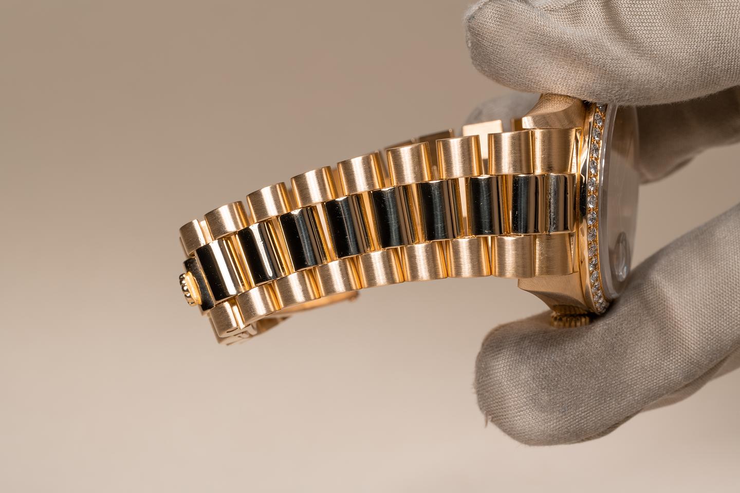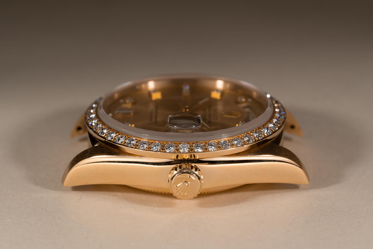 Case: The recently polished 18k yellow gold case is excellent showing only very light wear from use. The 18k yellow gold and diamond bezel is also in excellent condition showing only very light wear from use.
