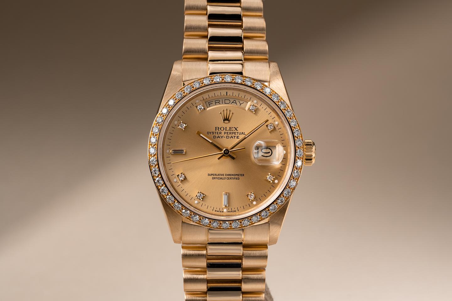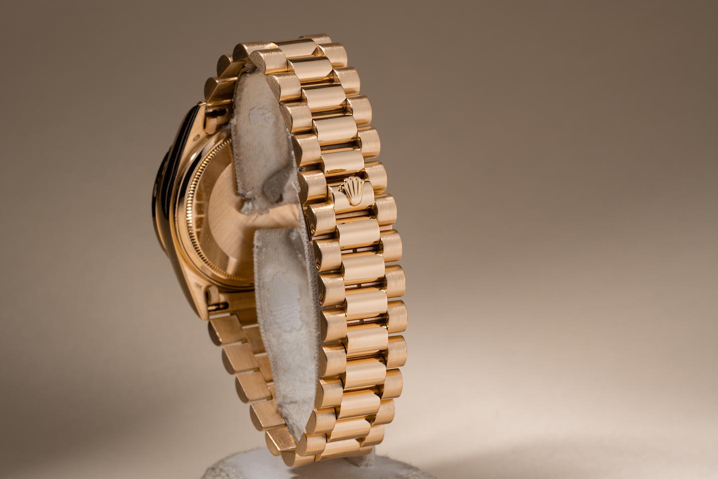 Bracelet: The 22 link 18k yellow gold president bracelet is excellent showing average stretch for its age. The clasp is stamped with a matching 1988 date code.