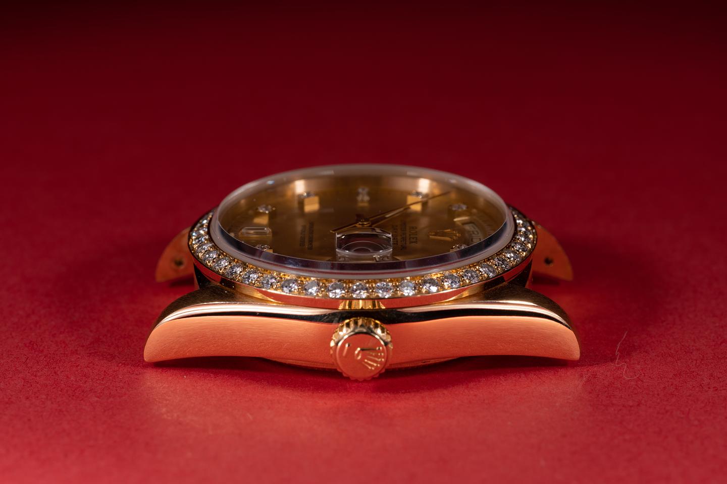 Notes: A beautiful Day-Date with a factory diamond bezel, a nearly flawless dial, and warm creamy plume plots.