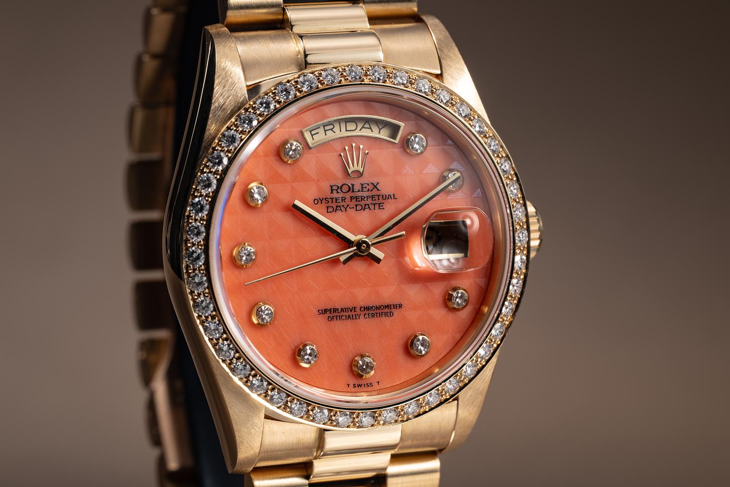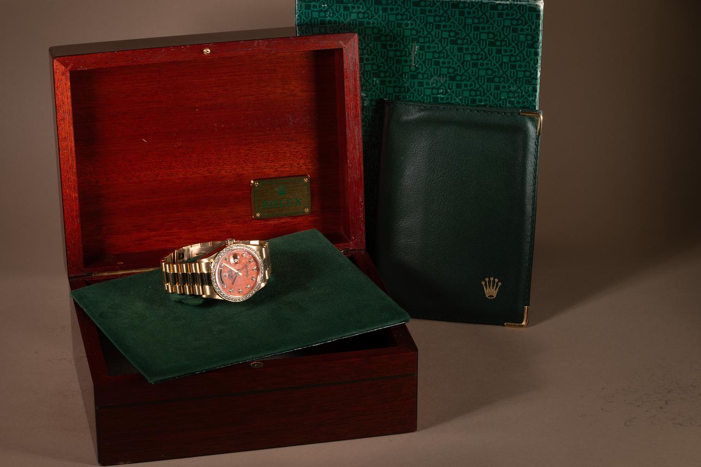 Accessories: Box, Papers, and Rolex Service Papers that note the extremely special Coral Pyramid Diamond Dial.