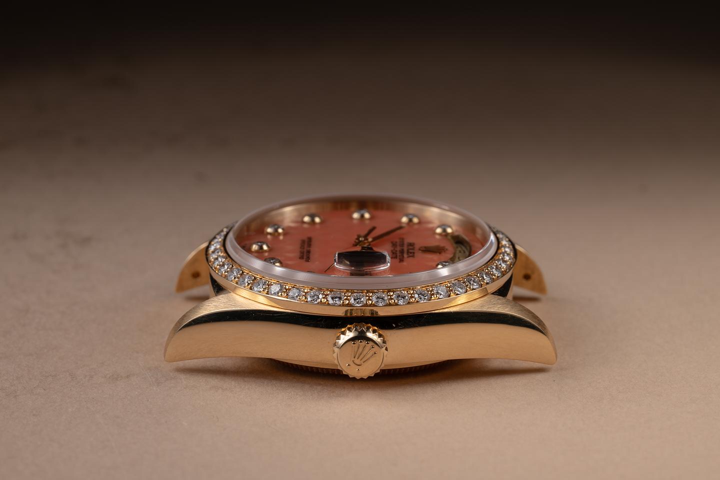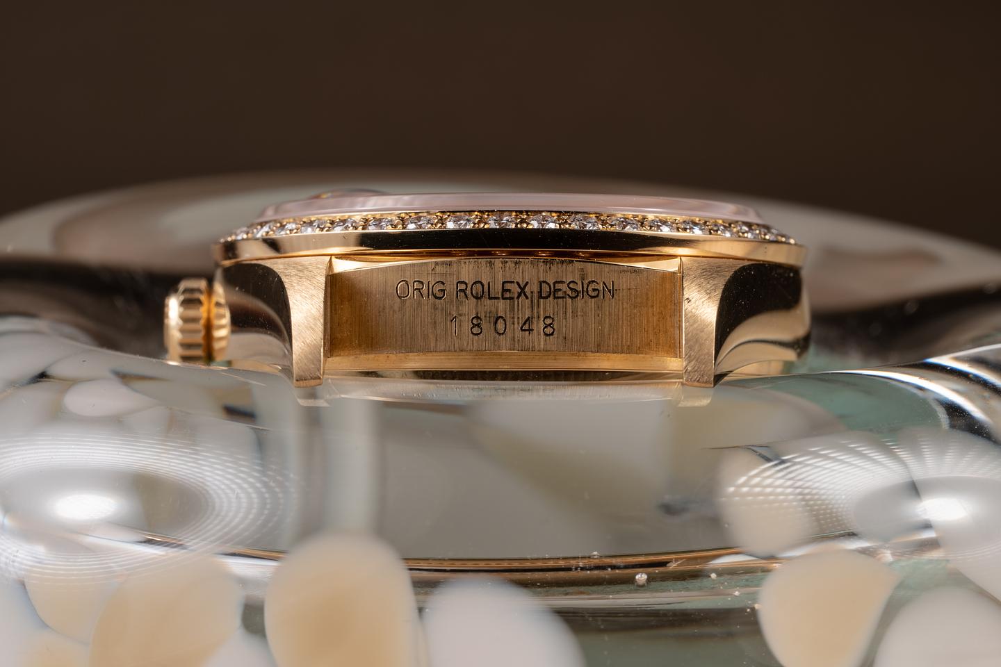 Case: The thick, sharp, and even 18K yellow gold case is excellent, showing only extremely light wear. The 18K yellow gold & diamond bezel insert is also in excellent condition, showing only very light wear from use.