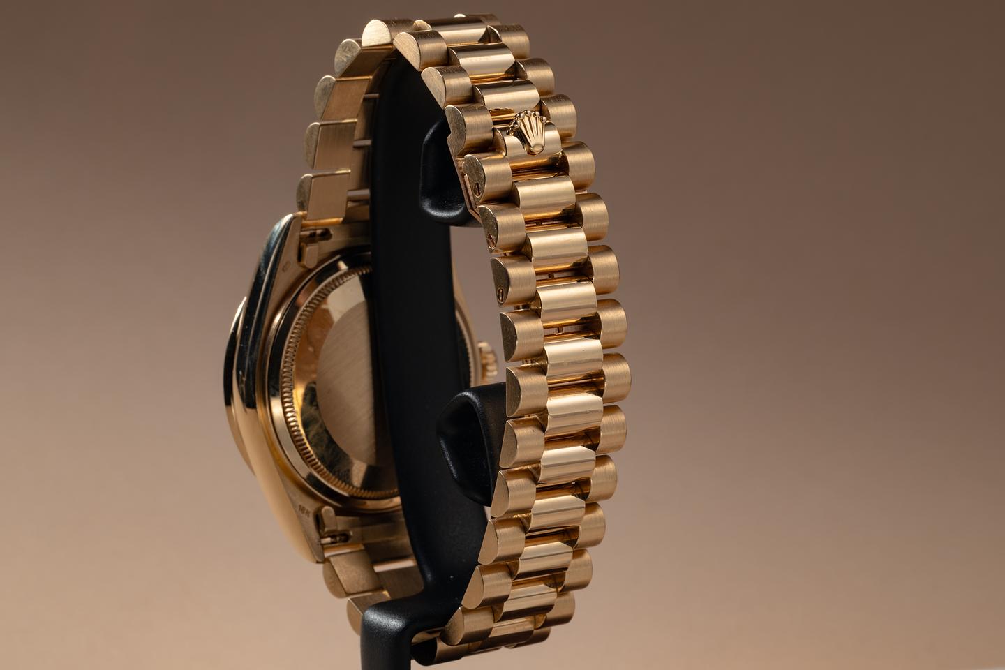 Bracelet: The 22-link 18K yellow gold President bracelet is excelent showing only extremely light stretch for its age.