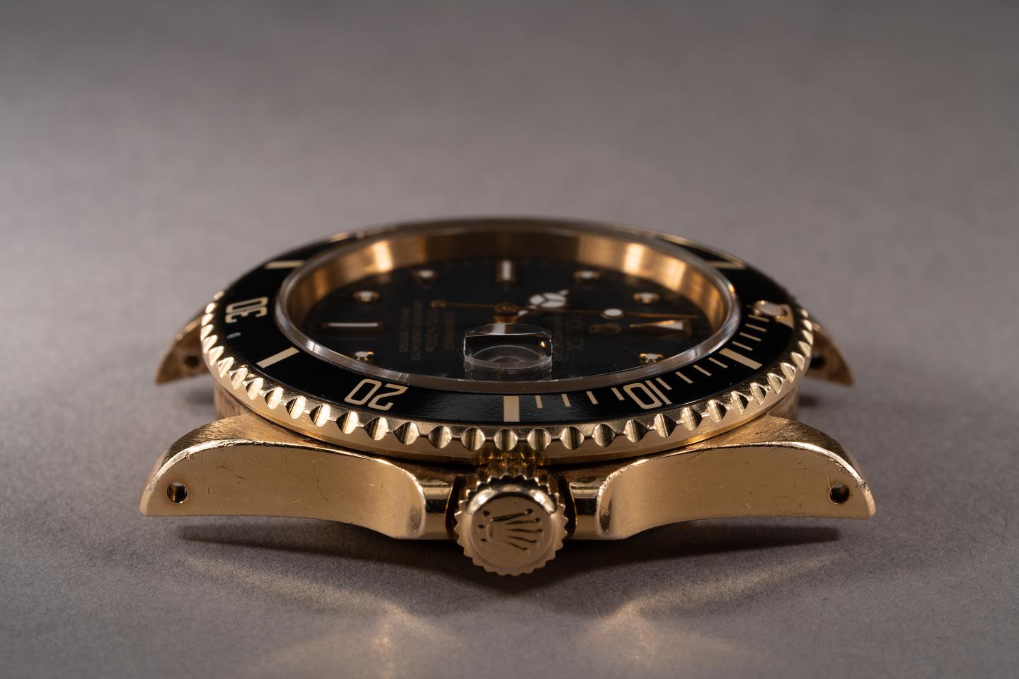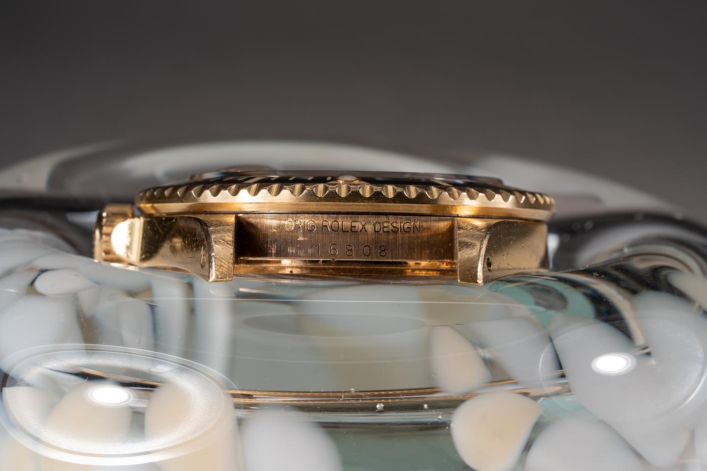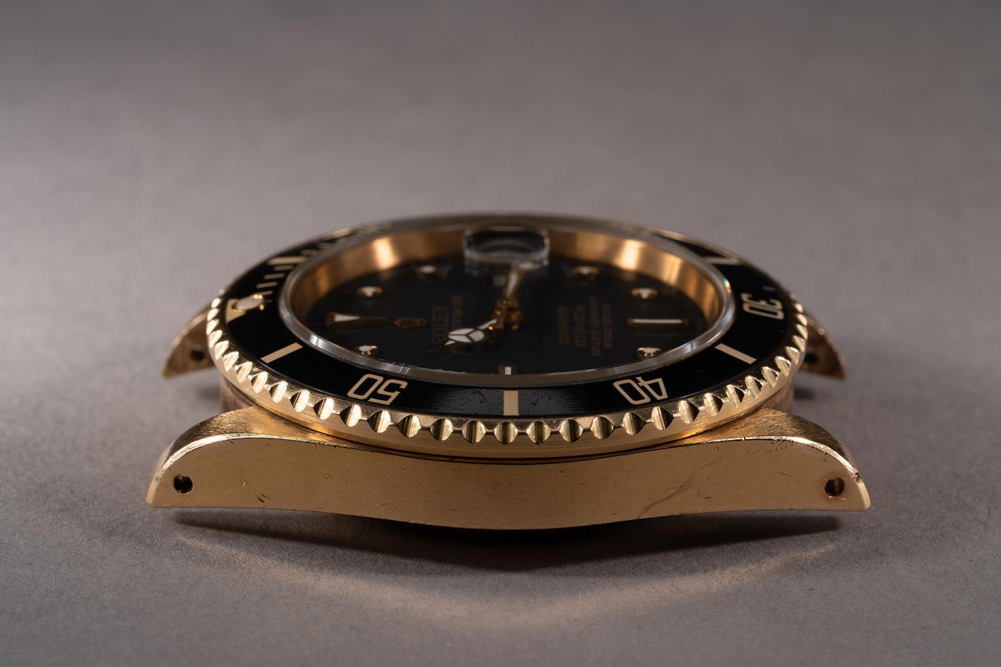 Case: The Thick and even 18k yellow gold case appears to be unpolished showing some light wear from use. The black bezel insert is also in excellent condition showing only light wear from use.
