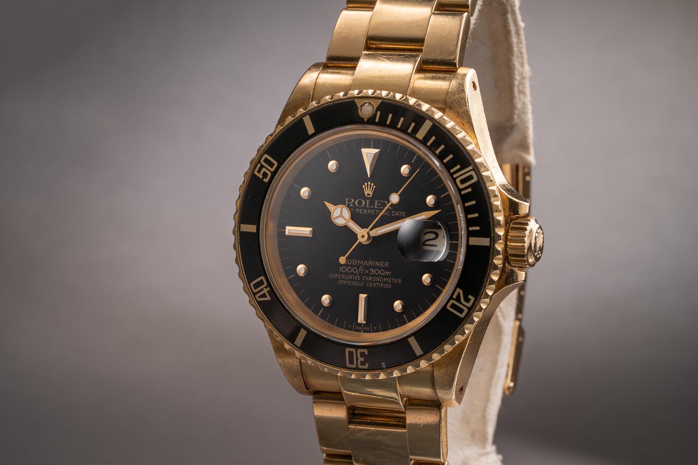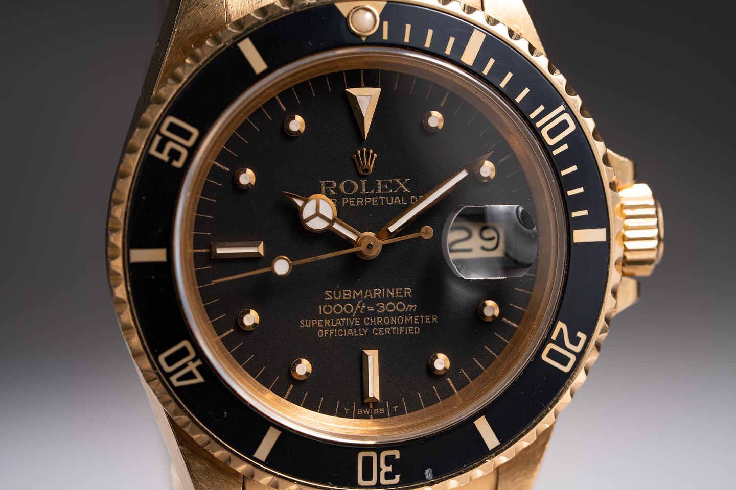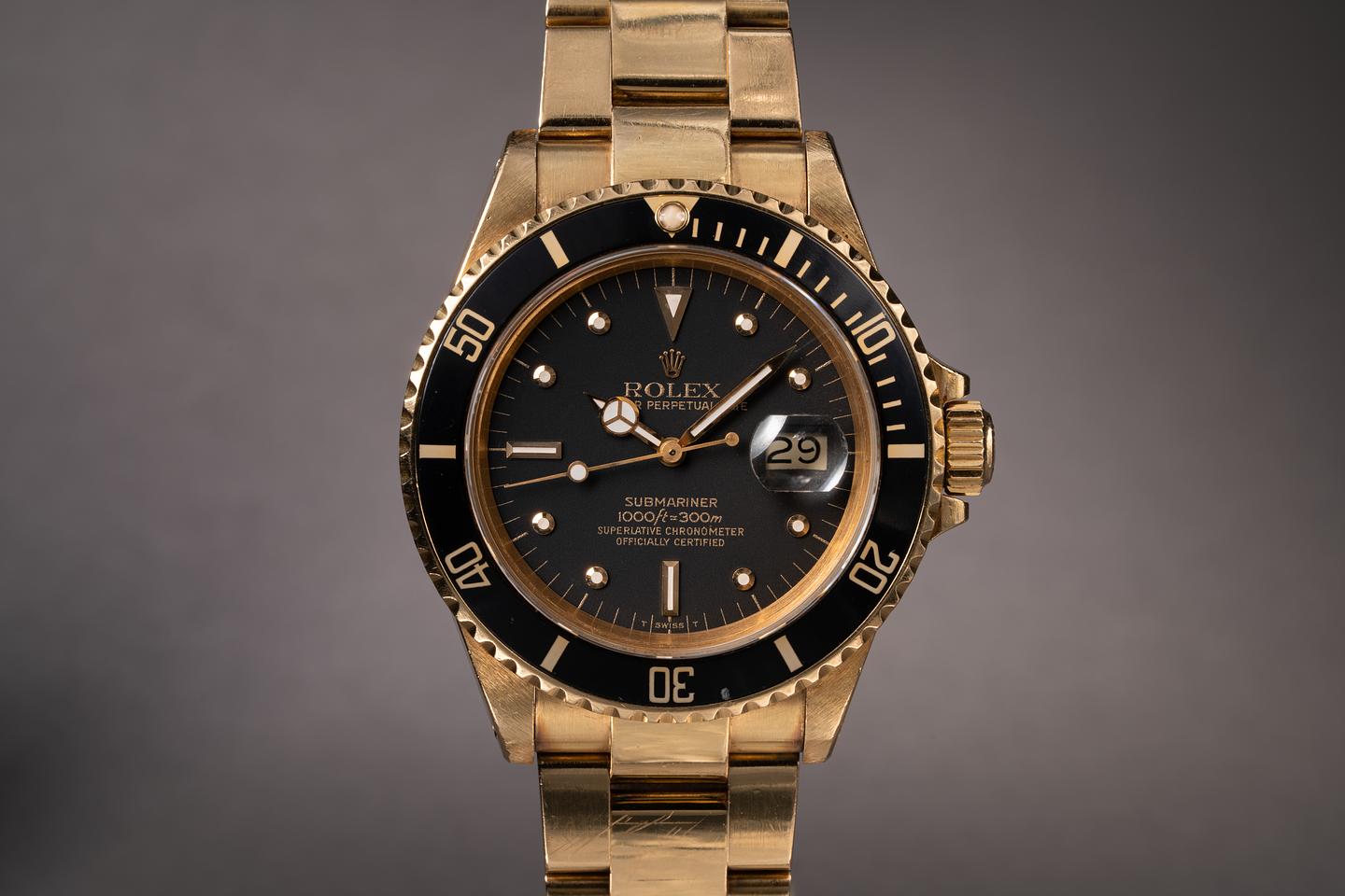 Case: The Thick and even 18k yellow gold case appears to be unpolished showing some light wear from use. The black bezel insert is also in excellent condition showing only light wear from use.