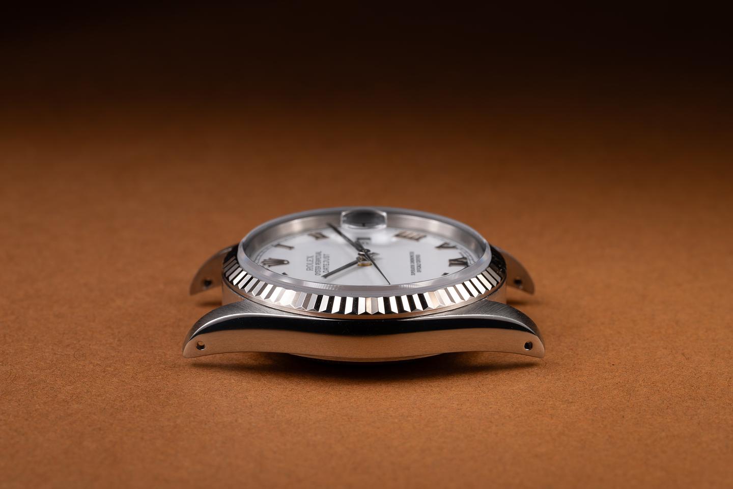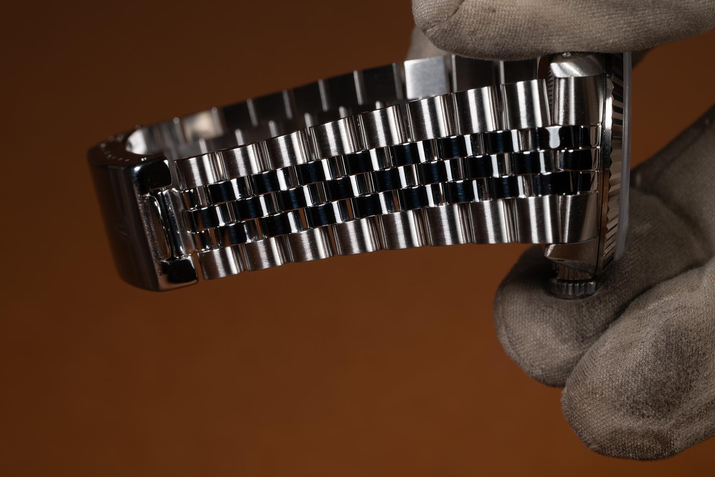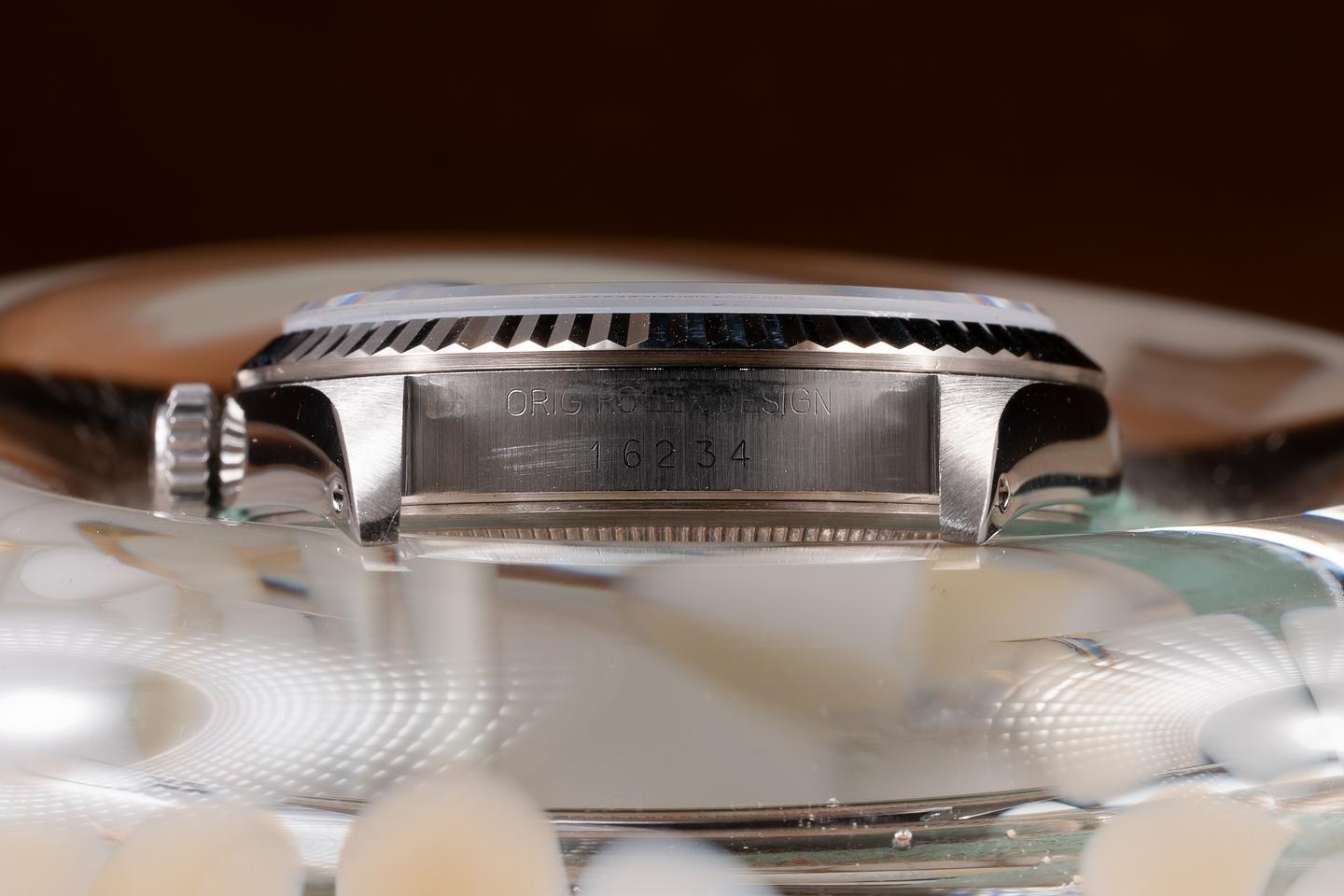 Case: The recently polished case is excellent, showing only extremely light wear. The recently polished 18K white gold fluted bezel is also in excellent condition, showing only extremely light wear.