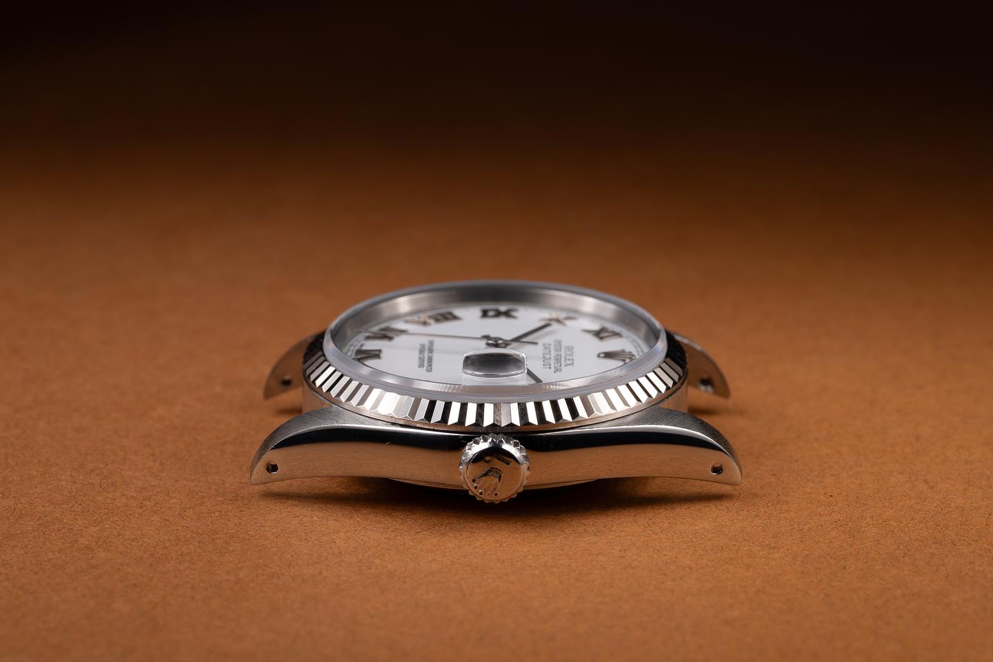 Dial: The white Roman numeral no-lume dial is excellent, showing no visible wear. The original factory hands are matching.