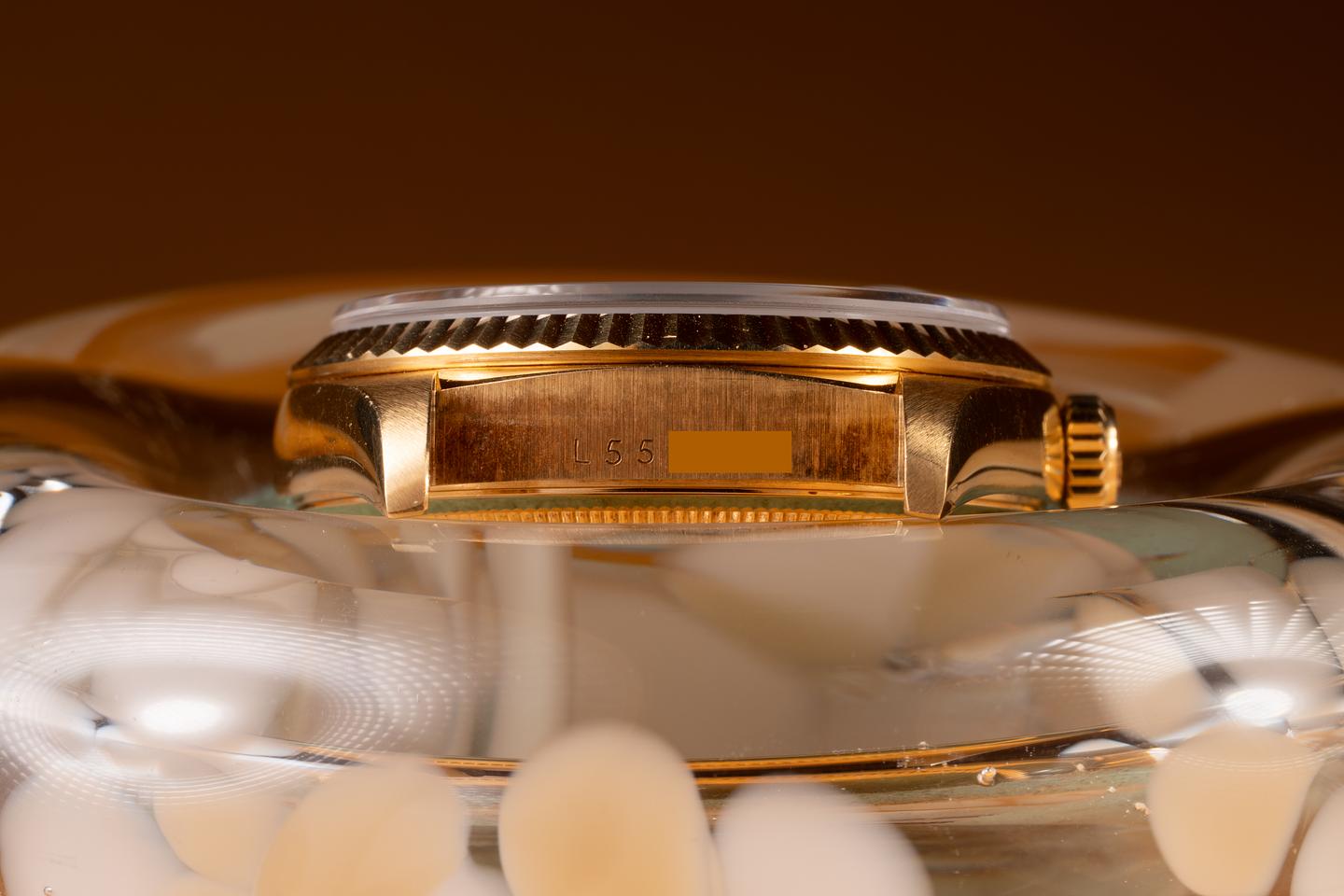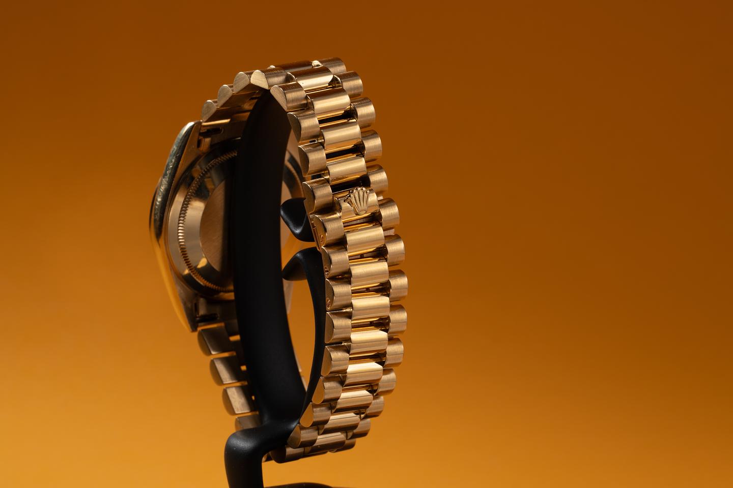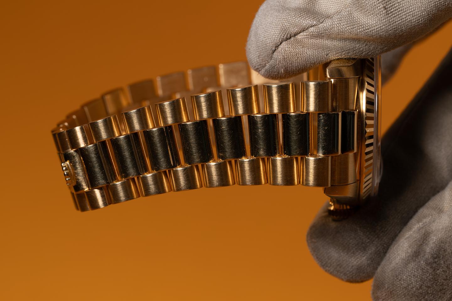Bracelet: The 22-link 18K yellow gold president bracelet is excellent, showing only very light stretch for its age.