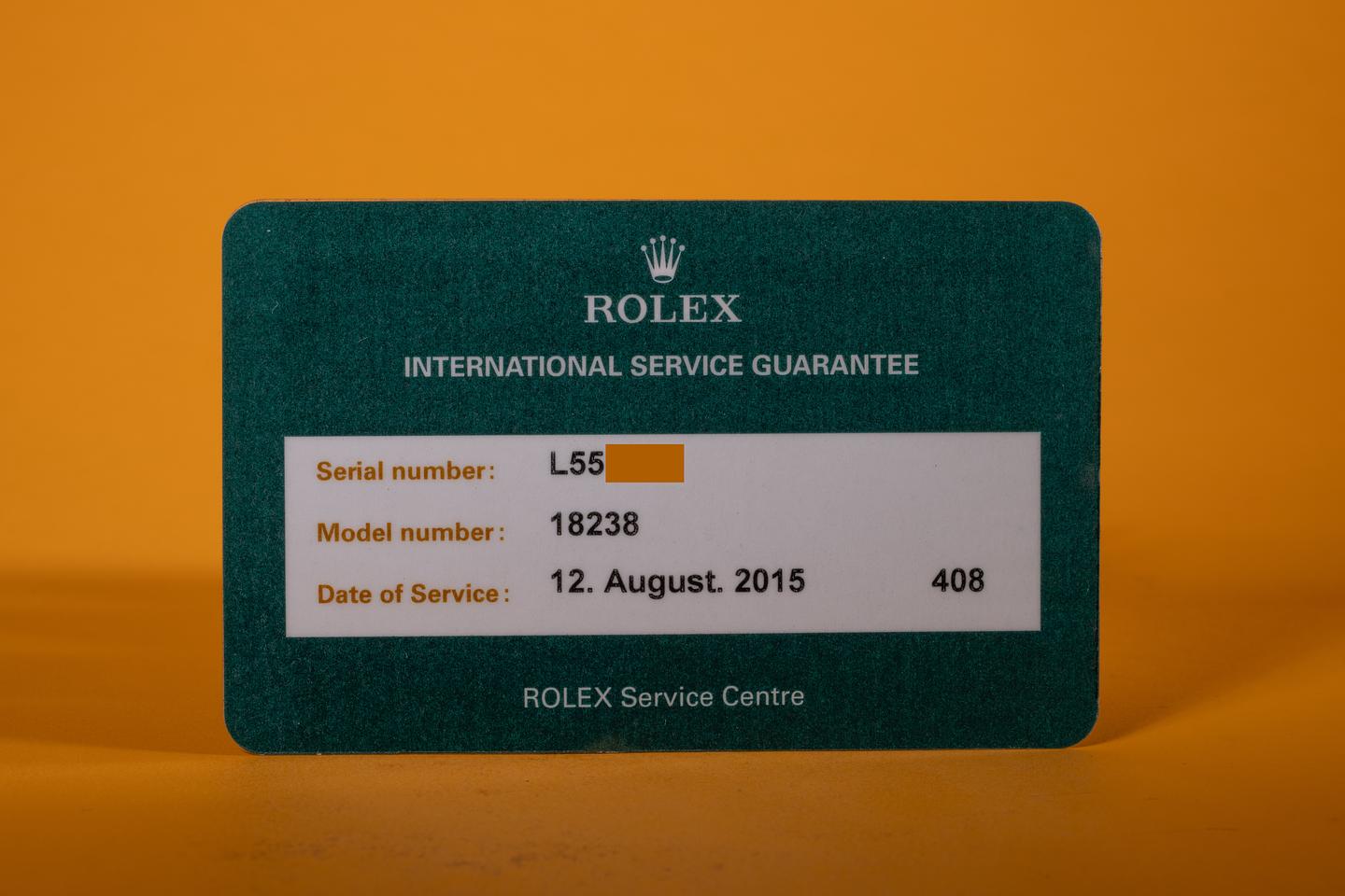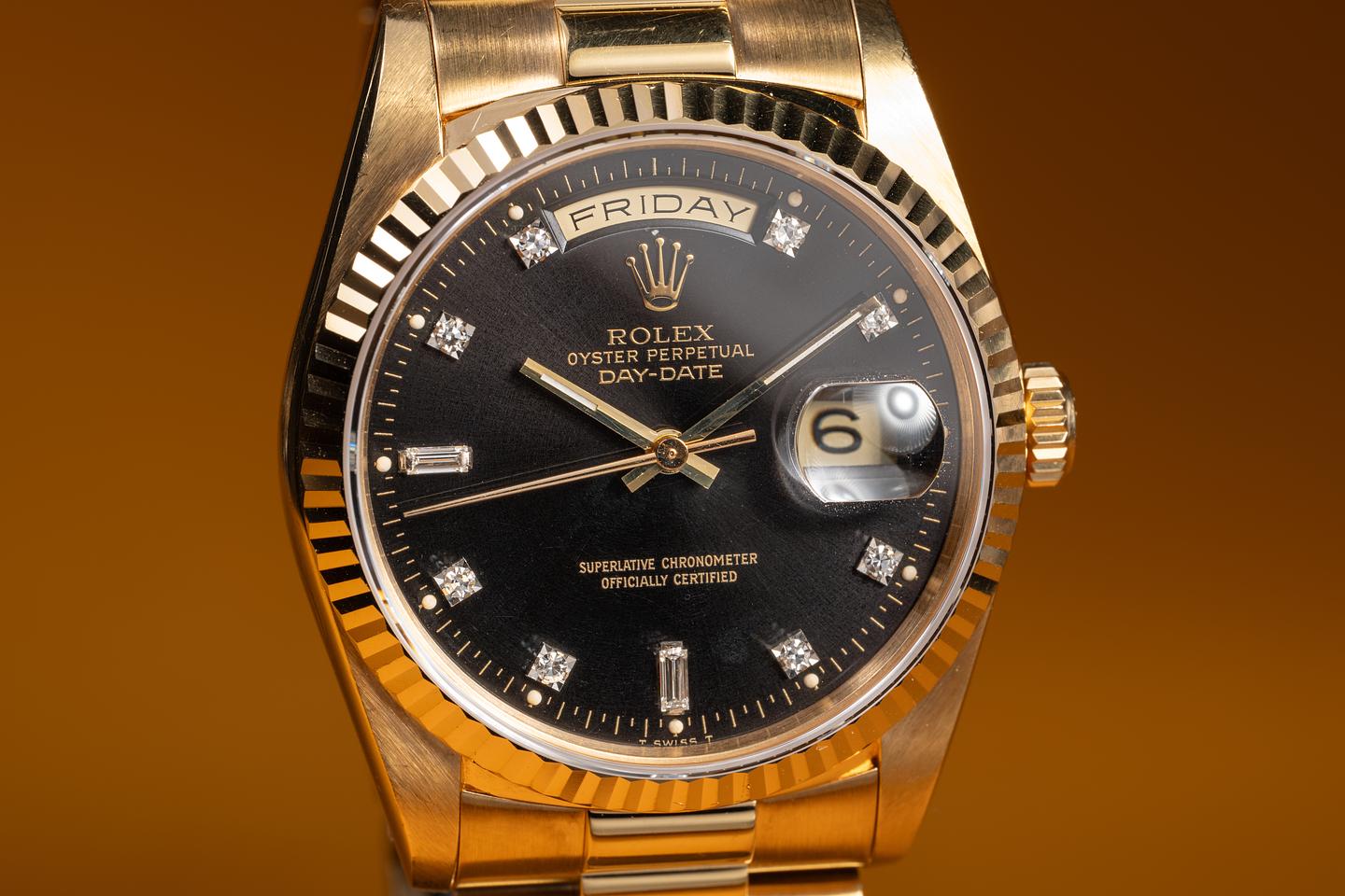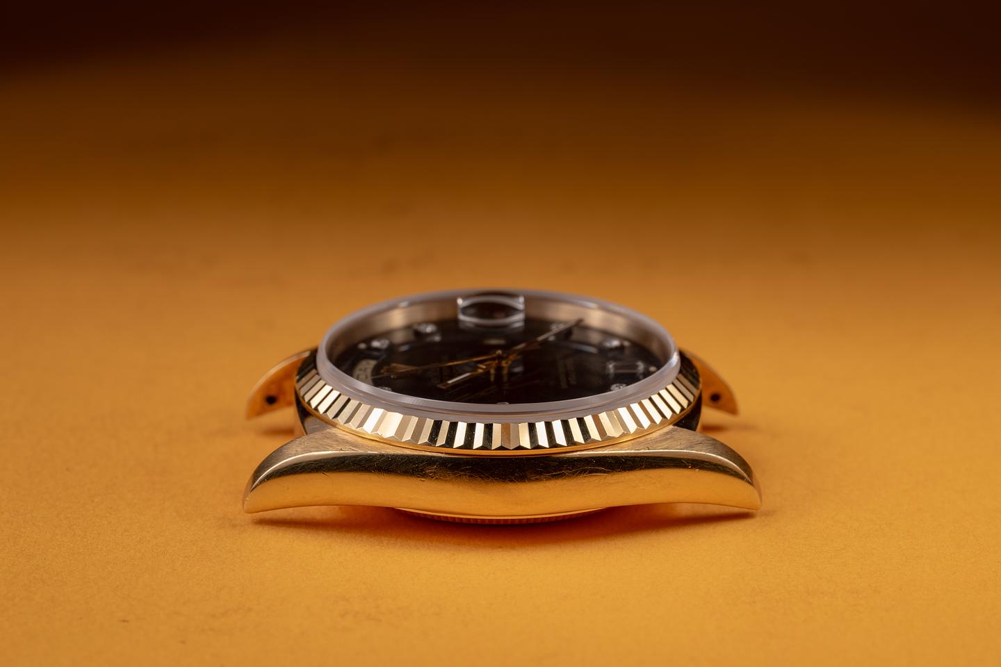 Bracelet: The 22-link 18K yellow gold president bracelet is excellent, showing only very light stretch for its age.