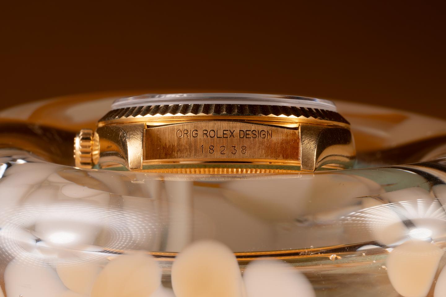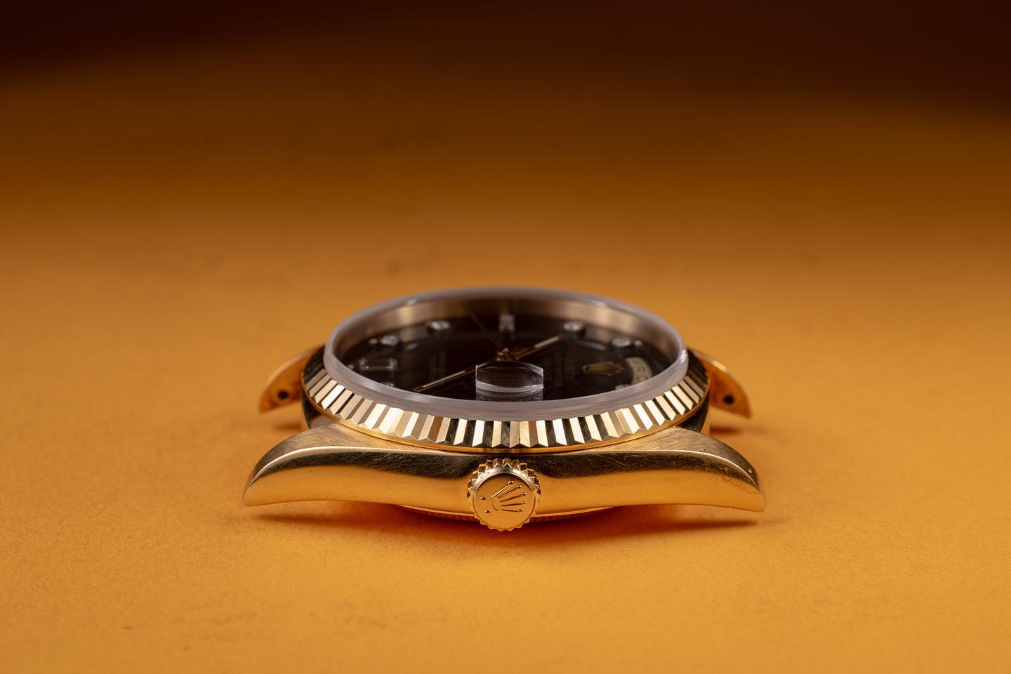 Case: The sharp 18K yellow gold case is excellent, showing only light wear from use. The sharp 18K yellow gold fluted bezel is also in excellent condition, showing only light wear from use.