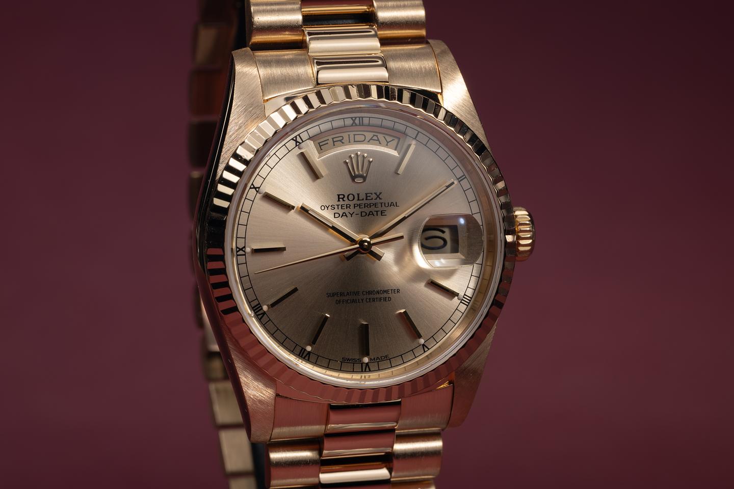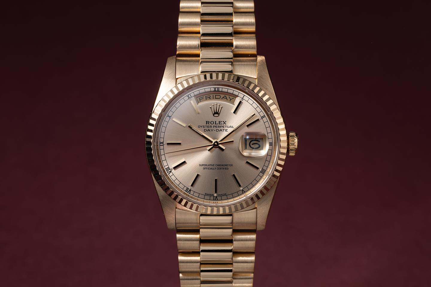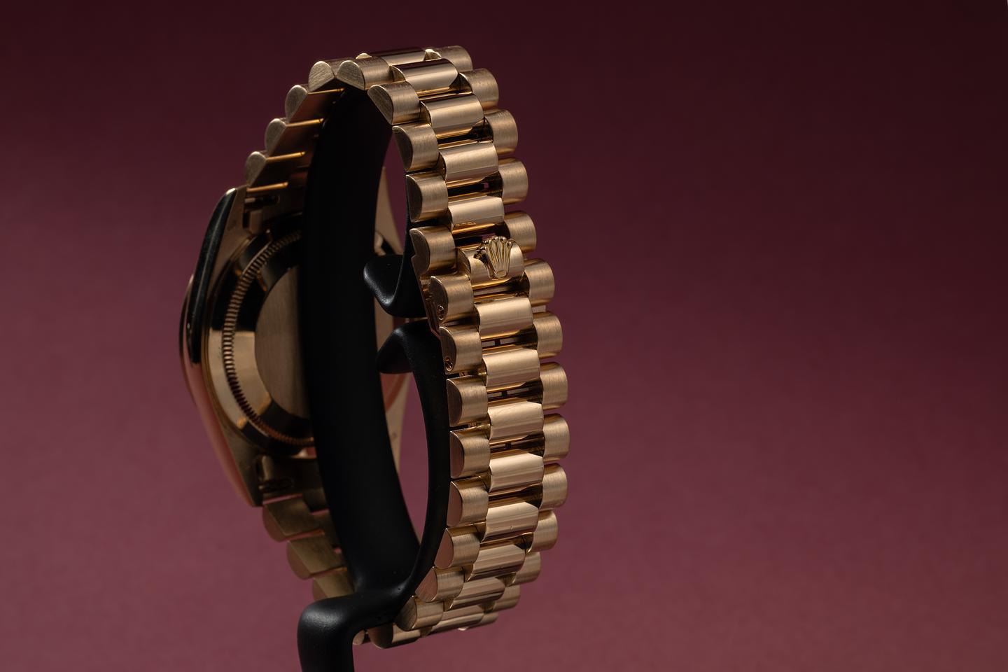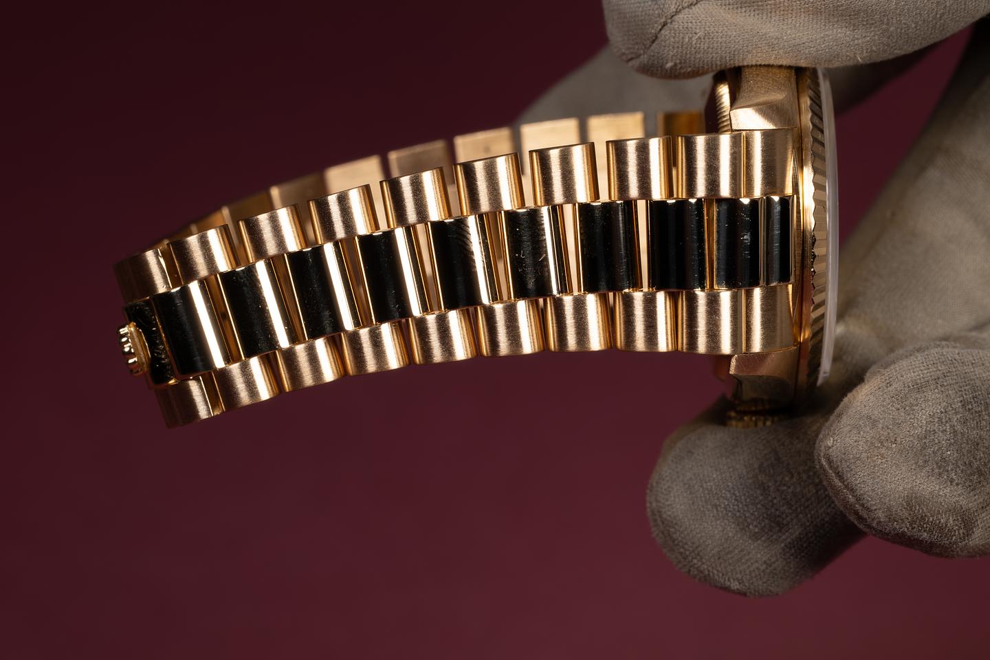 Bracelet: The 22-link 18K yellow gold president bracelet is excellent showing only very light stretch for its age.