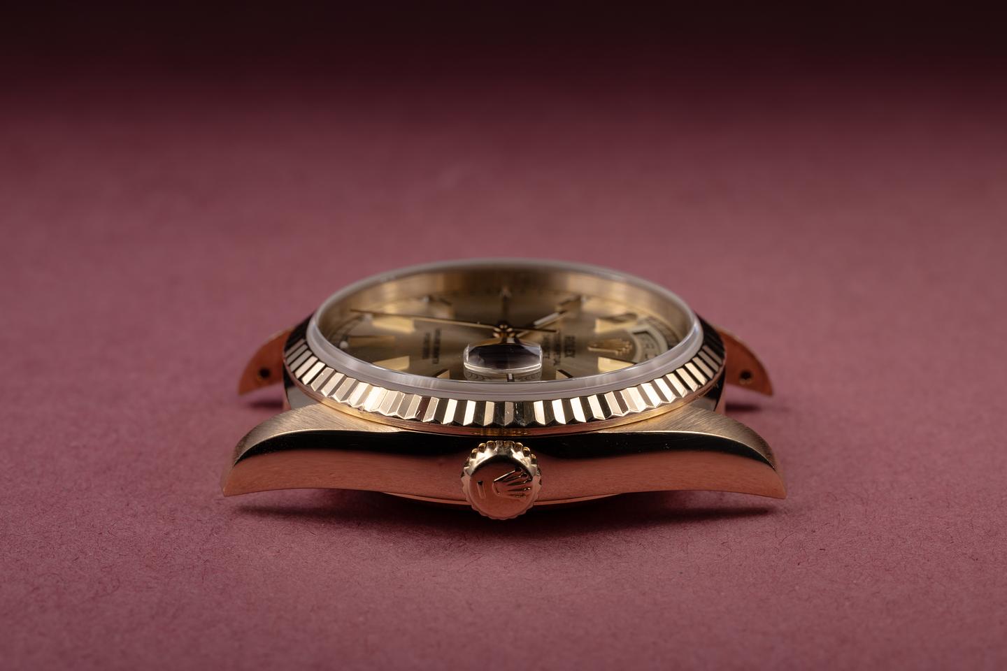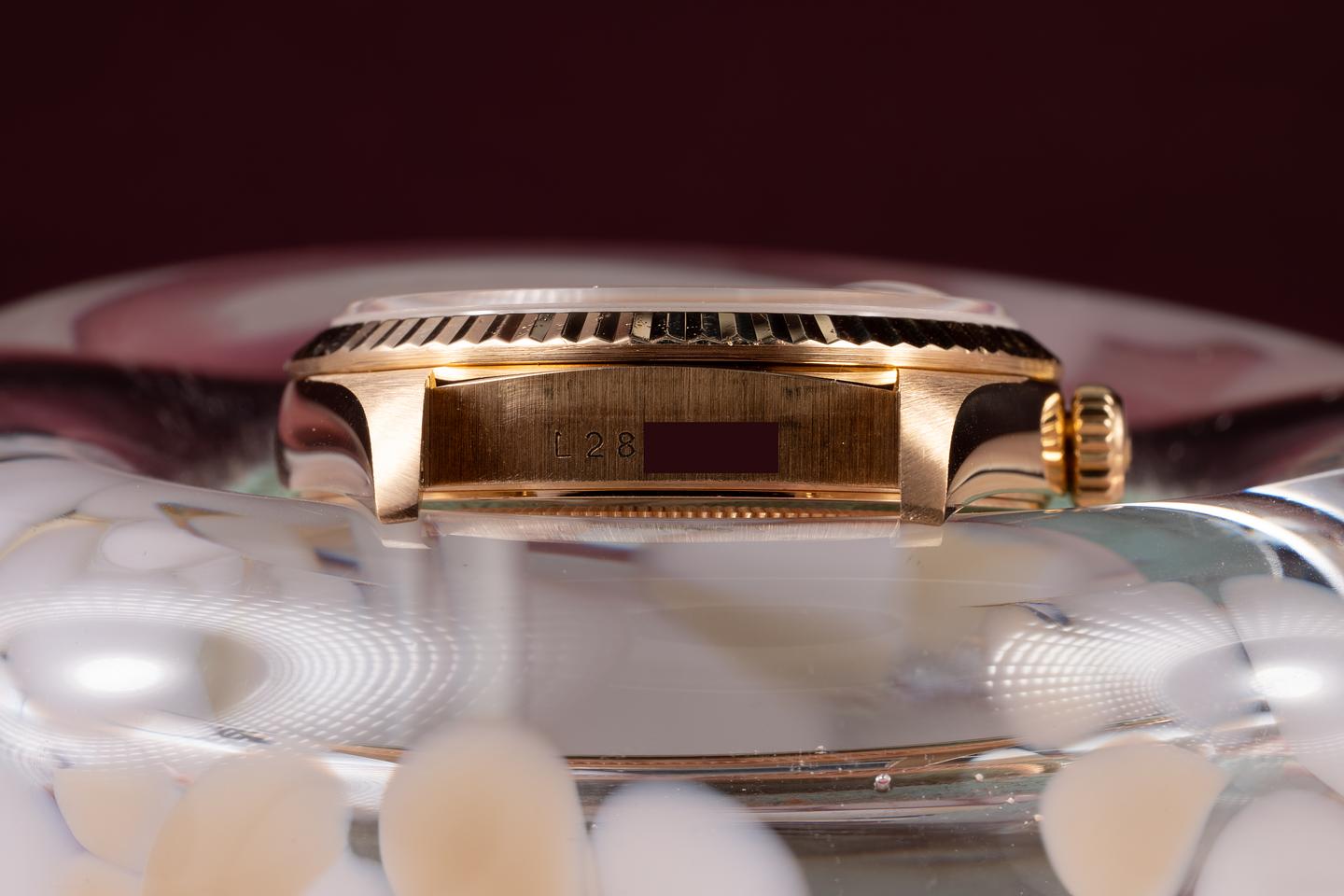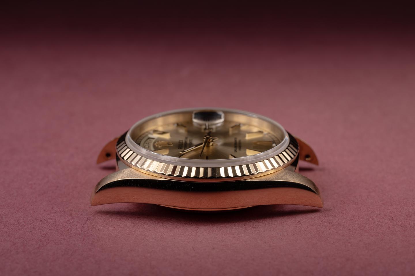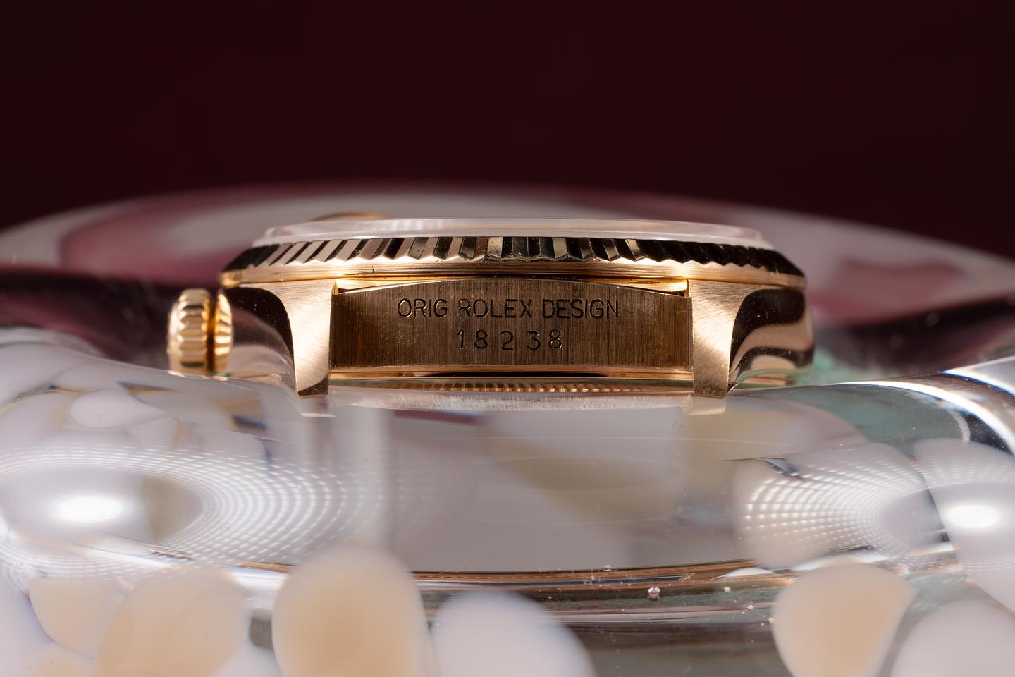 Case: The sharp 18K yellow gold case is excellent, showing only very light wear. The sharp 18K yellow gold fluted bezel is also in excellent condition, showing only very light wear.