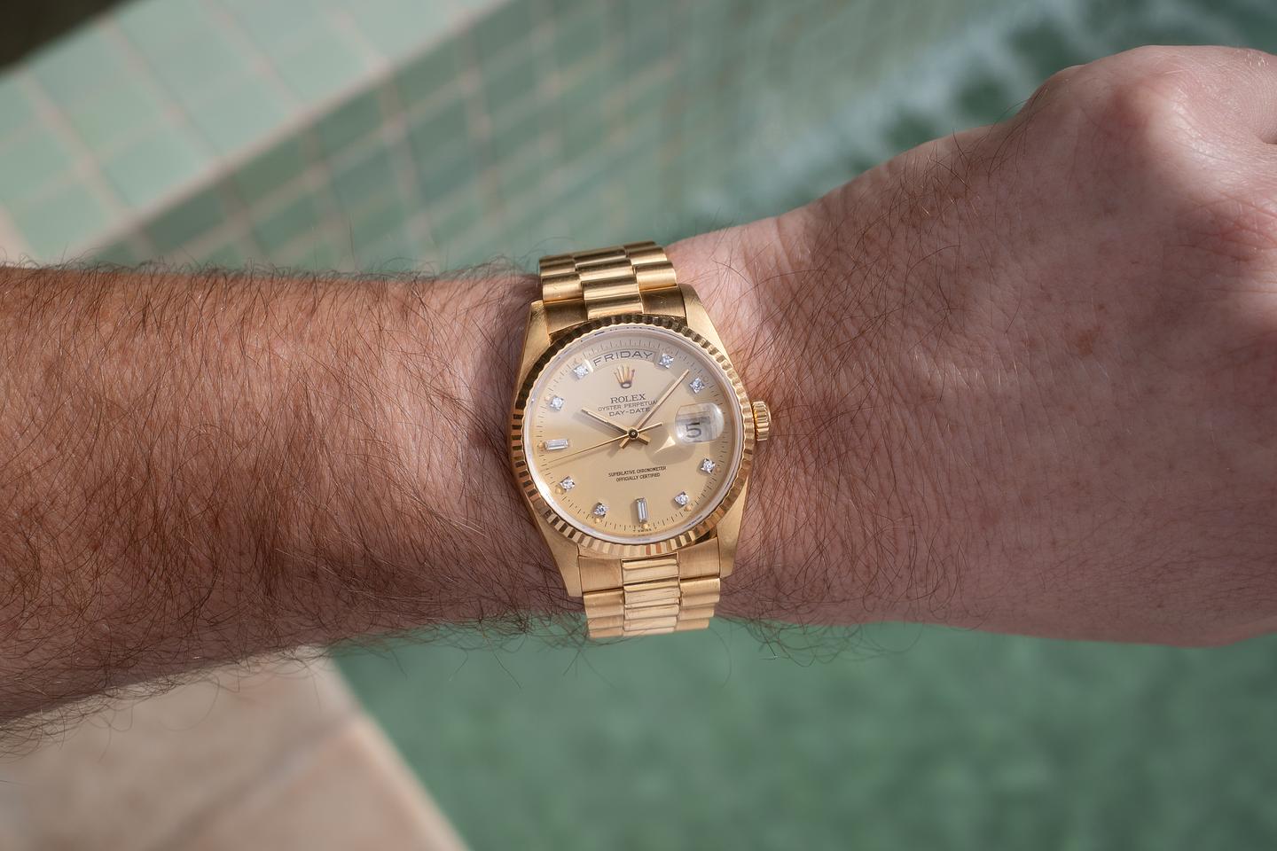 Bracelet: The 22-link 18K yellow gold president bracelet is excellent, showing only very light wear from use.