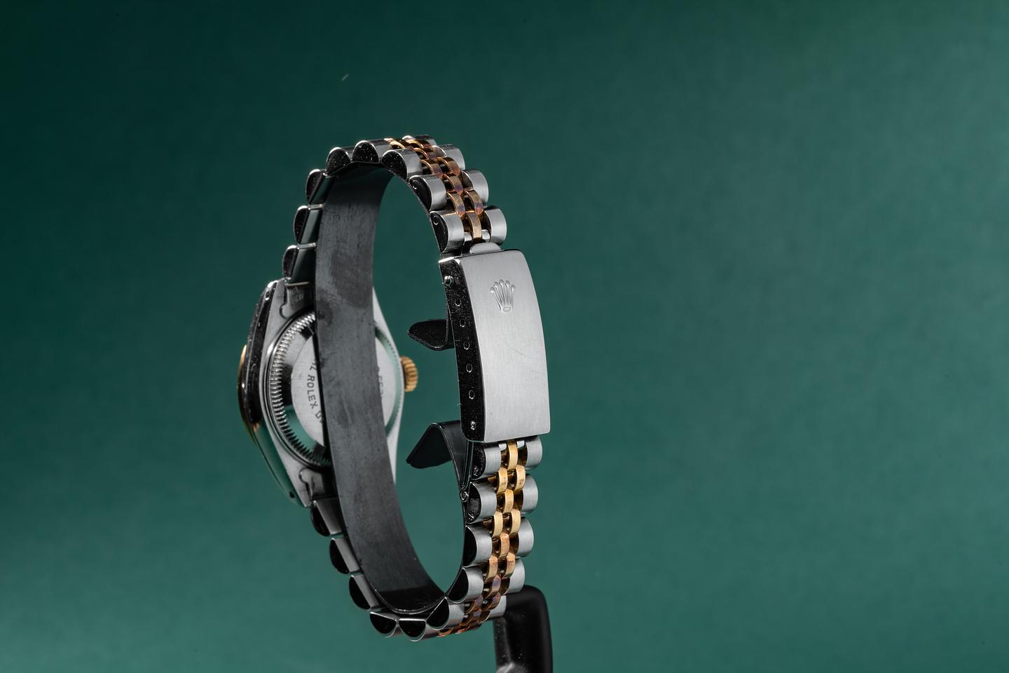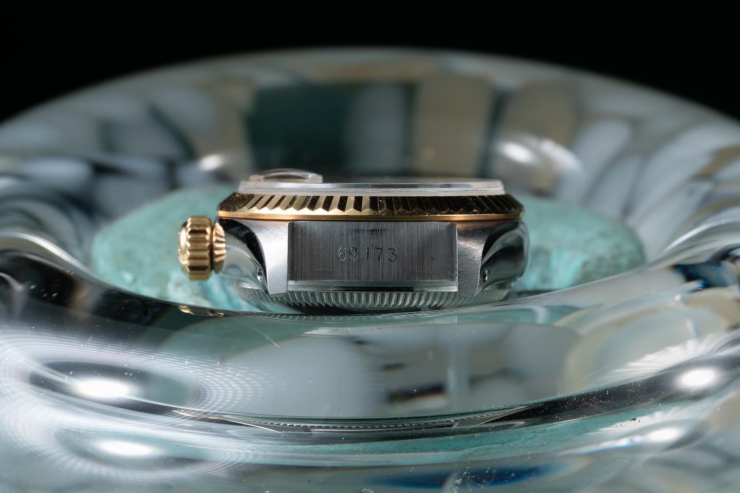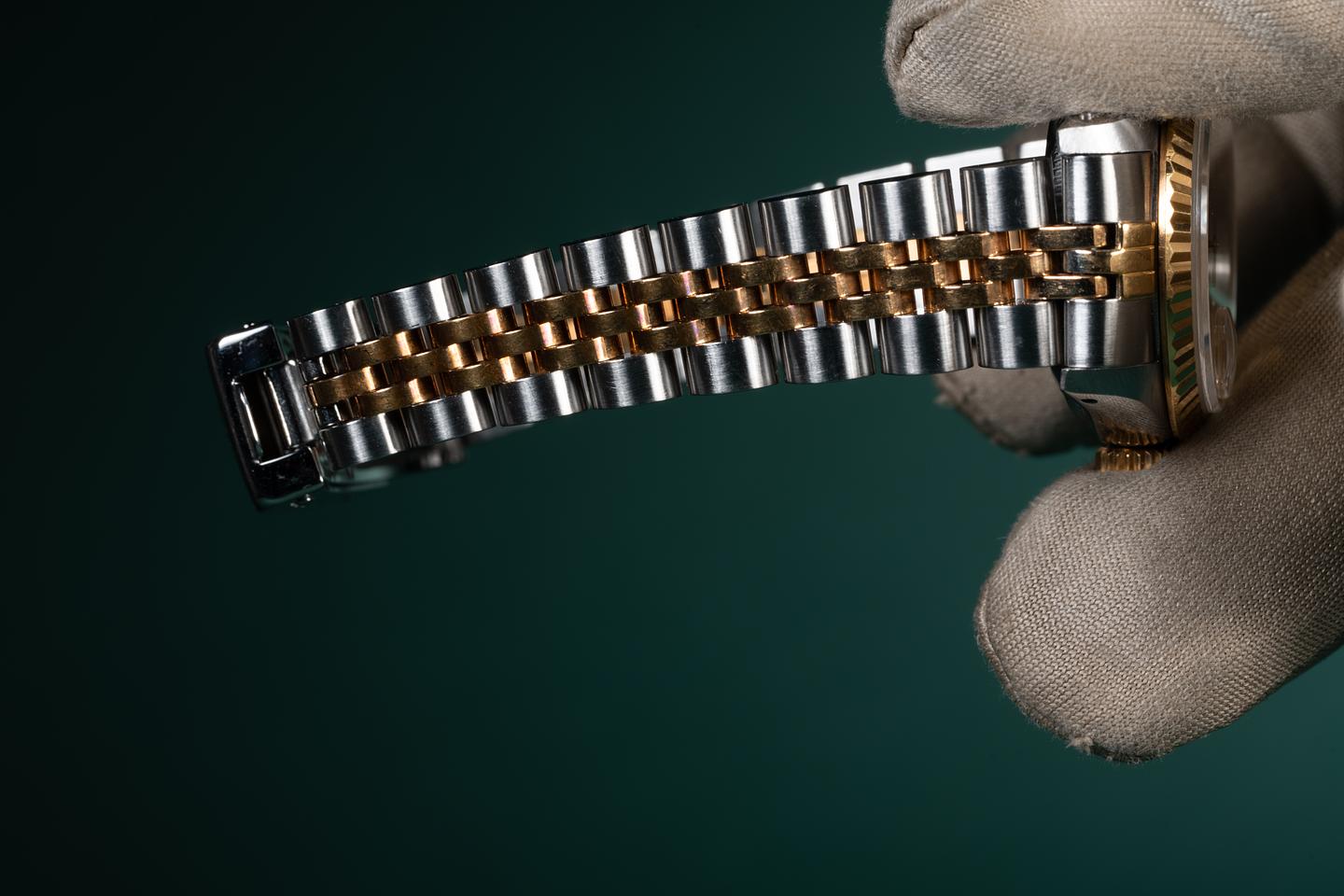 Bracelet: The 18 link two-tone ladies jubilee bracelet is excellent showing only very light stretch & warm rosy patina to the gold center-links. The clasp is stamped with a matching 1988 date code. The bracelet will fit up to a 15.3 cm. / 6.02" wrist.