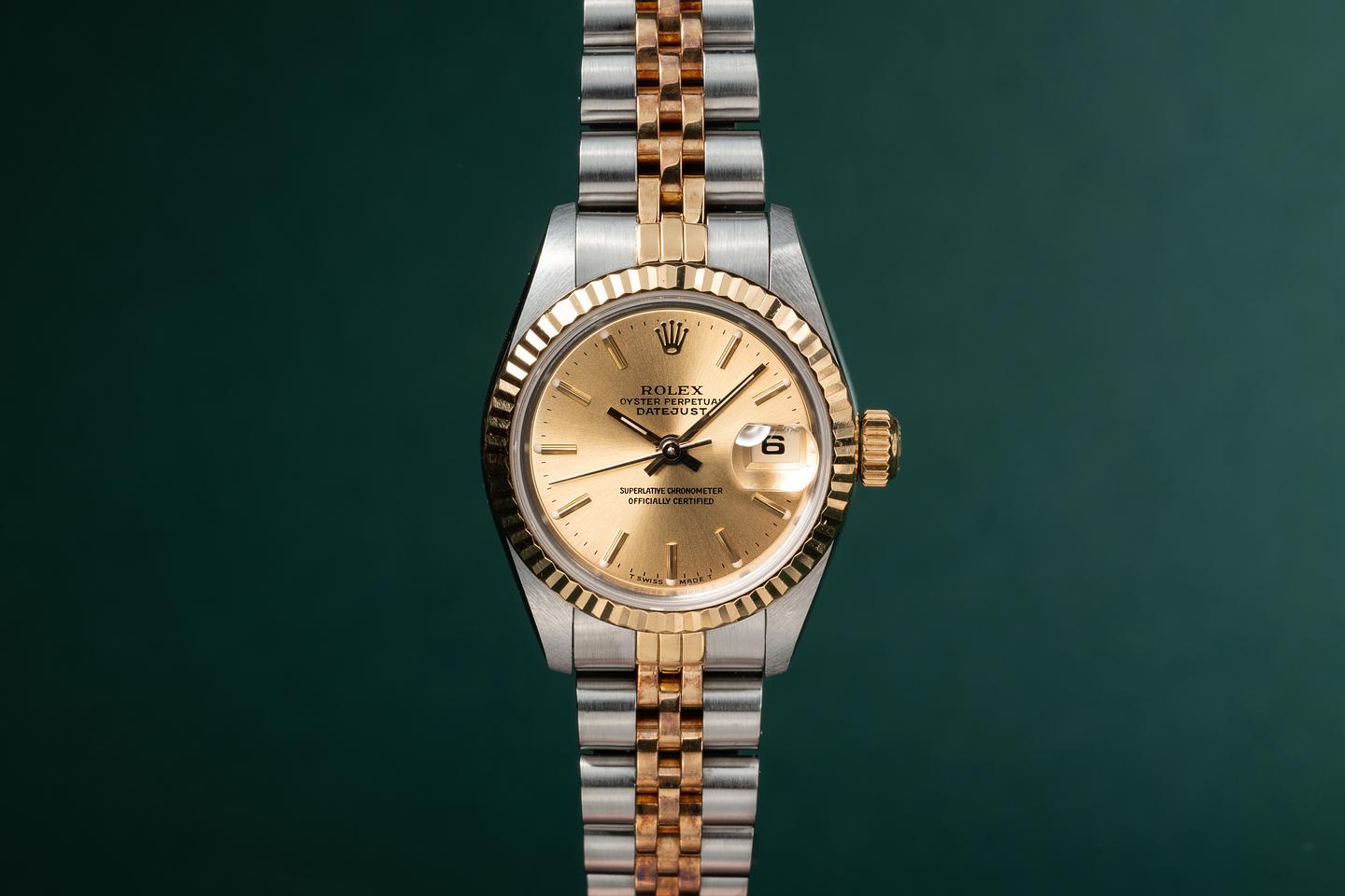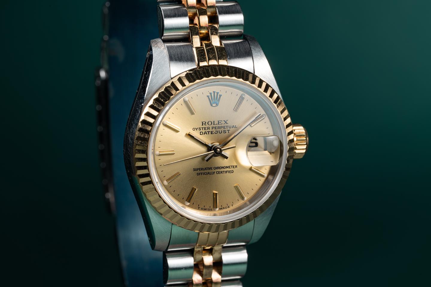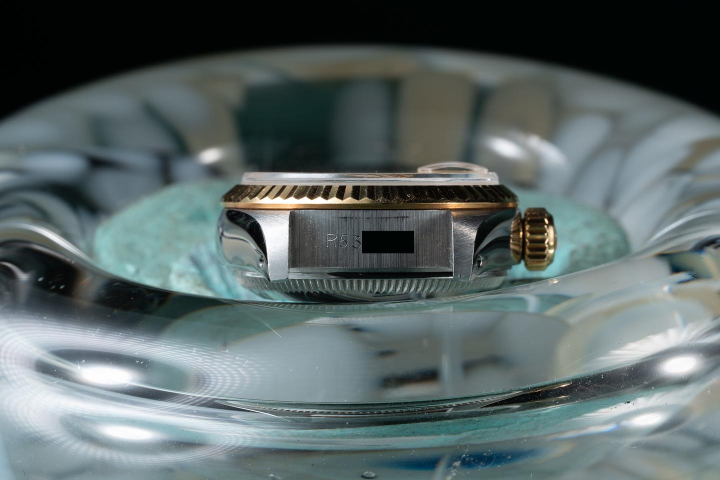 Bracelet: The 18 link two-tone ladies jubilee bracelet is excellent showing only very light stretch & warm rosy patina to the gold center-links. The clasp is stamped with a matching 1988 date code. The bracelet will fit up to a 15.3 cm. / 6.02" wrist.