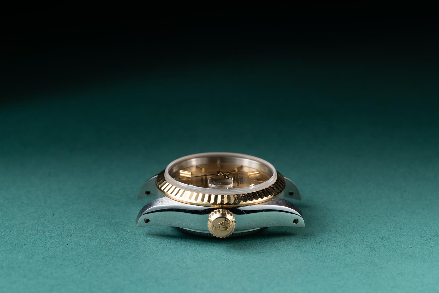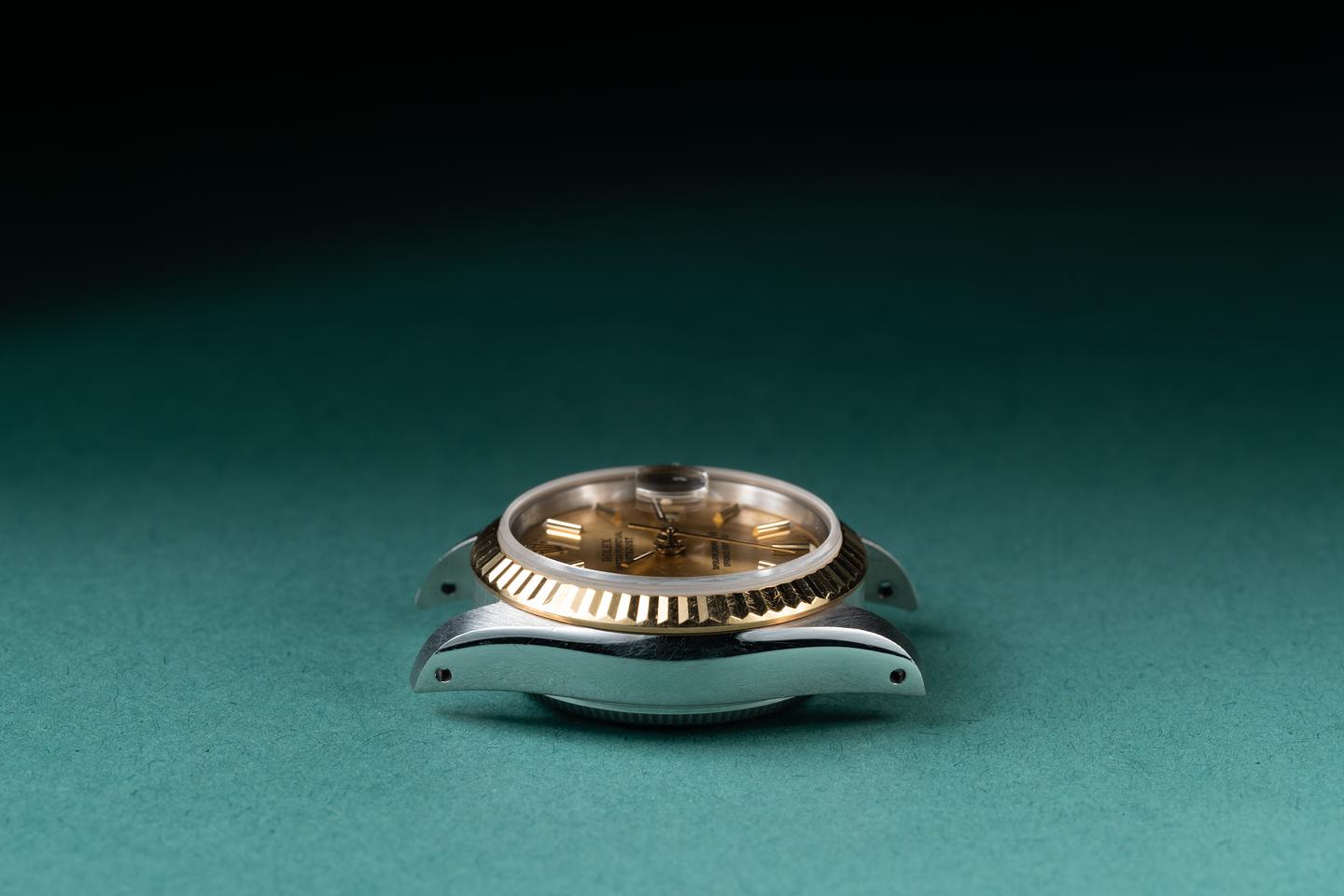 Case: The sharp 26mm case is excellent showing only light wear from use. The 18K yellow gold fluted bezel is also in excellent condition showing only light wear from use.