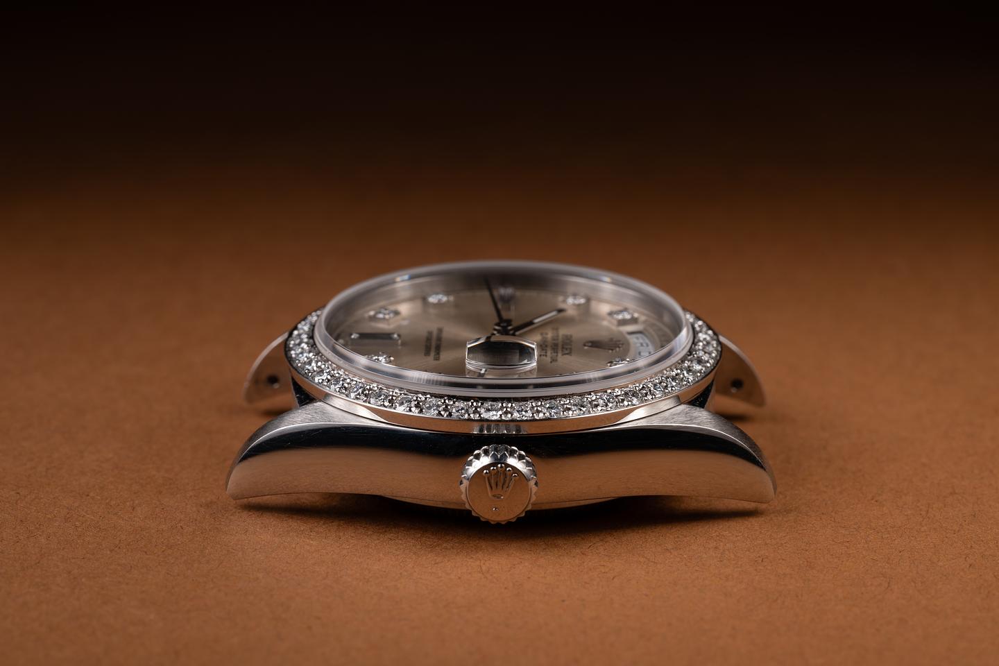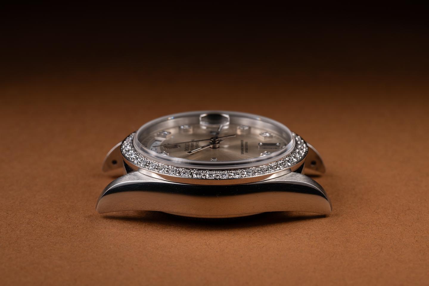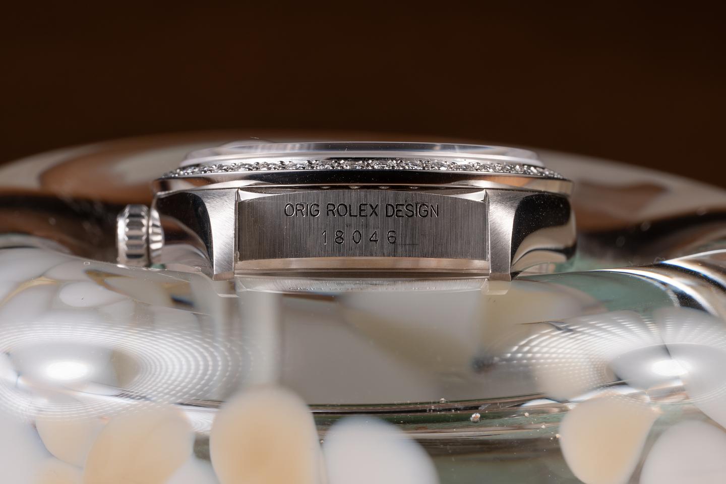 Case: The sharp platinum case is excellent, showing only very light wear from use. The platinum and diamond bezel is also in excellent condition, showing only very light wear from use.