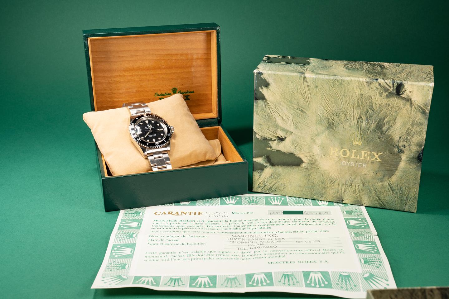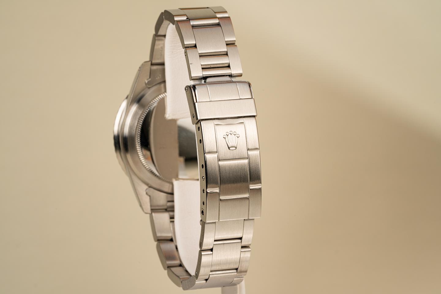 The tritium dial plots and hands are evenly aging to a creamy warm patina and the glossy surface of the dial is aging to a matte finish. The case has been polished but still looks fantastic. The 12 solid link Oyster bracelet has very light stretch and the L2 date code indicates it is most likely original to the watch. The original guarantee papers note that the watch was sold in Guam in 1988.
