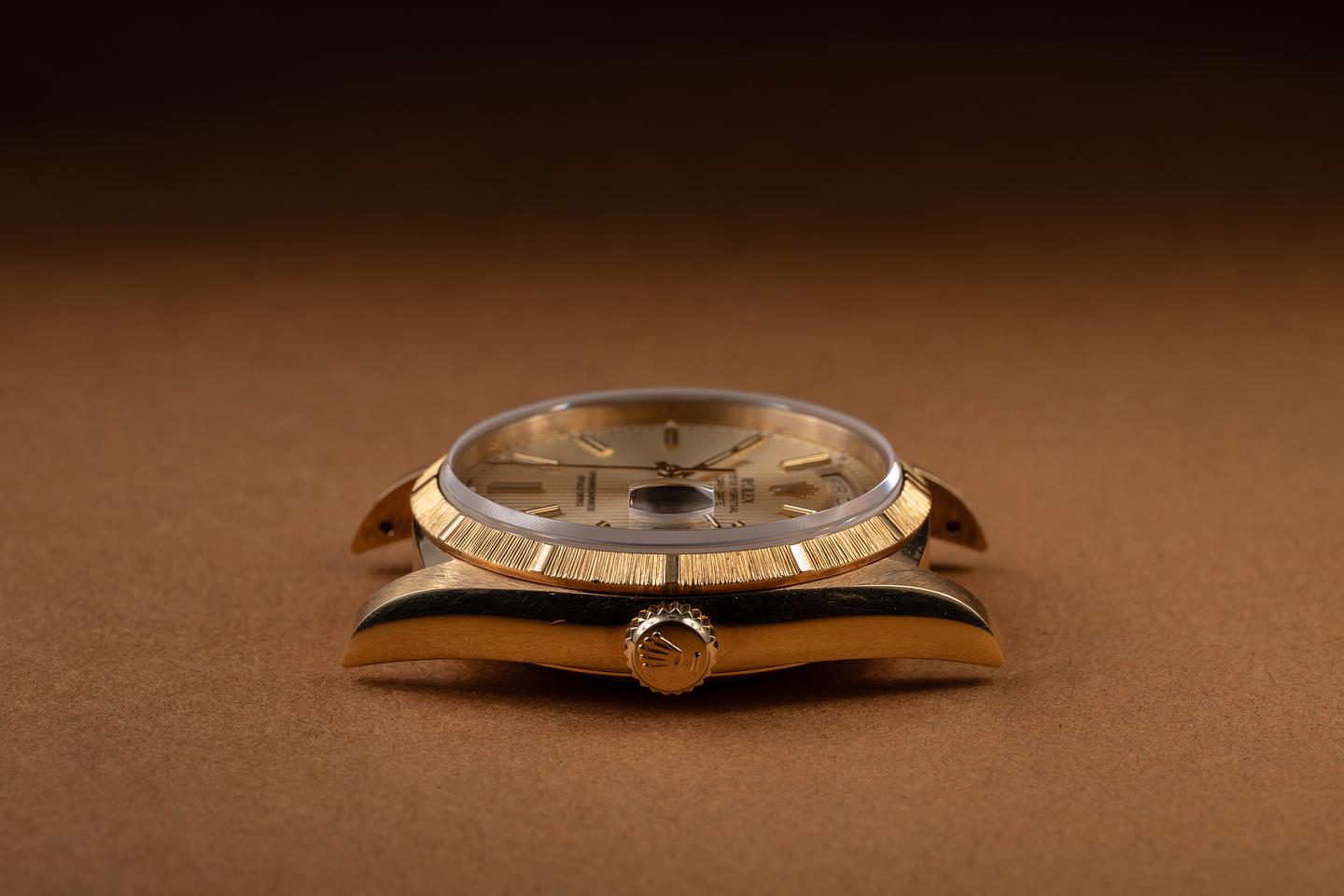Dial: The 18K yellow gold "tapestry" dial is excellent, showing no visible wear. The lume has aged to a warm, creamy hue, and the hands match perfectly.