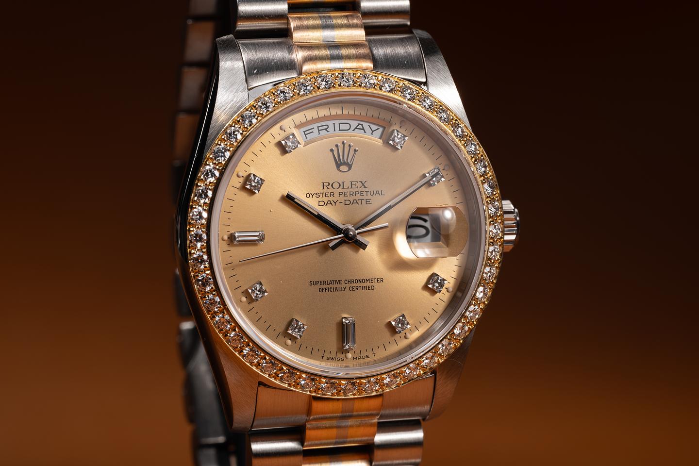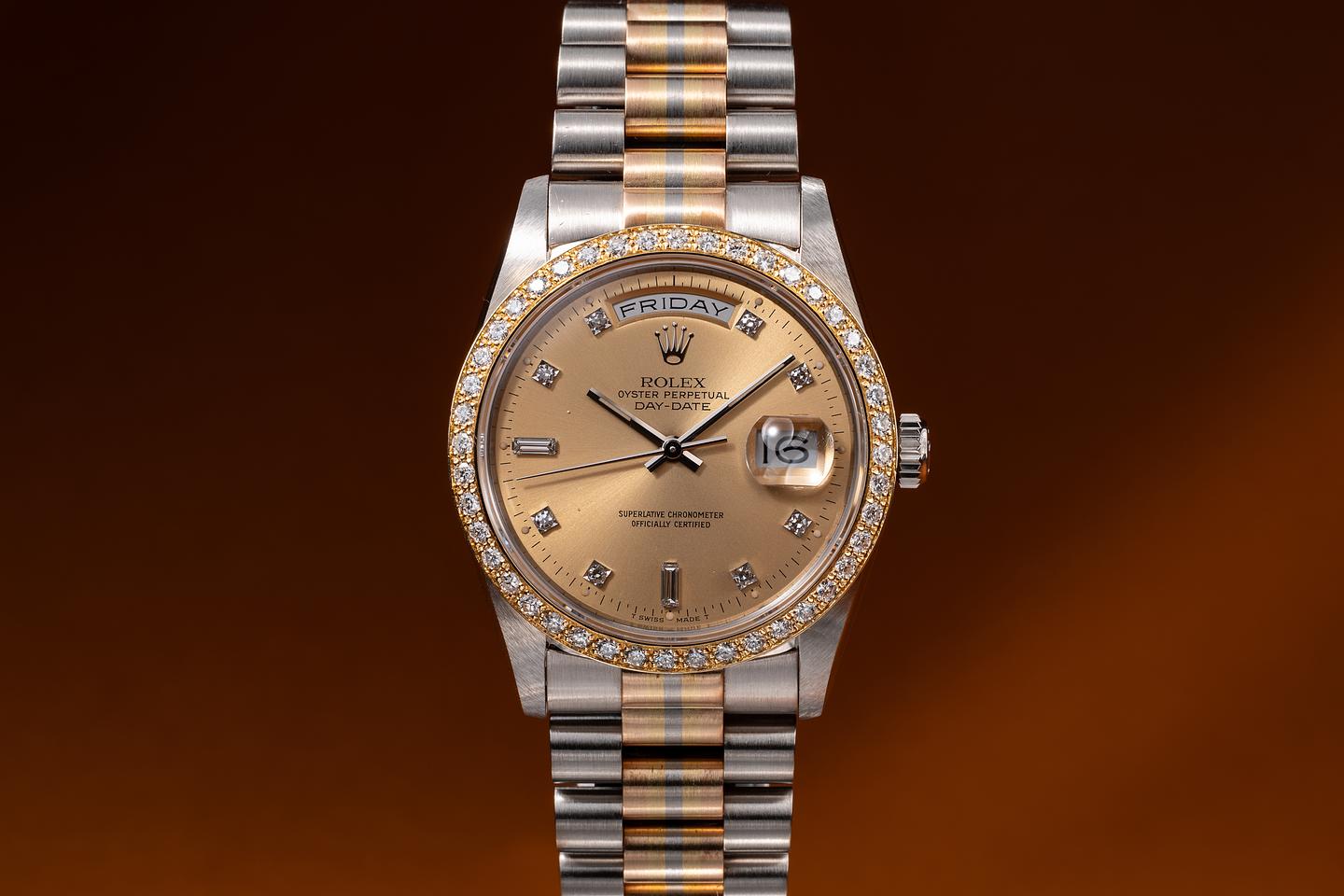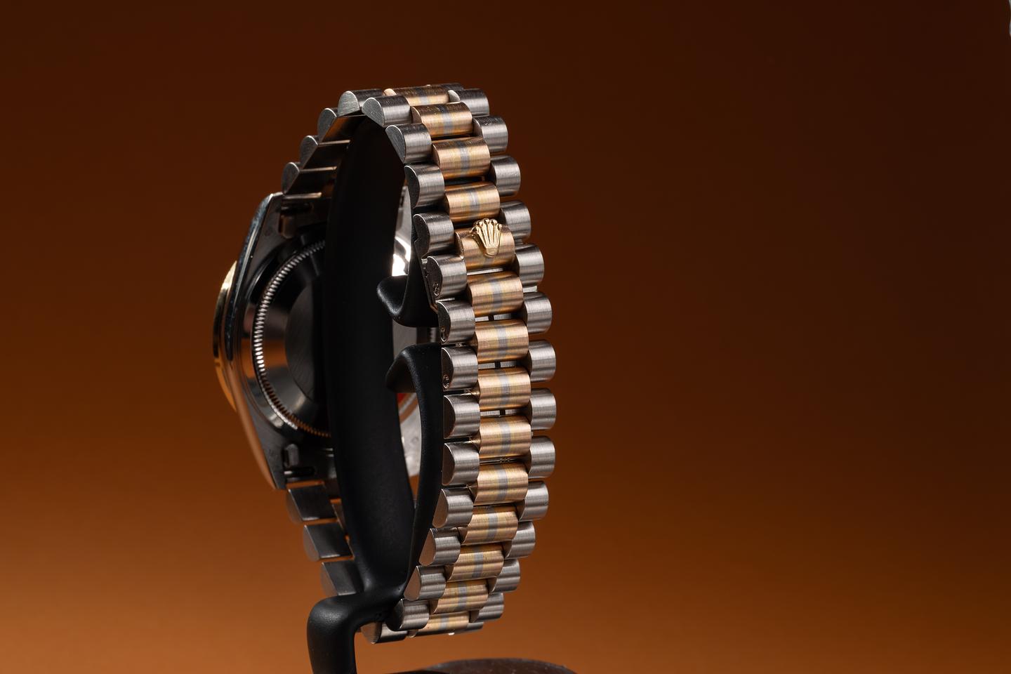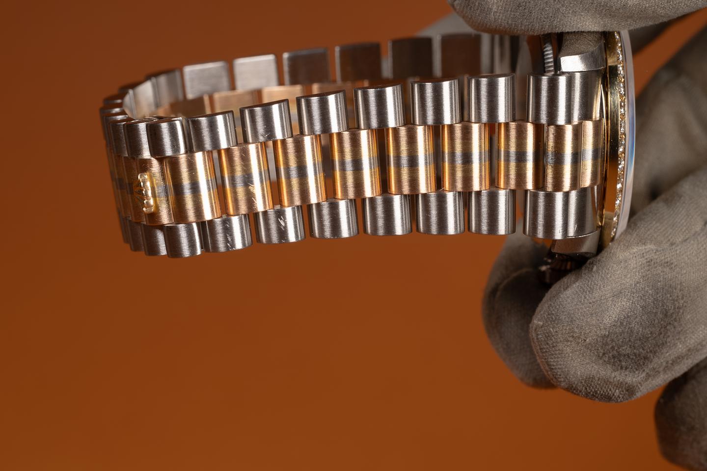 Bracelet: The 22-link 18K white, yellow, and rose gold "Tridor" President is excellent, showing only extremely light stretch for its age.