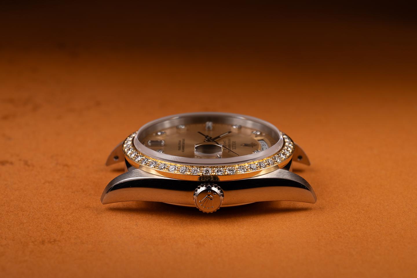 Dial: The champagne diamond dial is excellent, showing only very light wear for its age. The lume has aged to a warm, creamy hue, and the hands match perfectly.