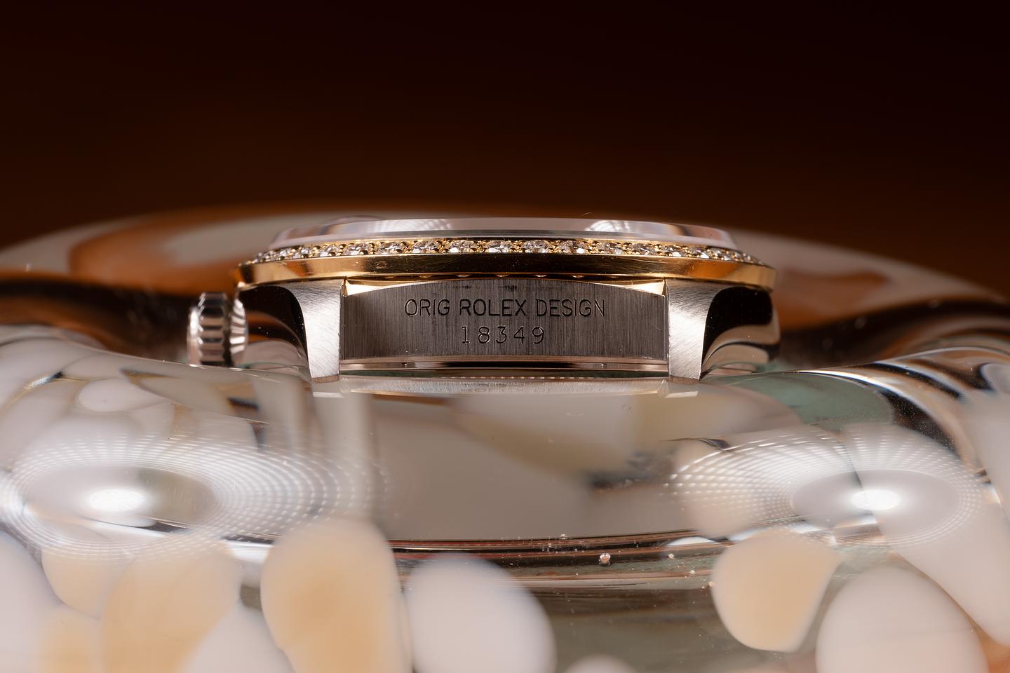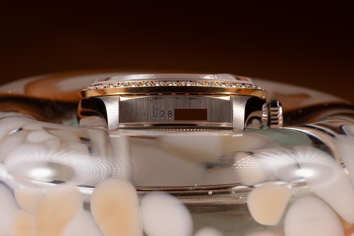 Case: The thick, sharp, and even 18K white gold case is excellent, showing only very light wear. The 18K yellow gold & diamond bezel is excellent, showing only very light wear.