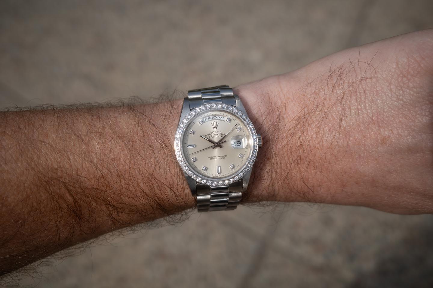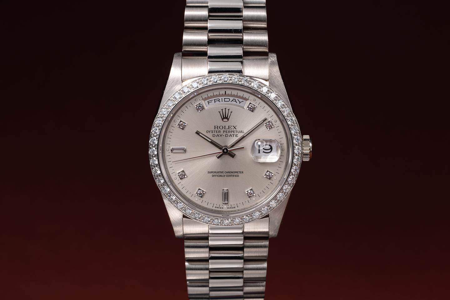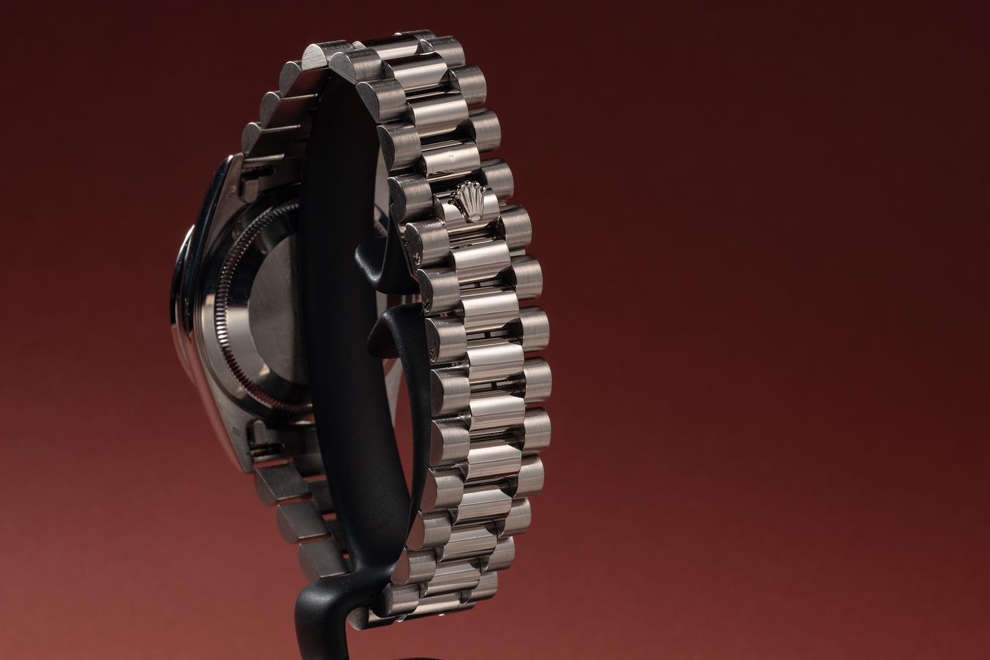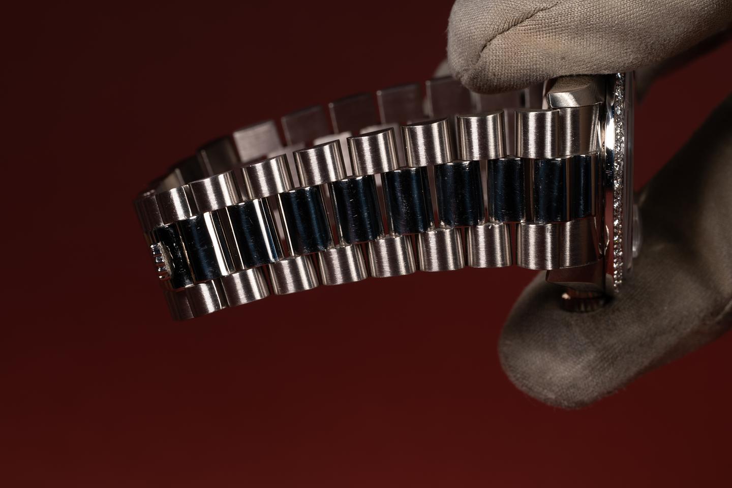 Bracelet: The 22-link 18k white gold President bracelet is excellent showing only very light stretch for its age.
