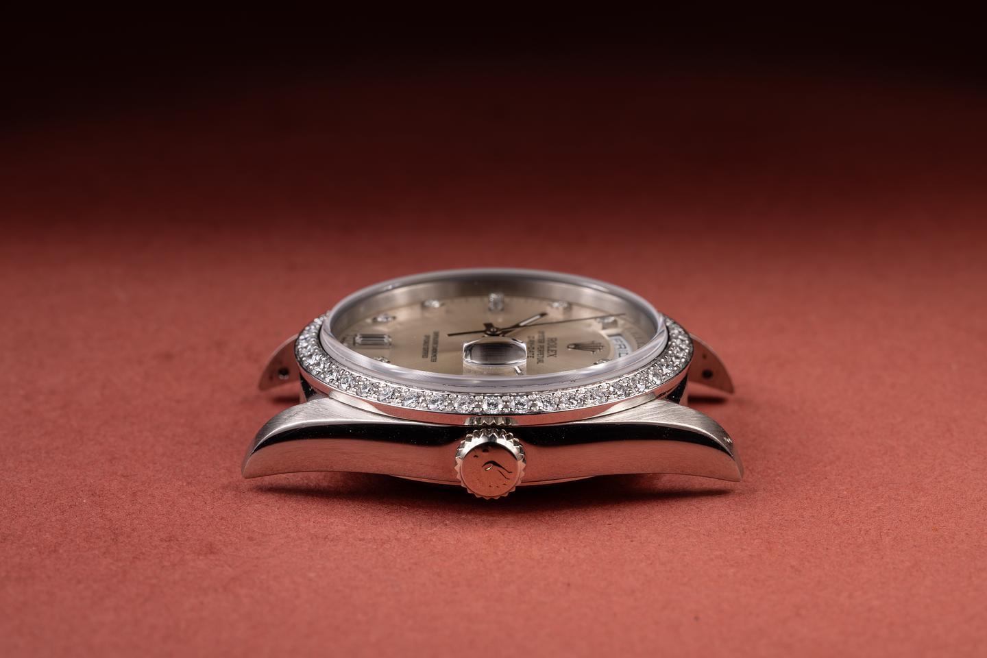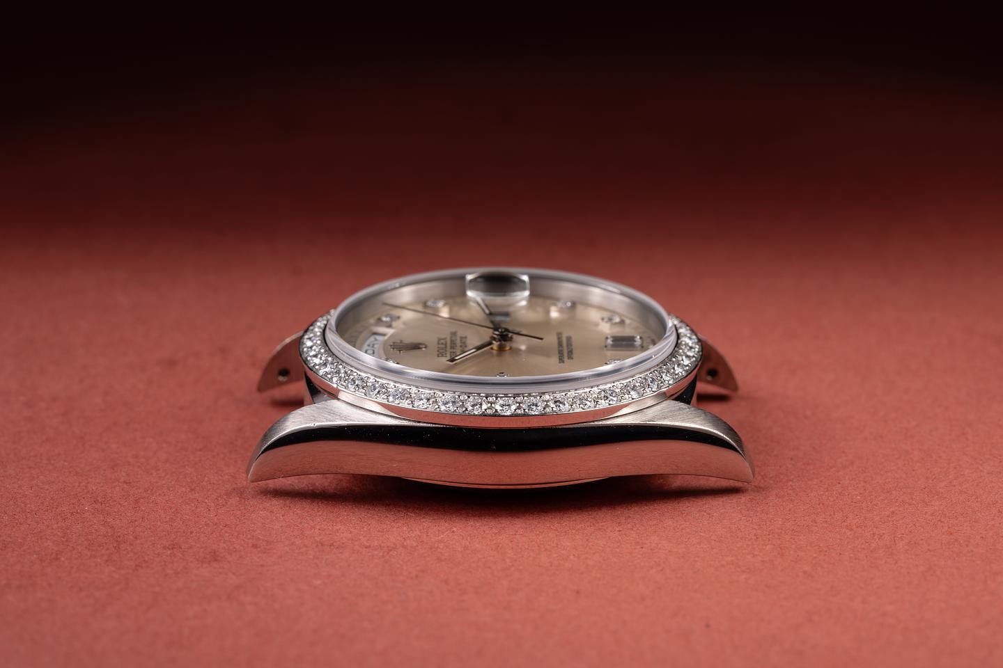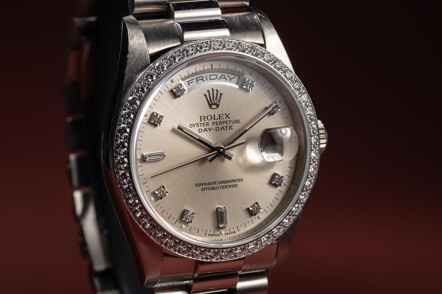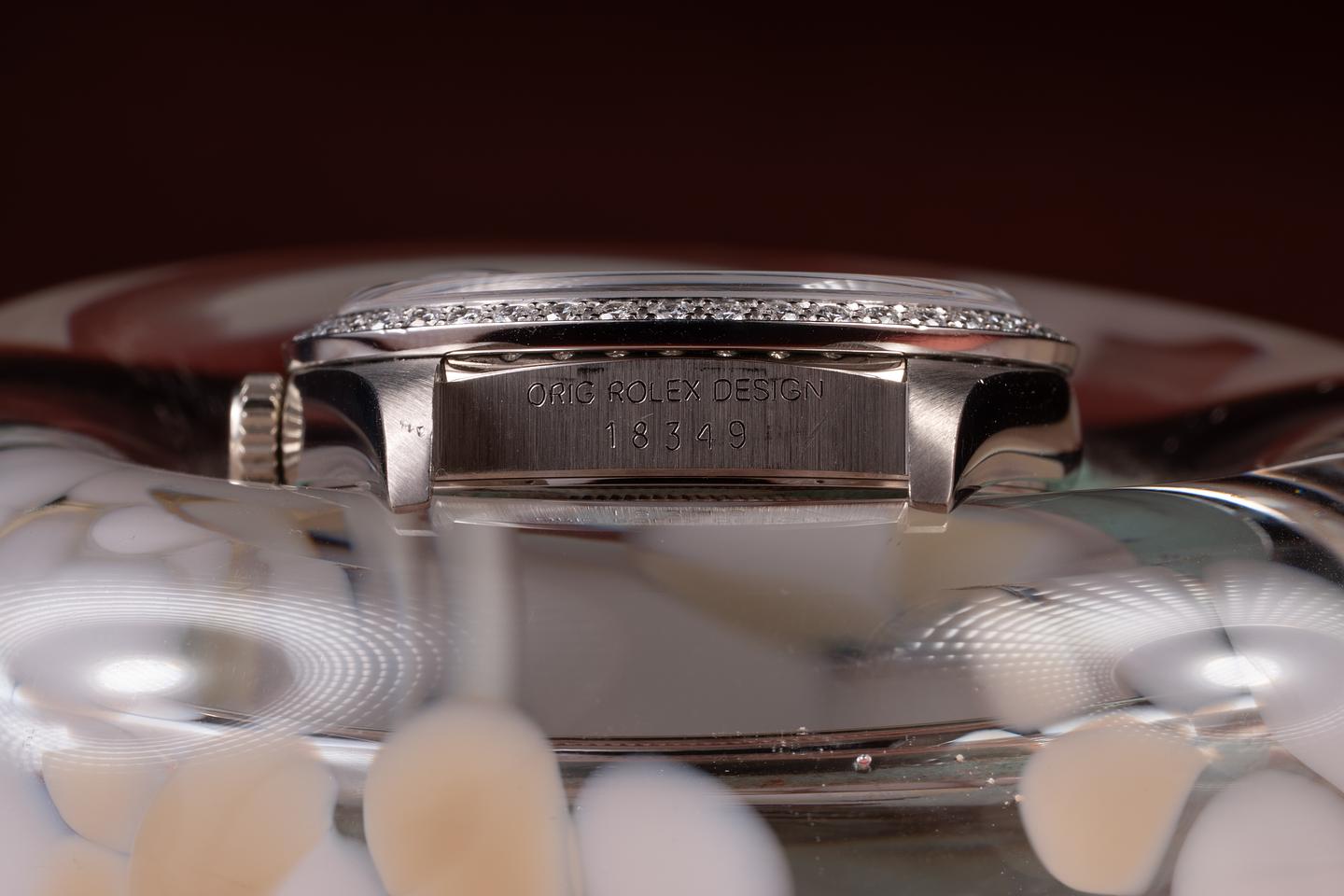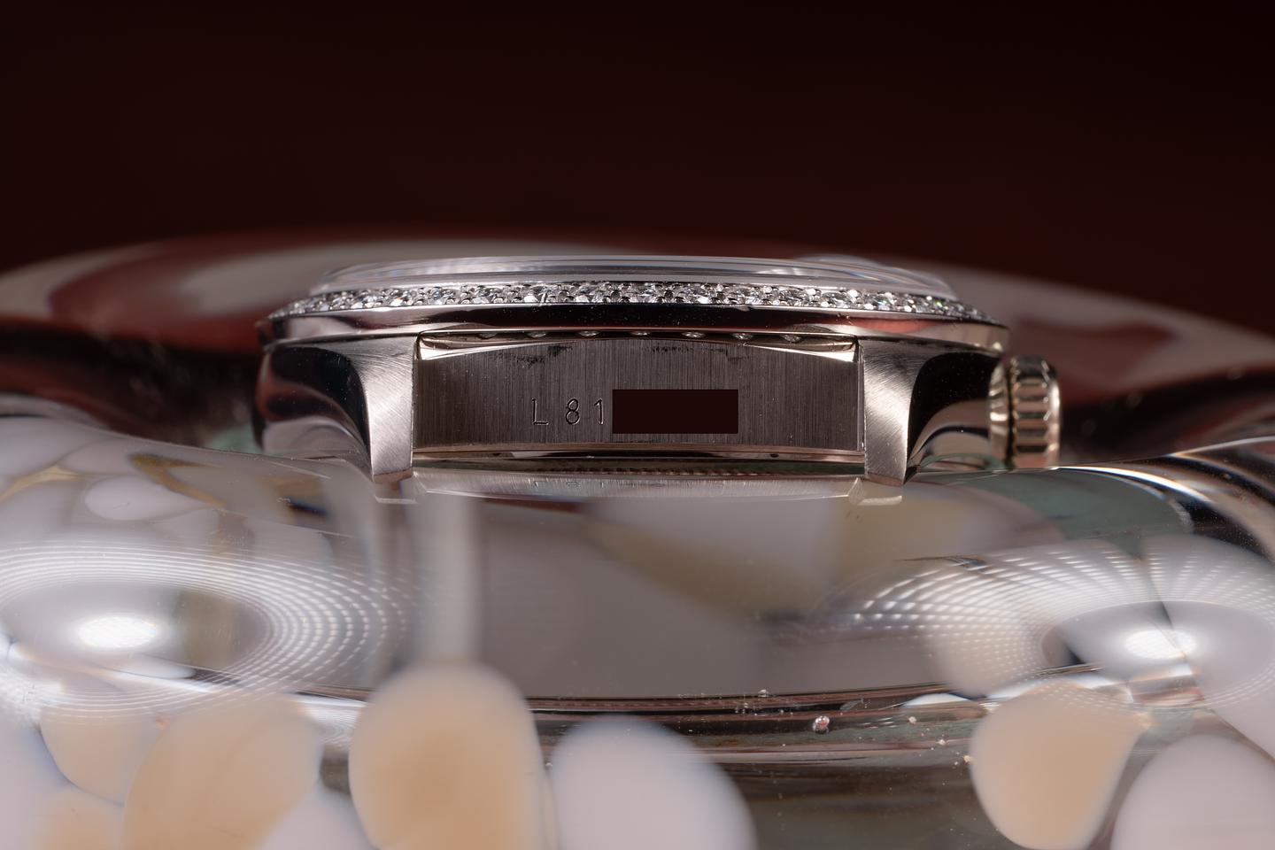 Case: The 18K white gold is excellent showing overall only very light wear for its age. There is a small ding on the 1 o'clock lug. The 18K white gold and diamond bezel is also in excellent condition showing only light wear from use.