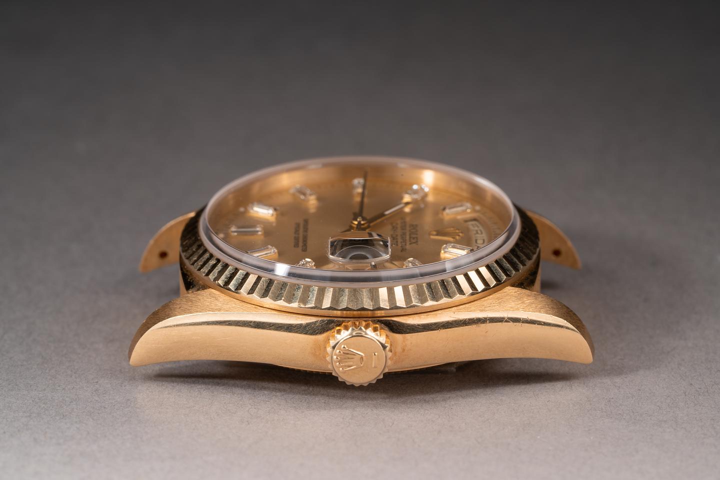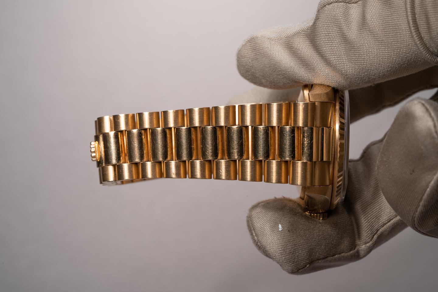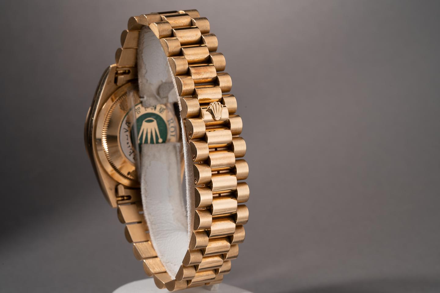 Bracelet: The 23 link 18k yellow gold president bracelet is excellent showing only very light stretch for its age.