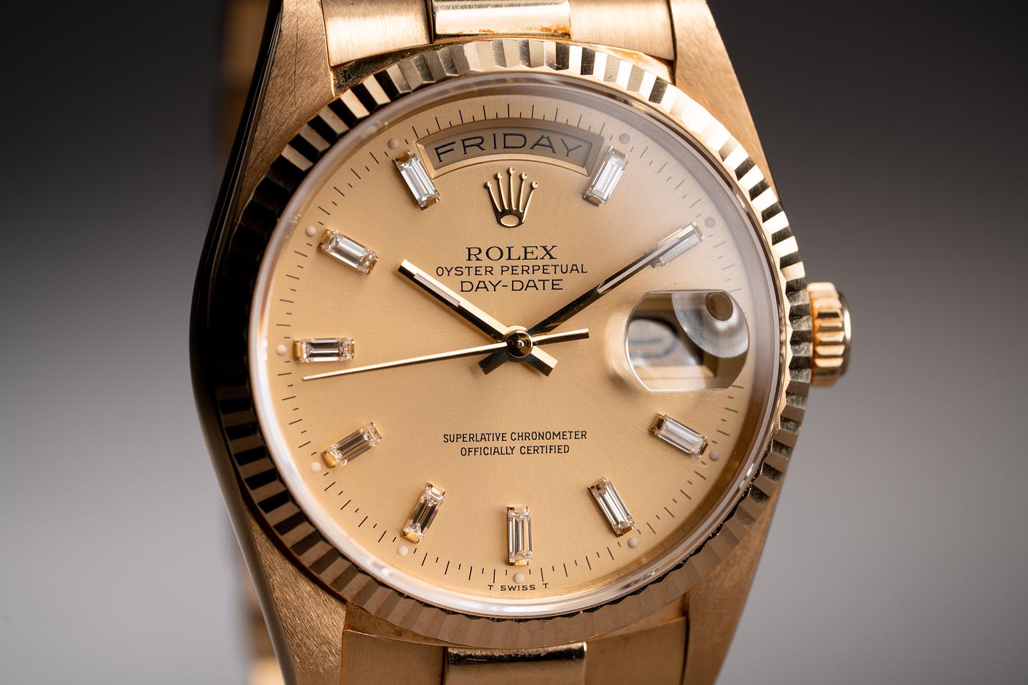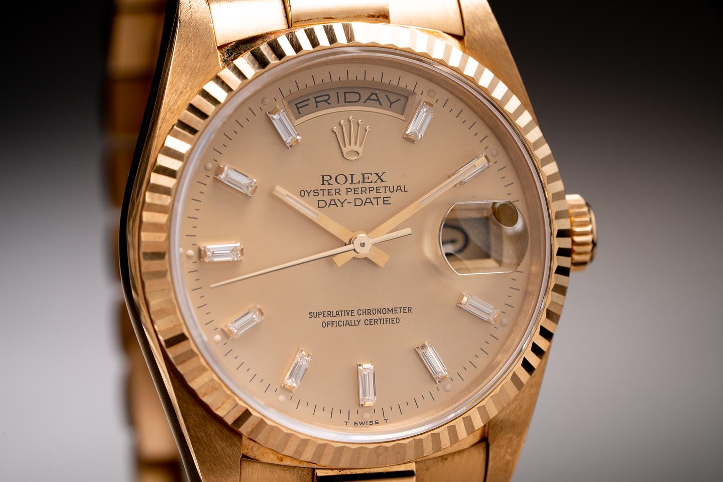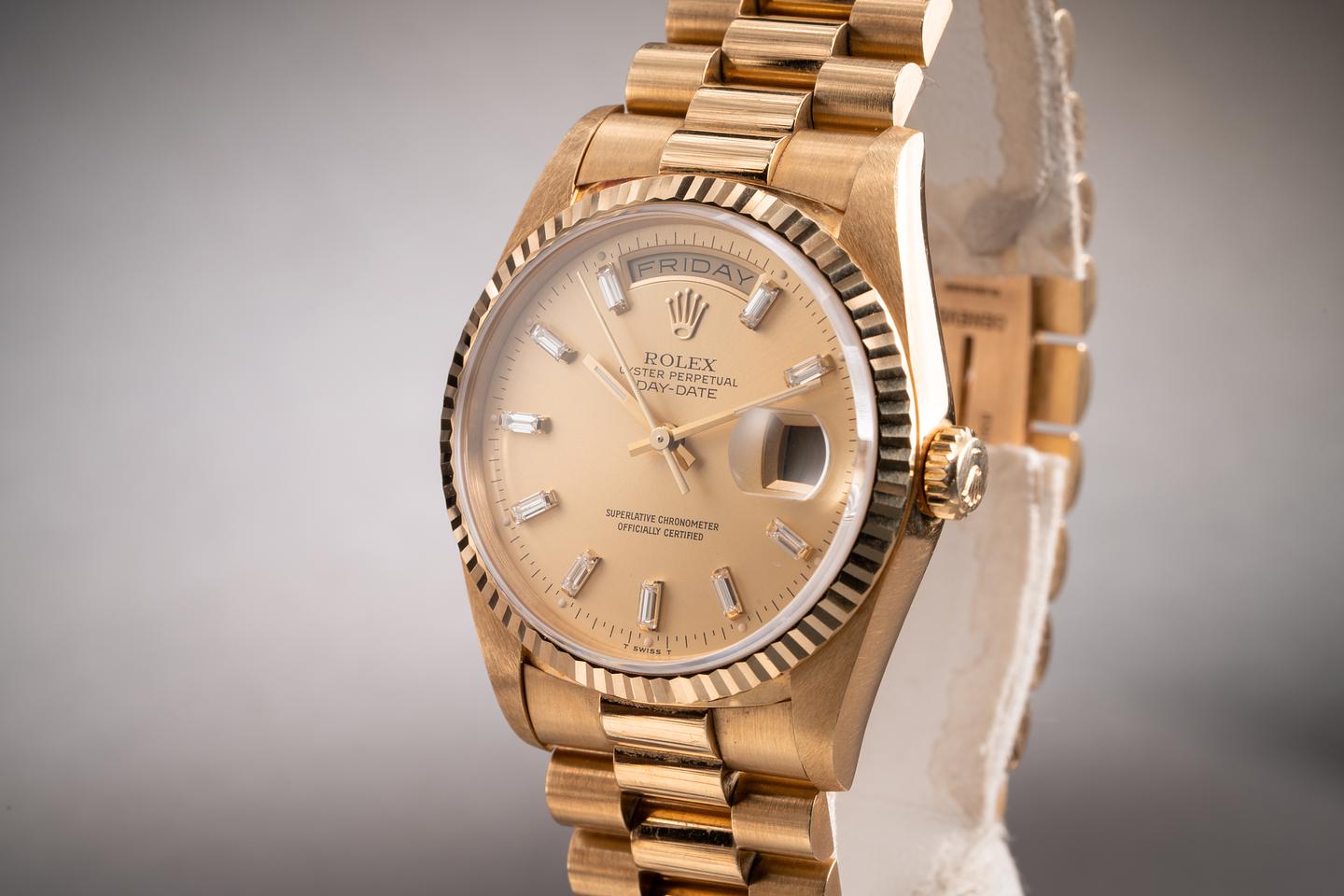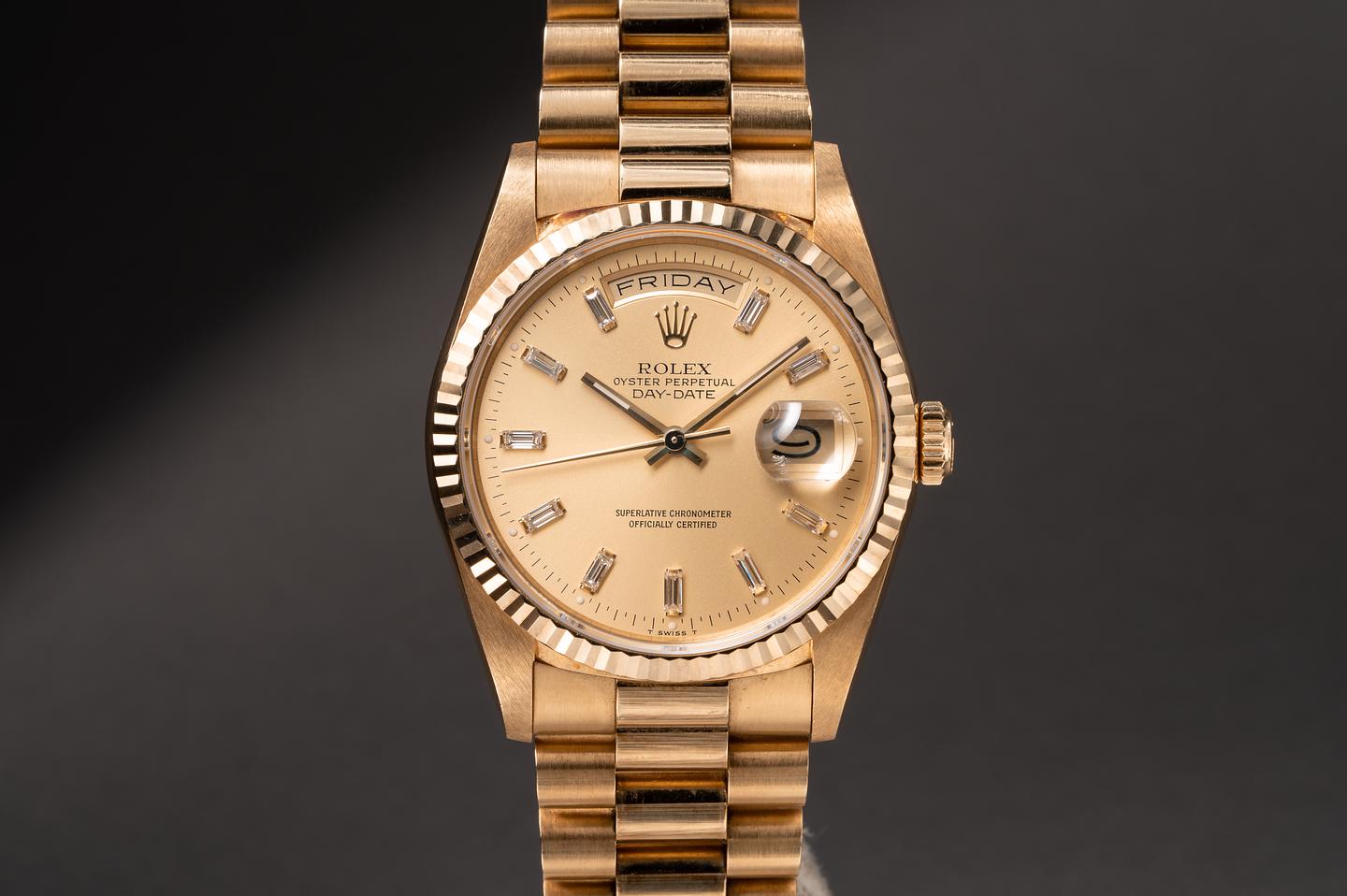 Bracelet: The 23 link 18k yellow gold president bracelet is excellent showing only very light stretch for its age.