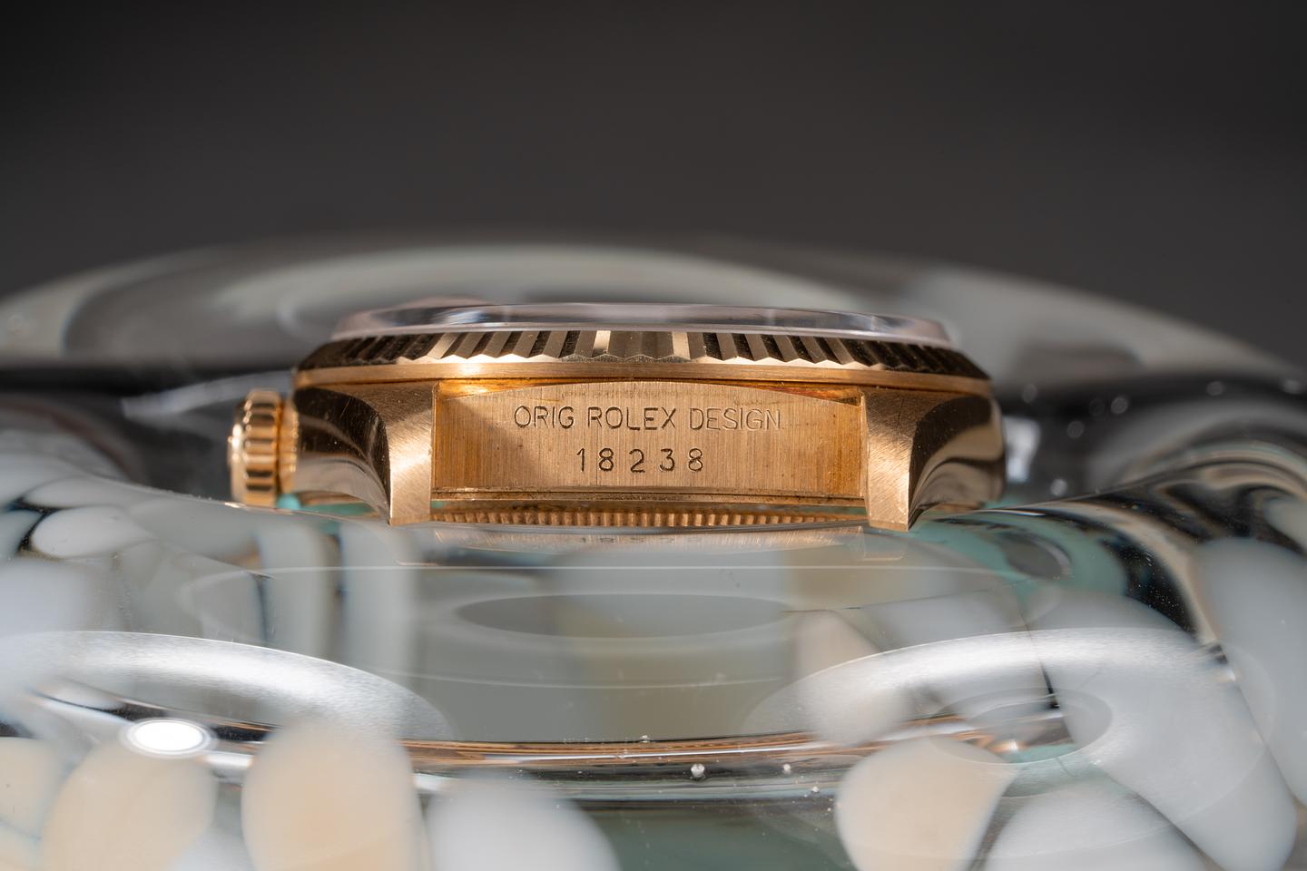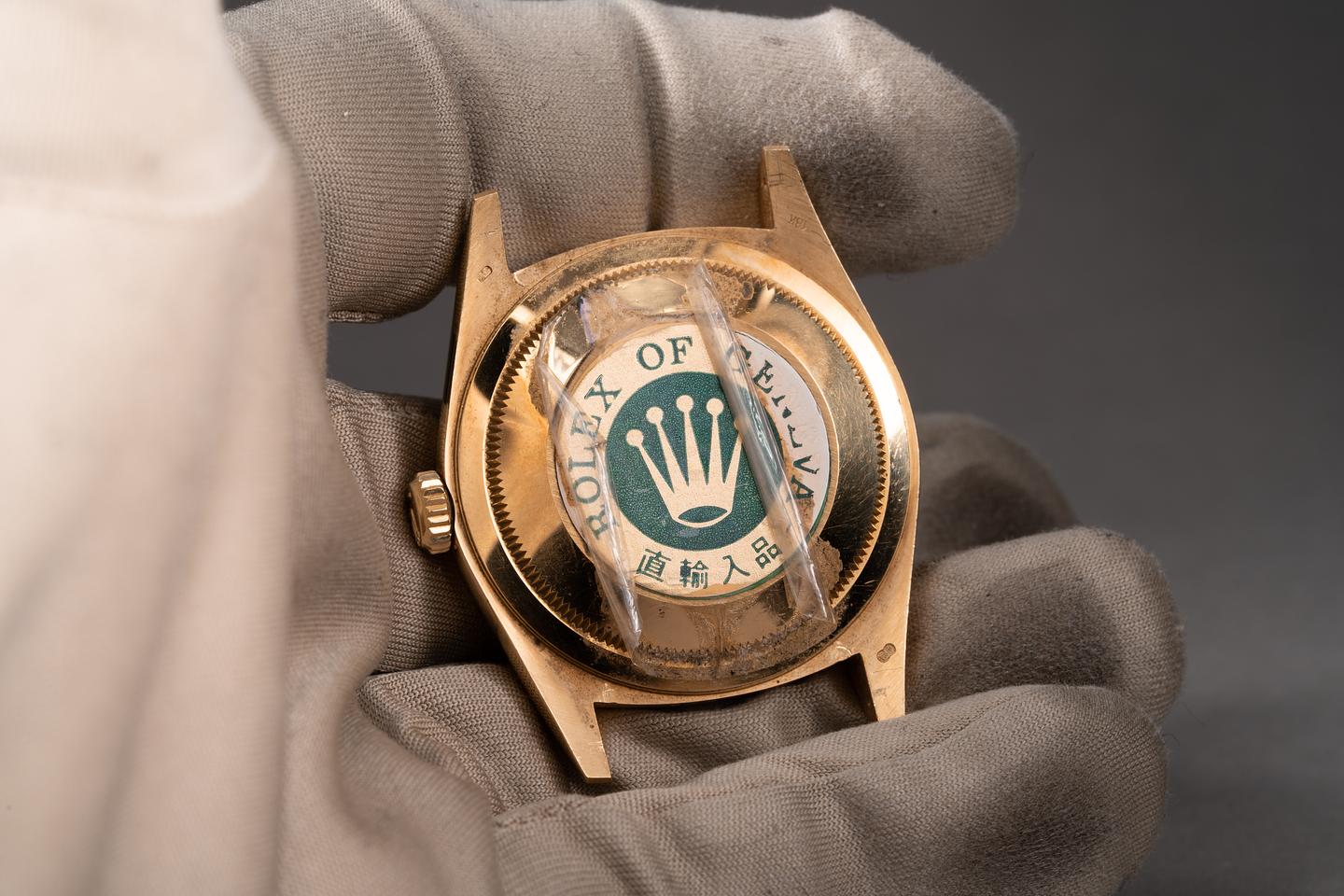 Case: The thick and even 18k yellow gold case appears to be unpolished showing some light wear from use. The 18k yellow gold fluted bezel is sharp showing only very light wear from use. The original factory sticker is still in place on the caseback.