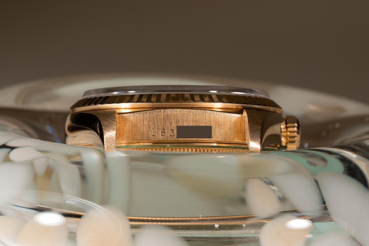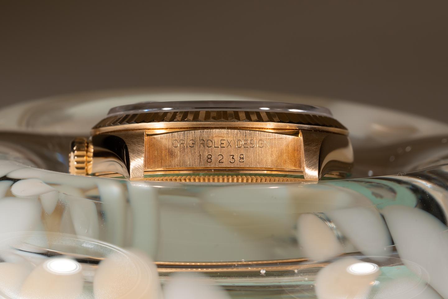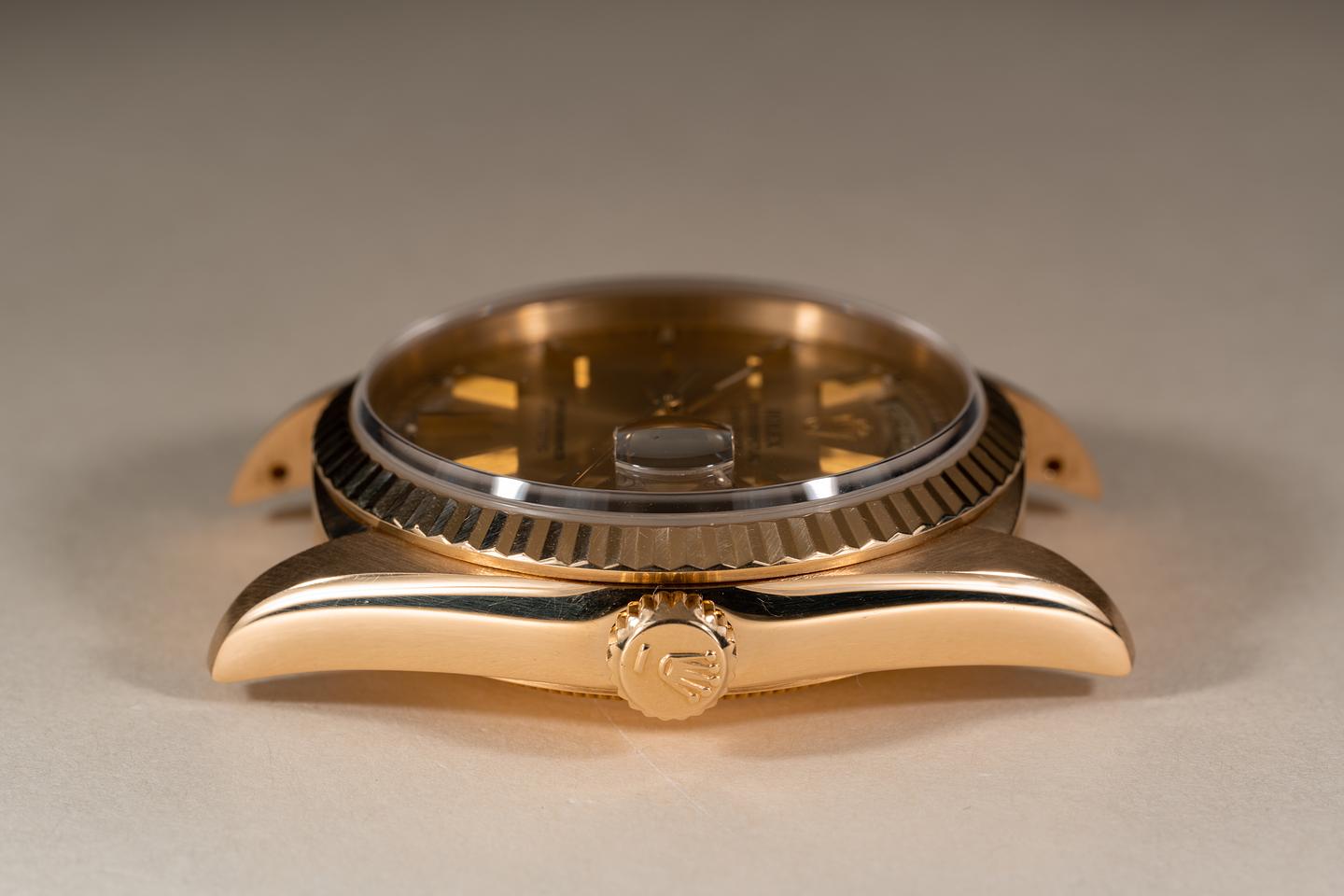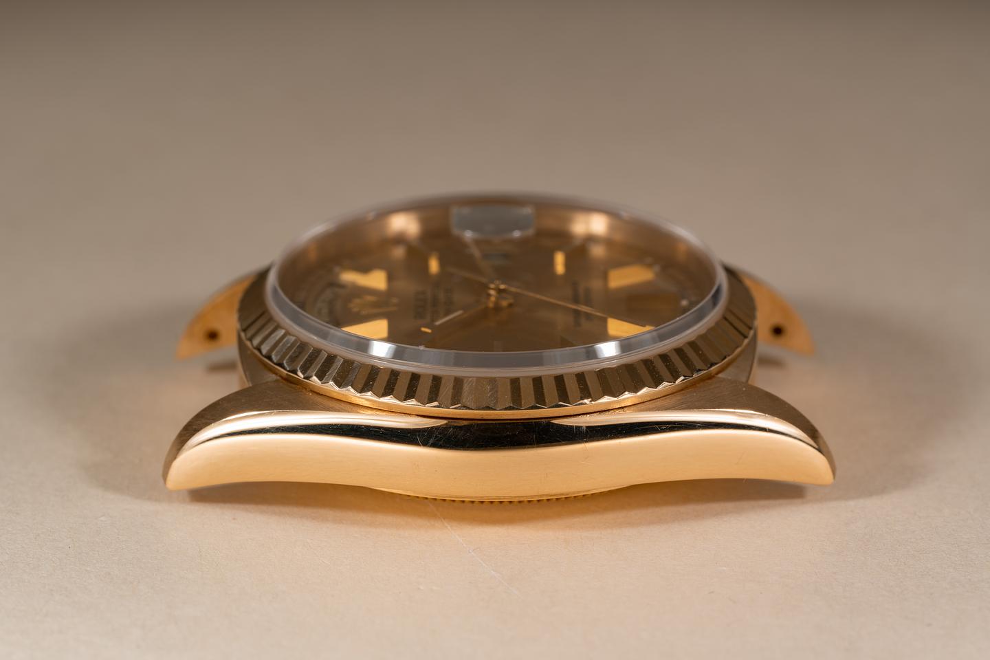 Case: The thick and even 18k yellow gold case is excellent showing only extremely light wear from use. The sharp 18k yellow gold fluted bezel is also in excellent condition showing only extremely light wear from use.
