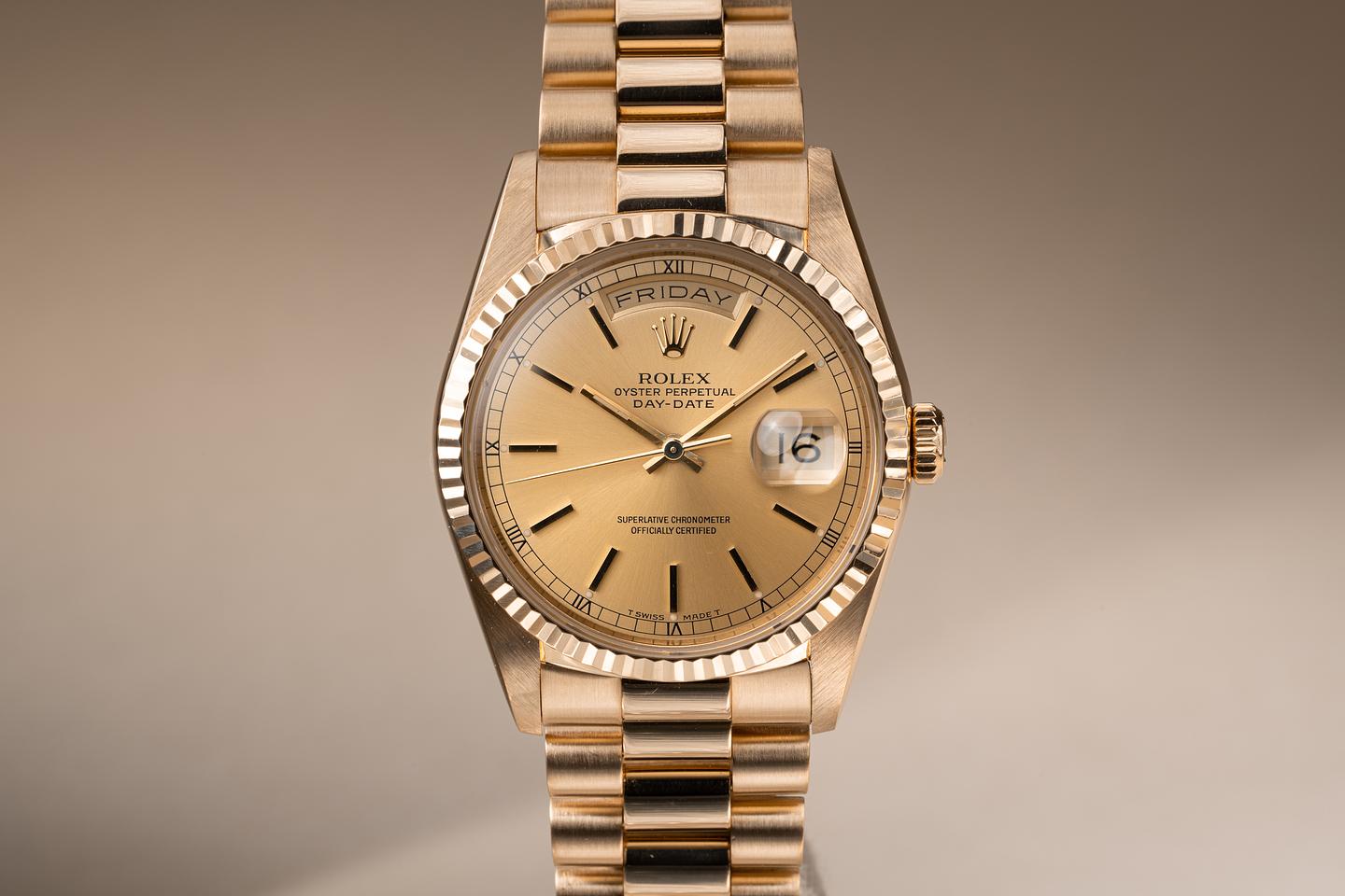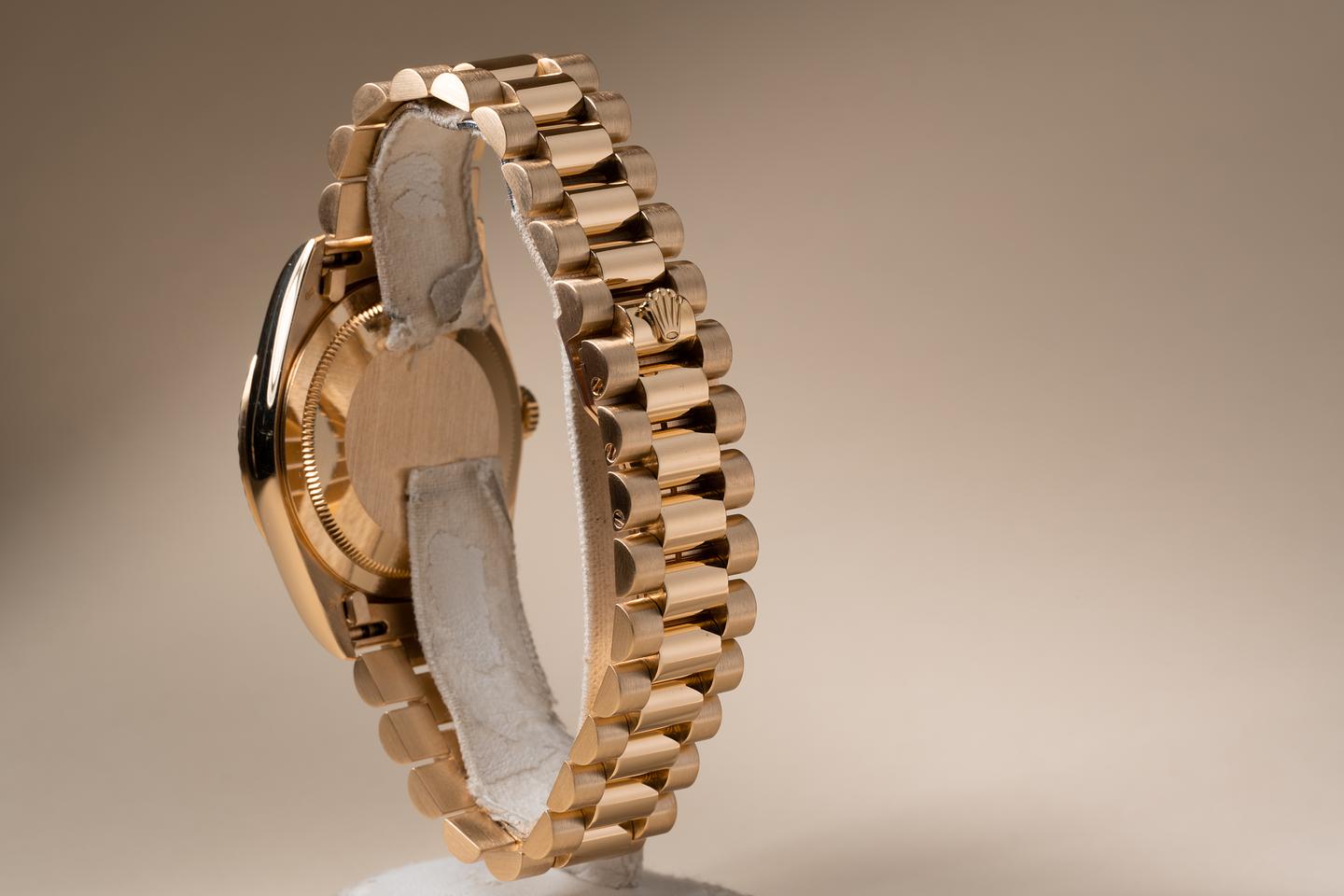 Bracelet: The 23 link 18k yellow gold president bracelet is excellent showing some light stretch for its age.