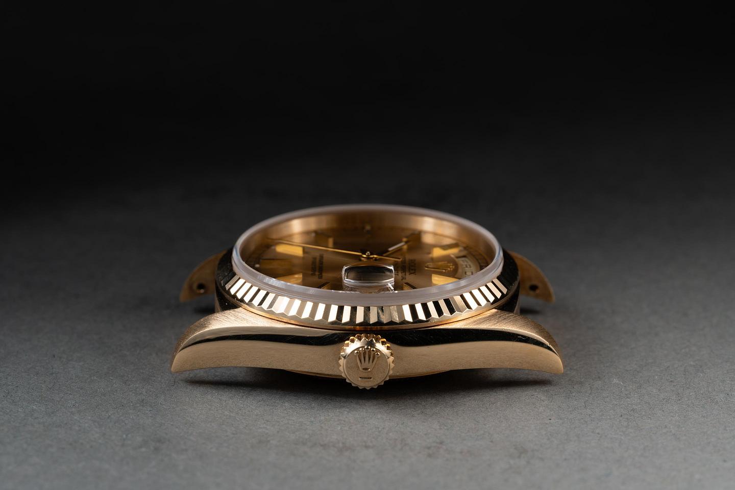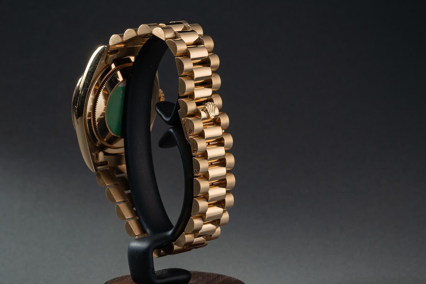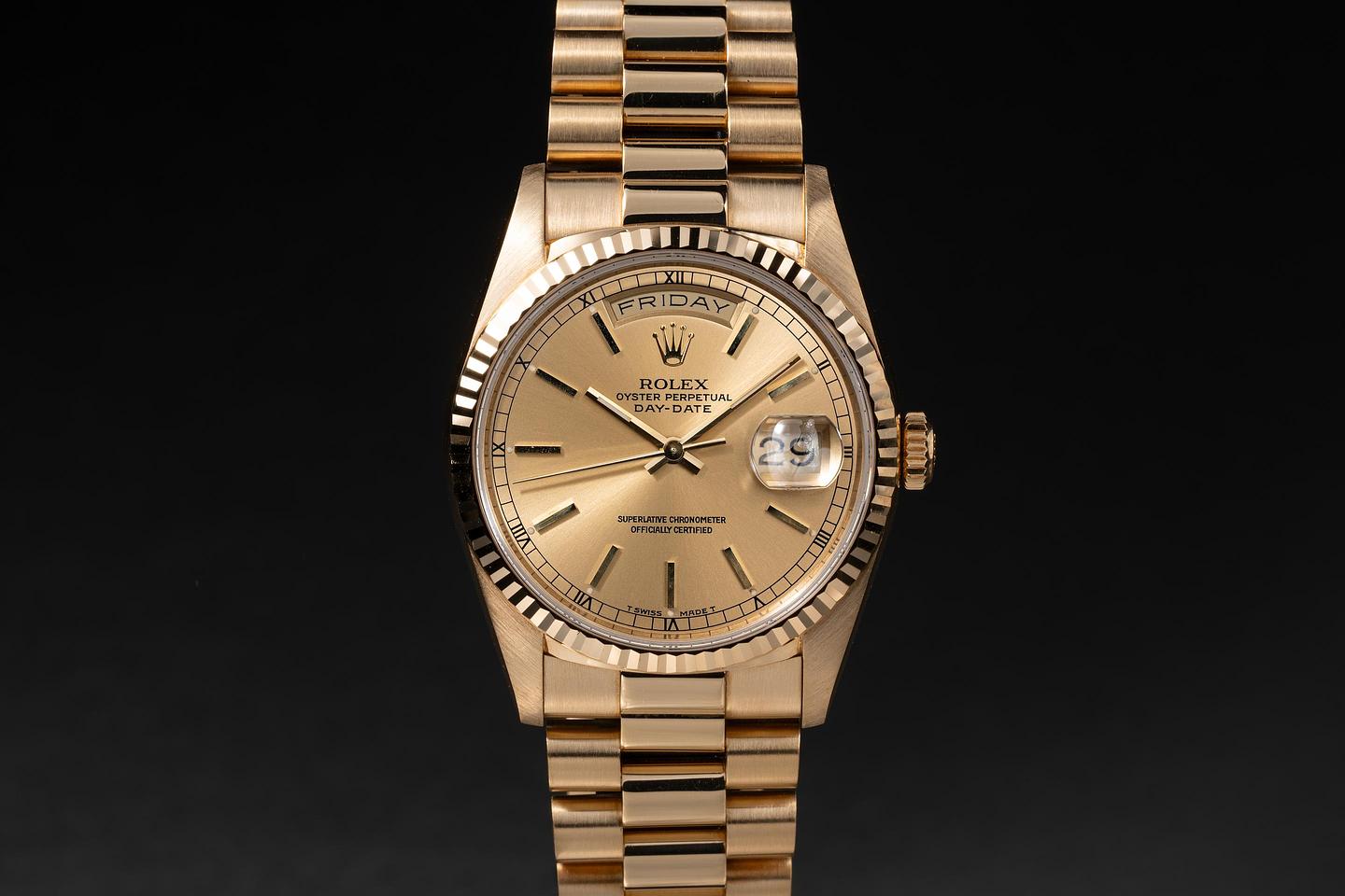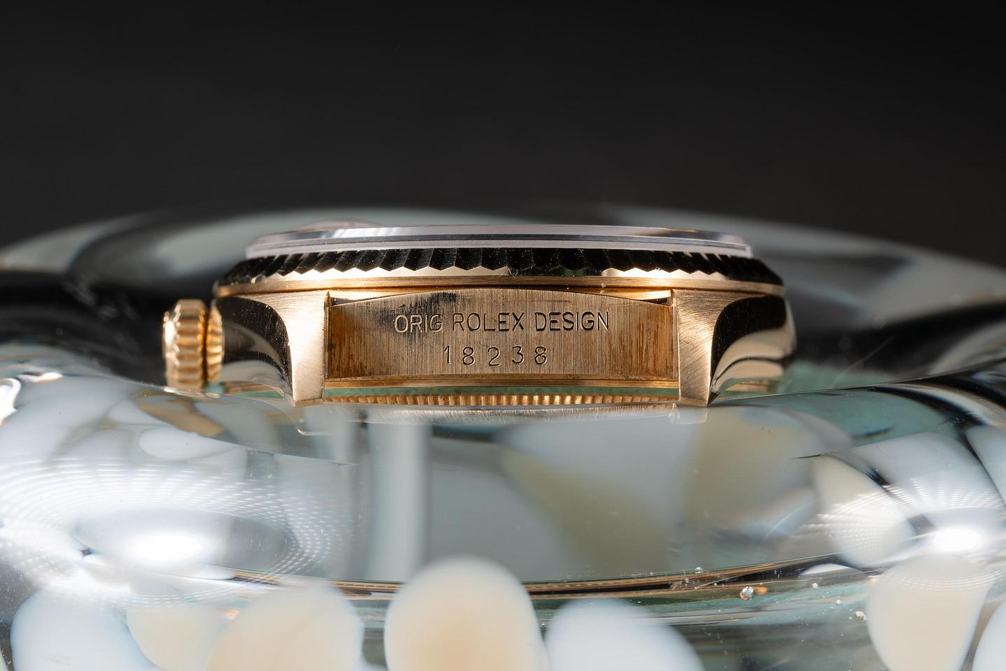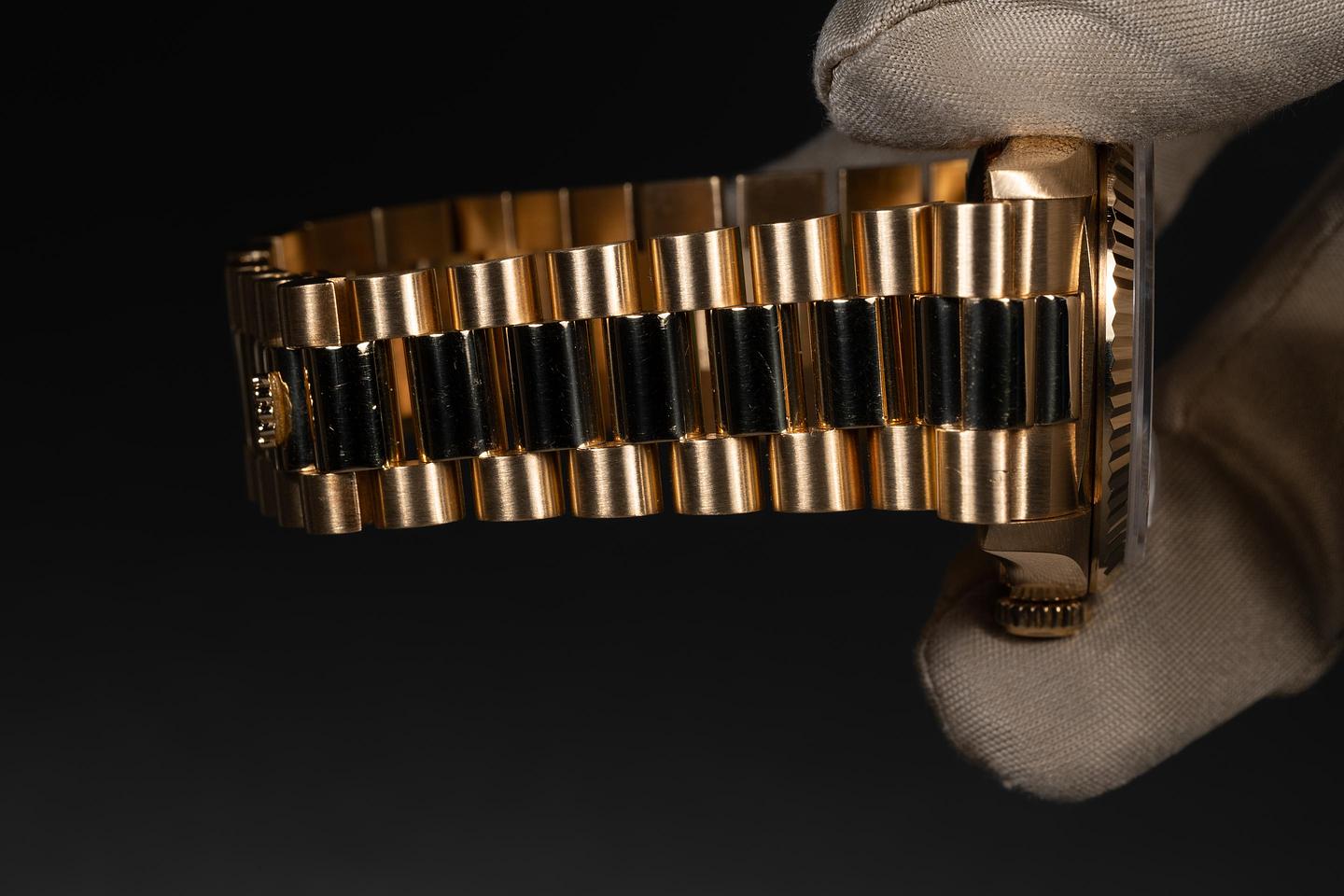 Bracelet: The 22 link 18K yellow gold President bracelet is excellent showing only very light stretch for its age. The clasp is stamped with a matching 1989 date code. The bracelet will fit up to a 17.2 cm. / 6.77" wrist.