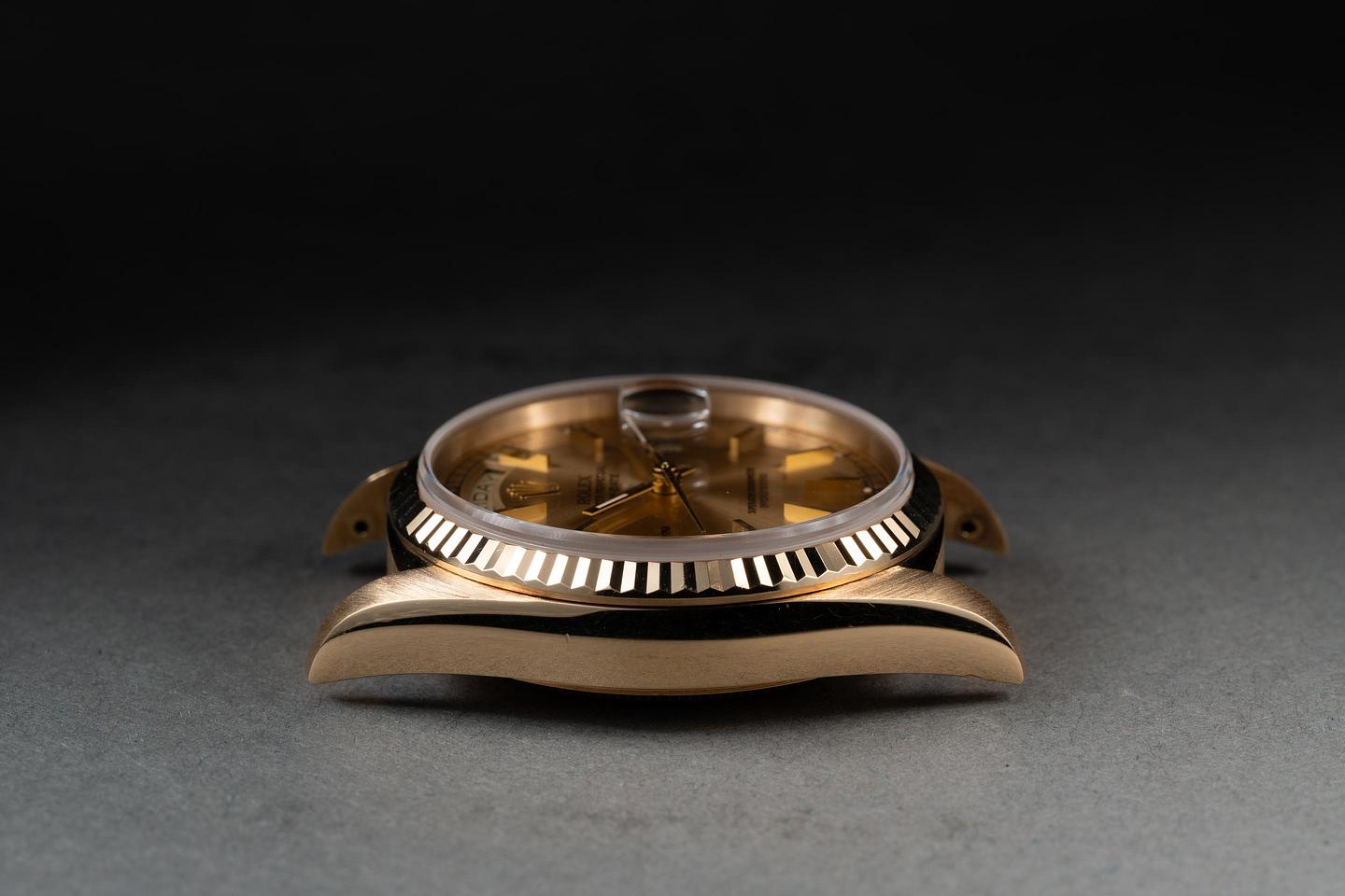 Case: The thick, sharp, and even case is excellent showing only very light wear form use. The sharp 18k yellow gold fluted bezel is also in excellent condition showing only light wear from use.
