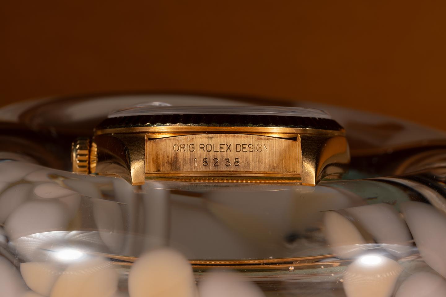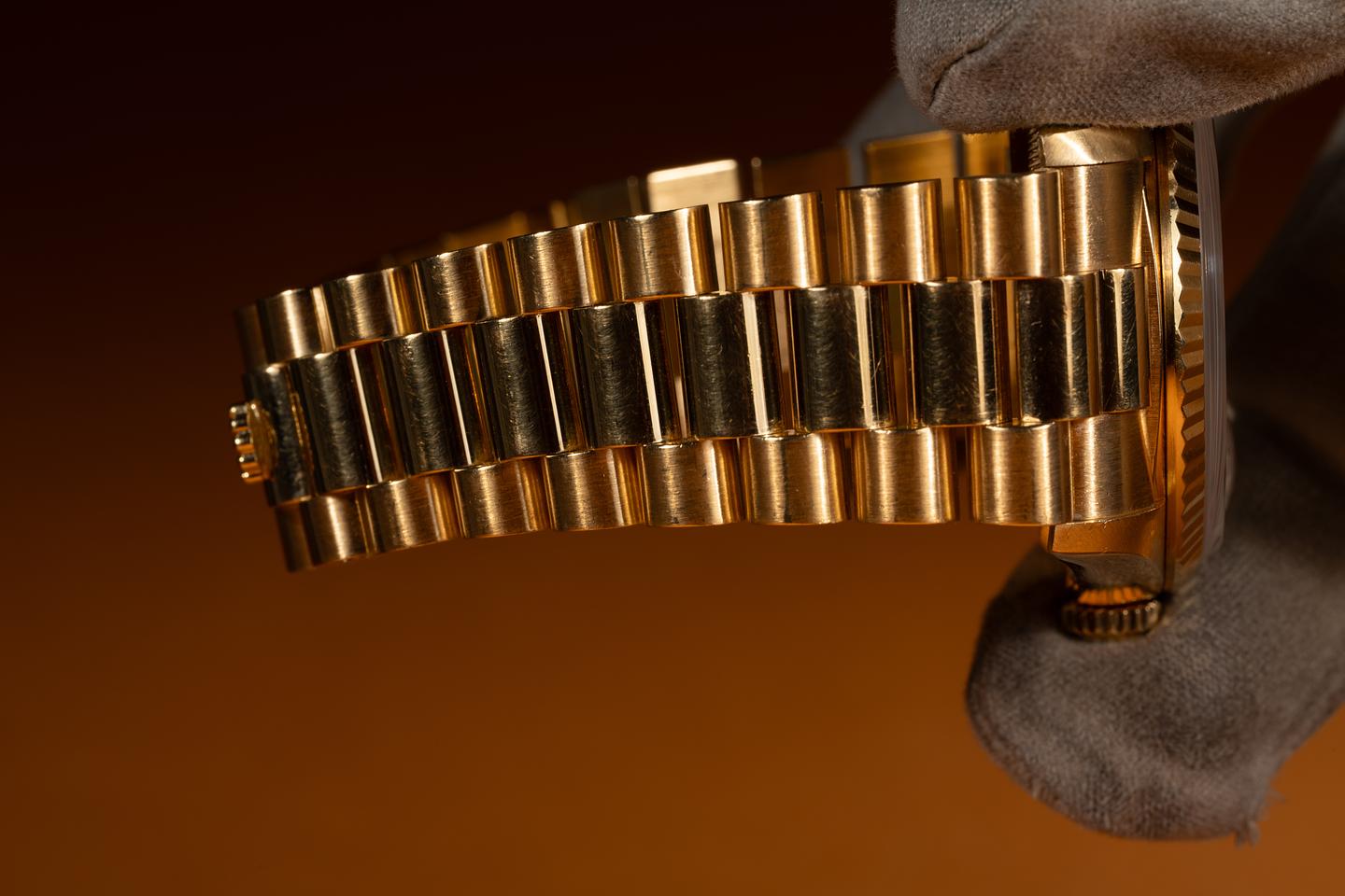 Bracelet: The 22 link 18K yellow gold President bracelet is excellent showing only very light stretch for its age. The clasp is stamped with a matching 1989 date code.