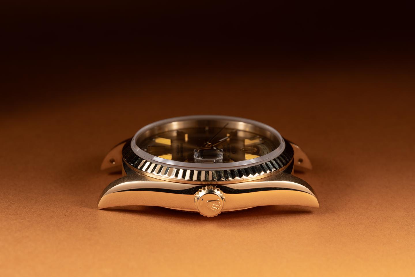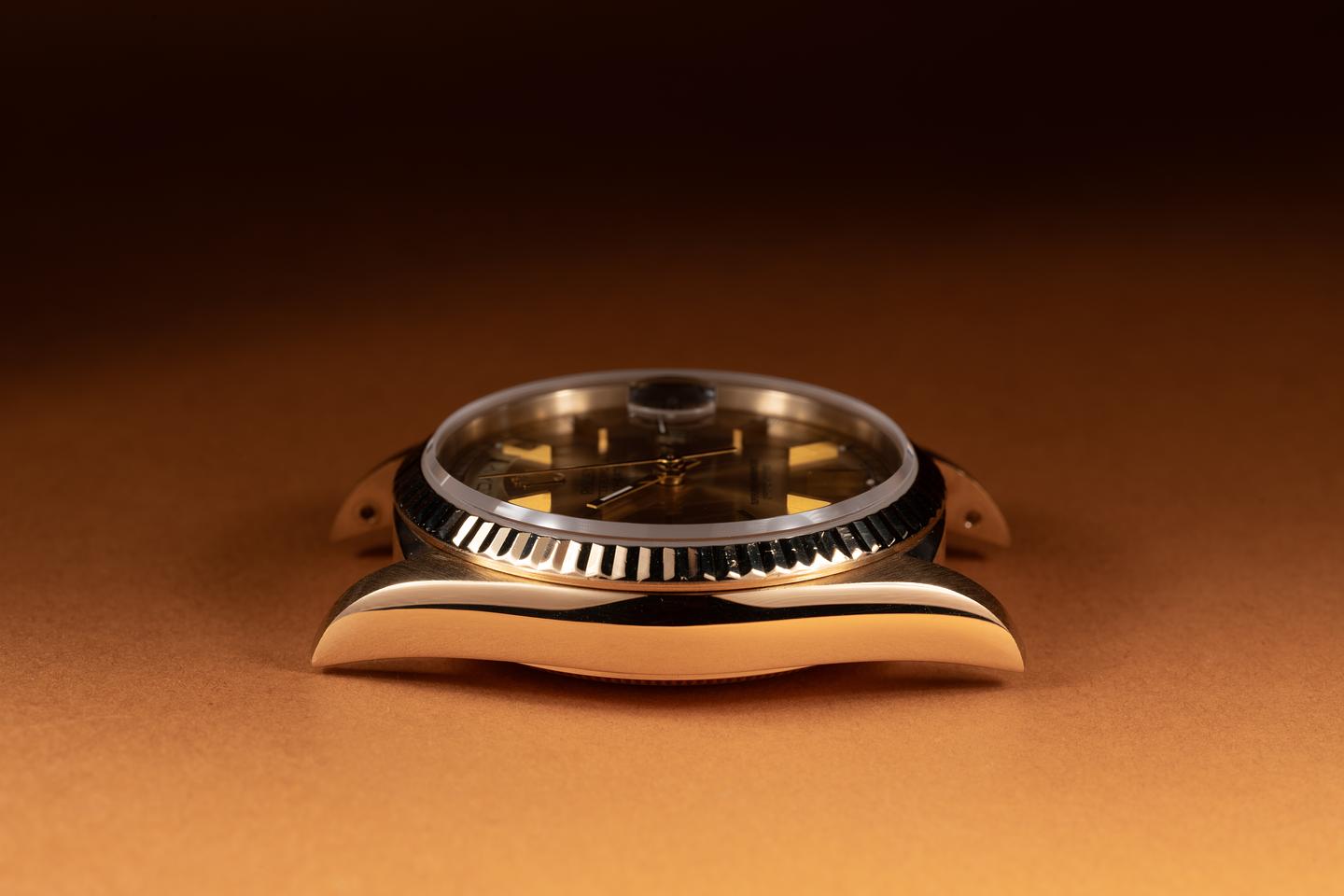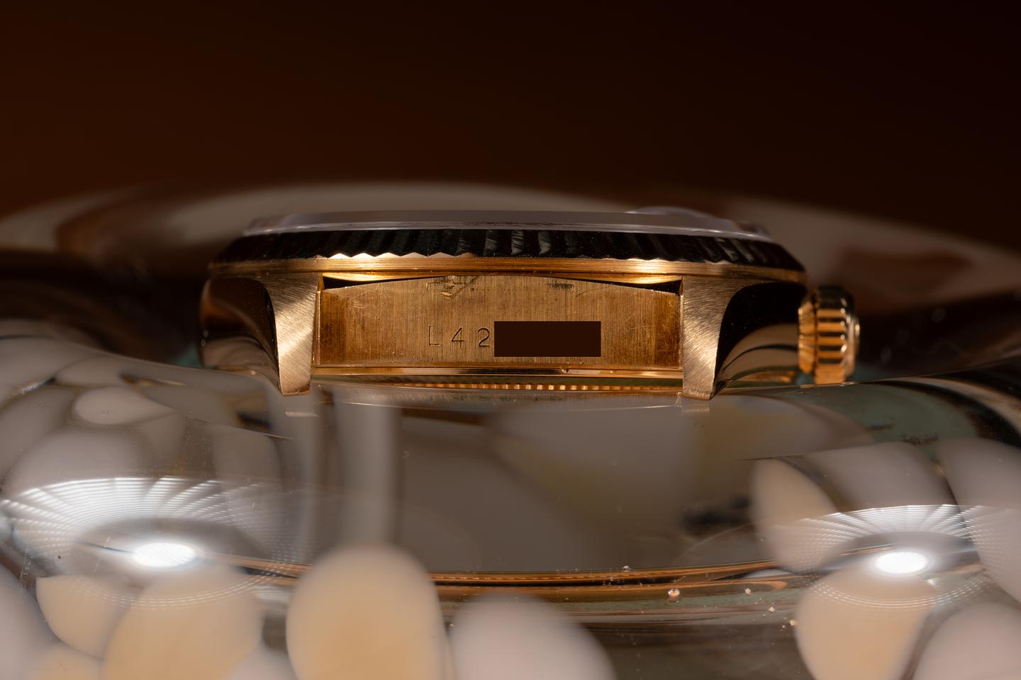Case: The sharp 18K yellow gold case is in excellent condition showing only very light wear. The sharp 18k fluted bezel is also in excellent condition showing only very light wear.