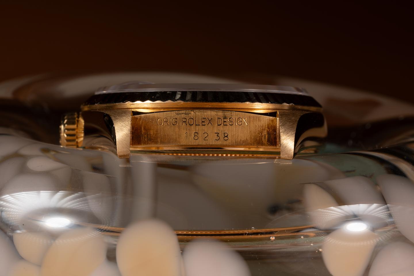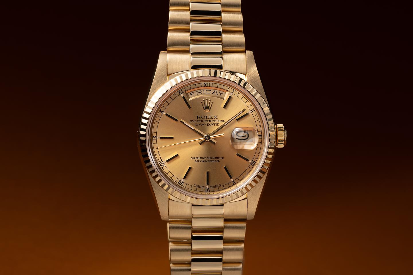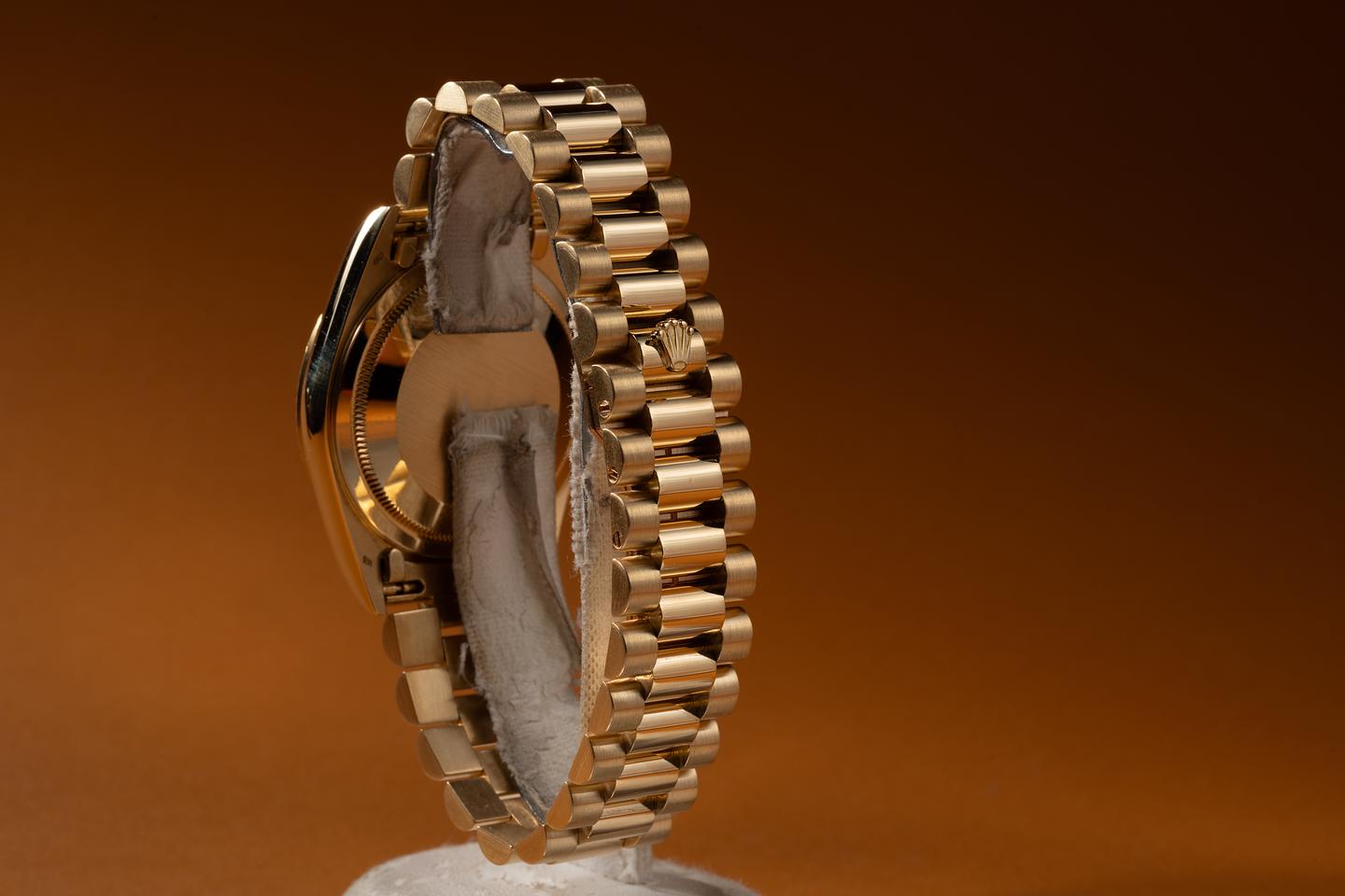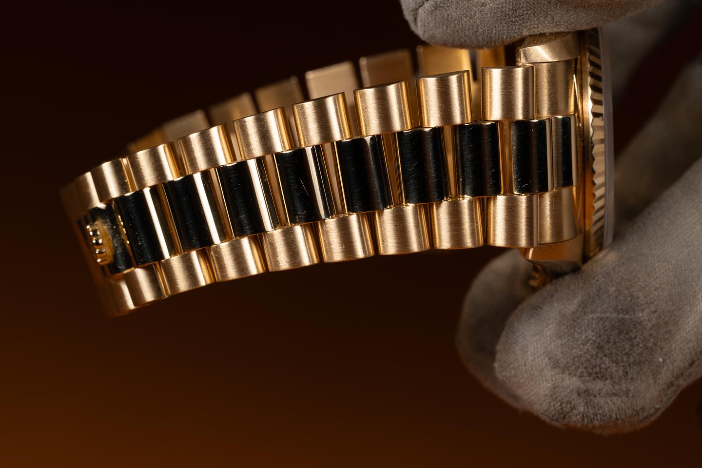 Bracelet: The 22 link 18K yellow-gold President bracelet is excellent showing only light stretch for its age. The clasp is stamped with a matching 1989.