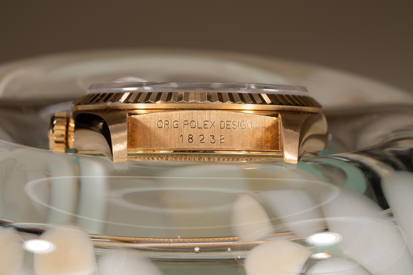 Case: The thick and even 18k yellow gold case has recently been polished showing only very light wear. The 18k yellow gold fluted bezel is sharp showing only very light wear from use.