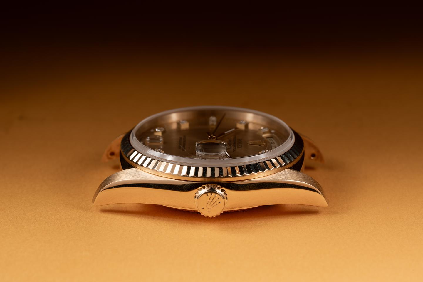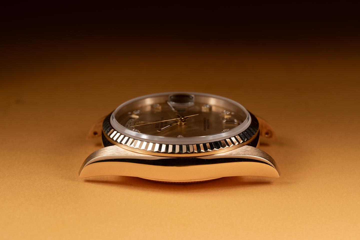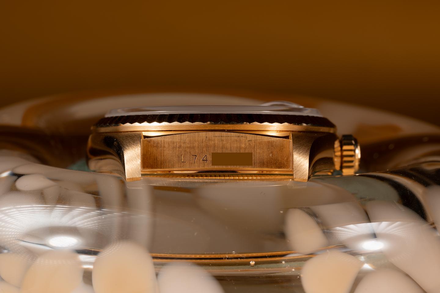 Case: The 36mm 18K yellow gold case is excellent showing only very light wear from use. The 18K yellow gold fluted bezel is also in excellent condition showing only very light wear from use.