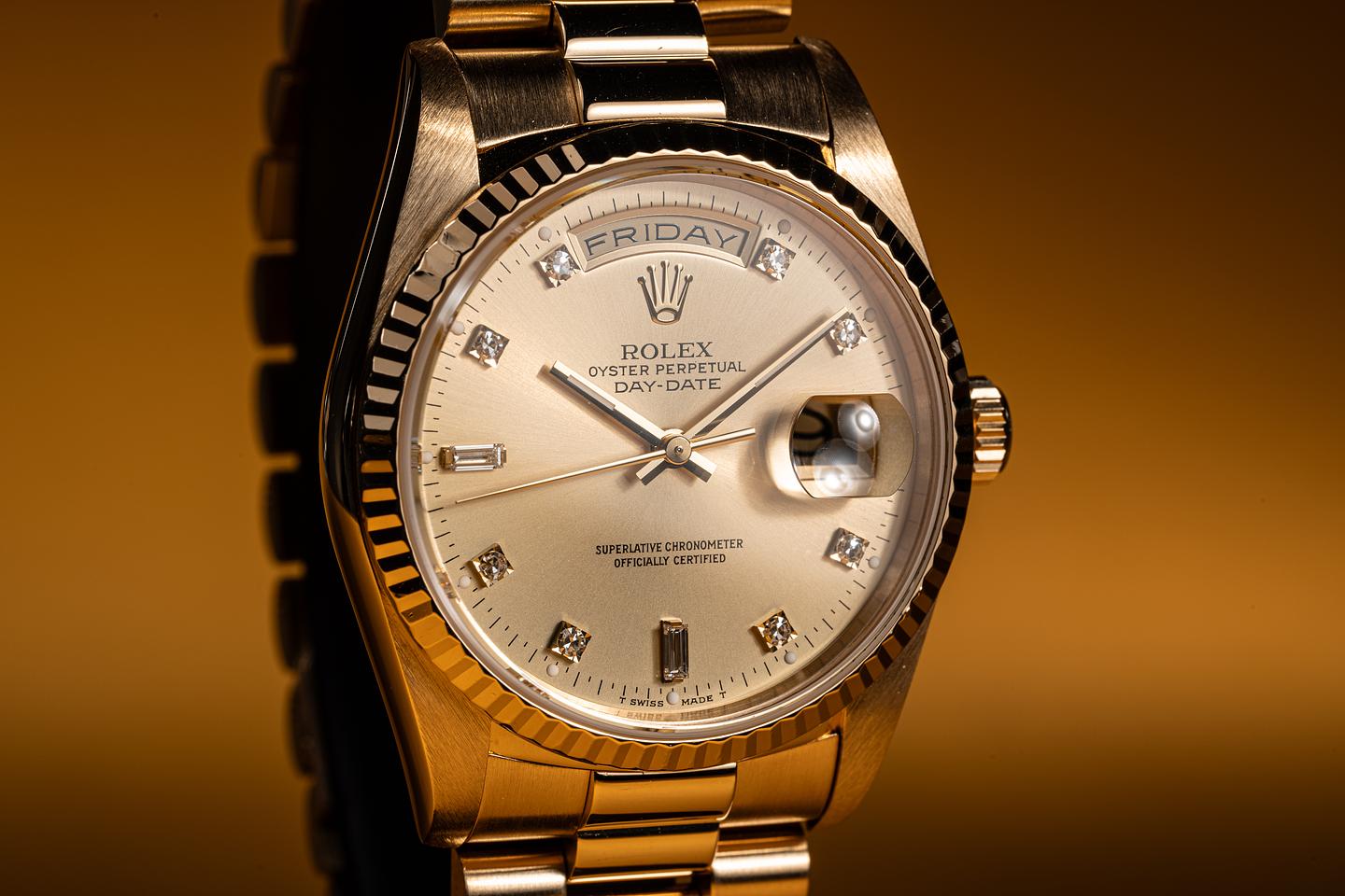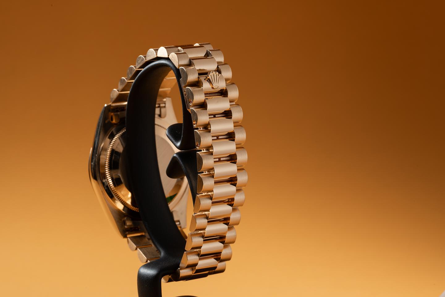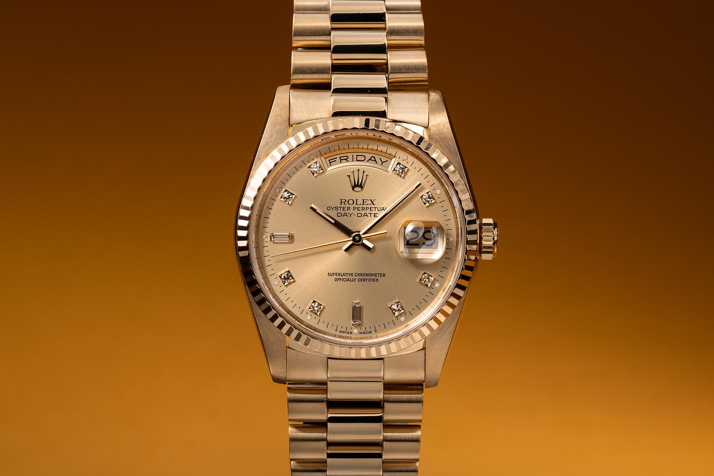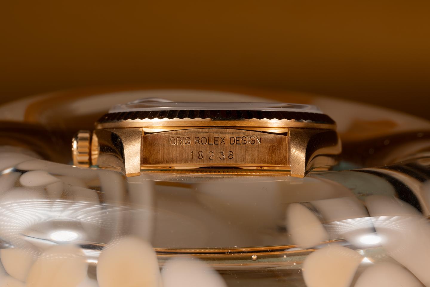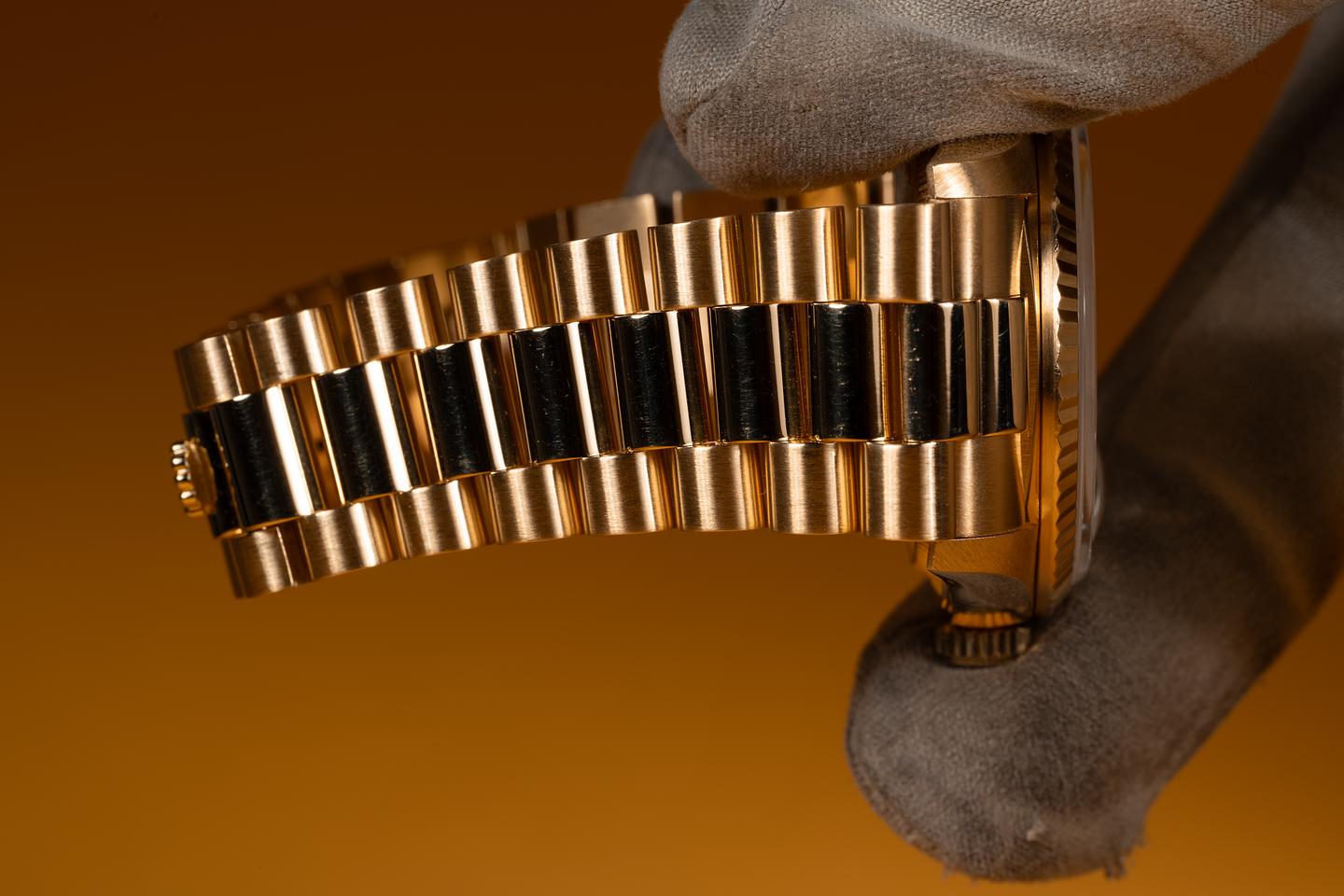 Bracelet: The 22 link 18K yellow gold President bracelet is excellent showing only very light stretch for its age. The clasp is stamped with a matching 1989 date code.