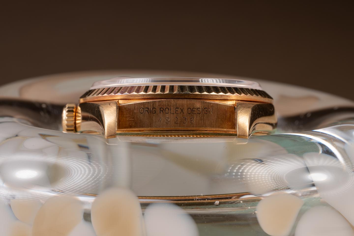 Case: The thick and even 18k yellow gold case is excellent, showing a warm, rosy patina and some light wear from use. The 18k yellow gold fluted bezel is also in excellent condition, showing a warm, rosy patina and only light wear from use.