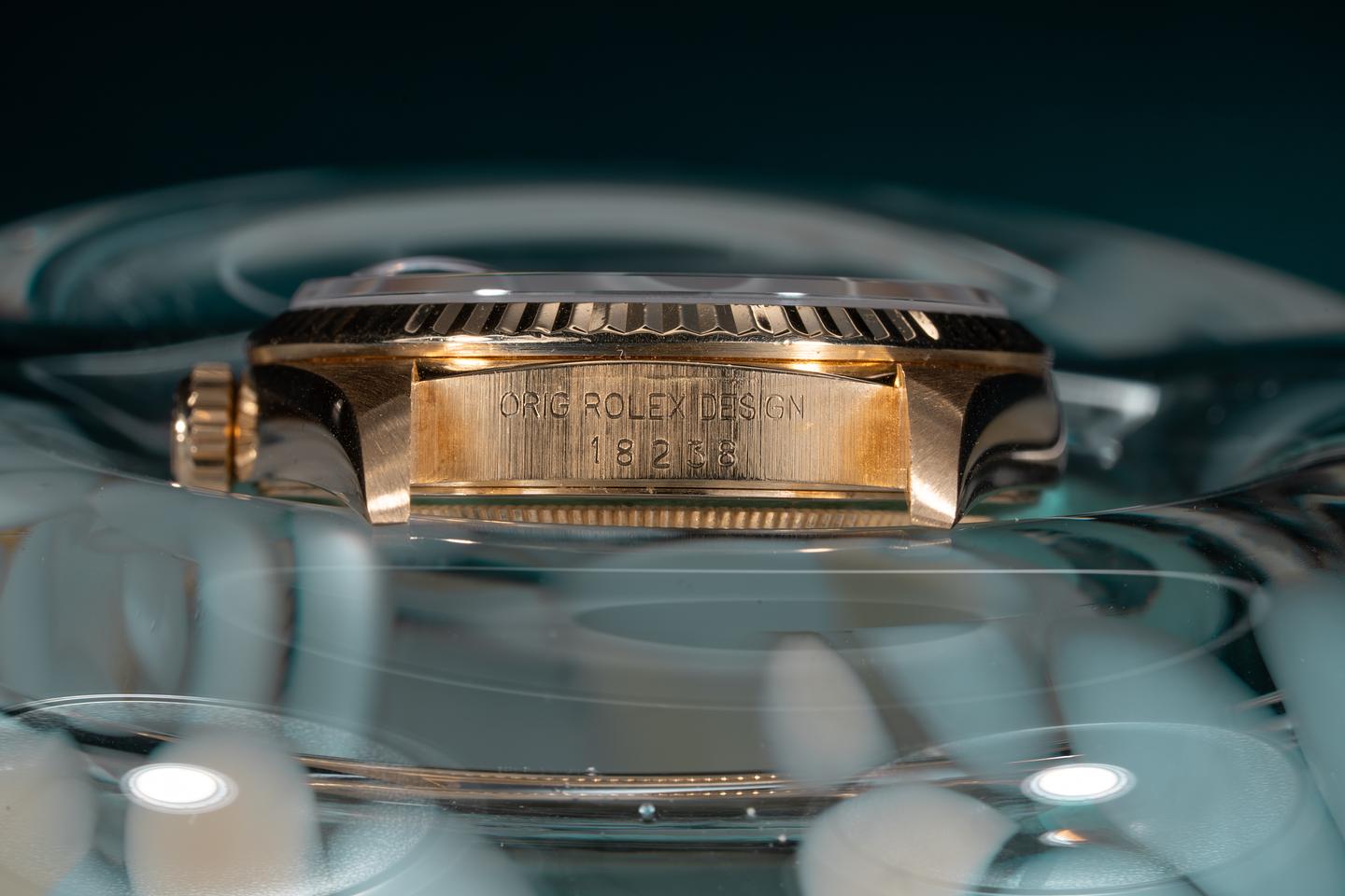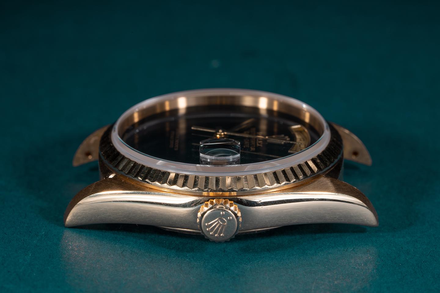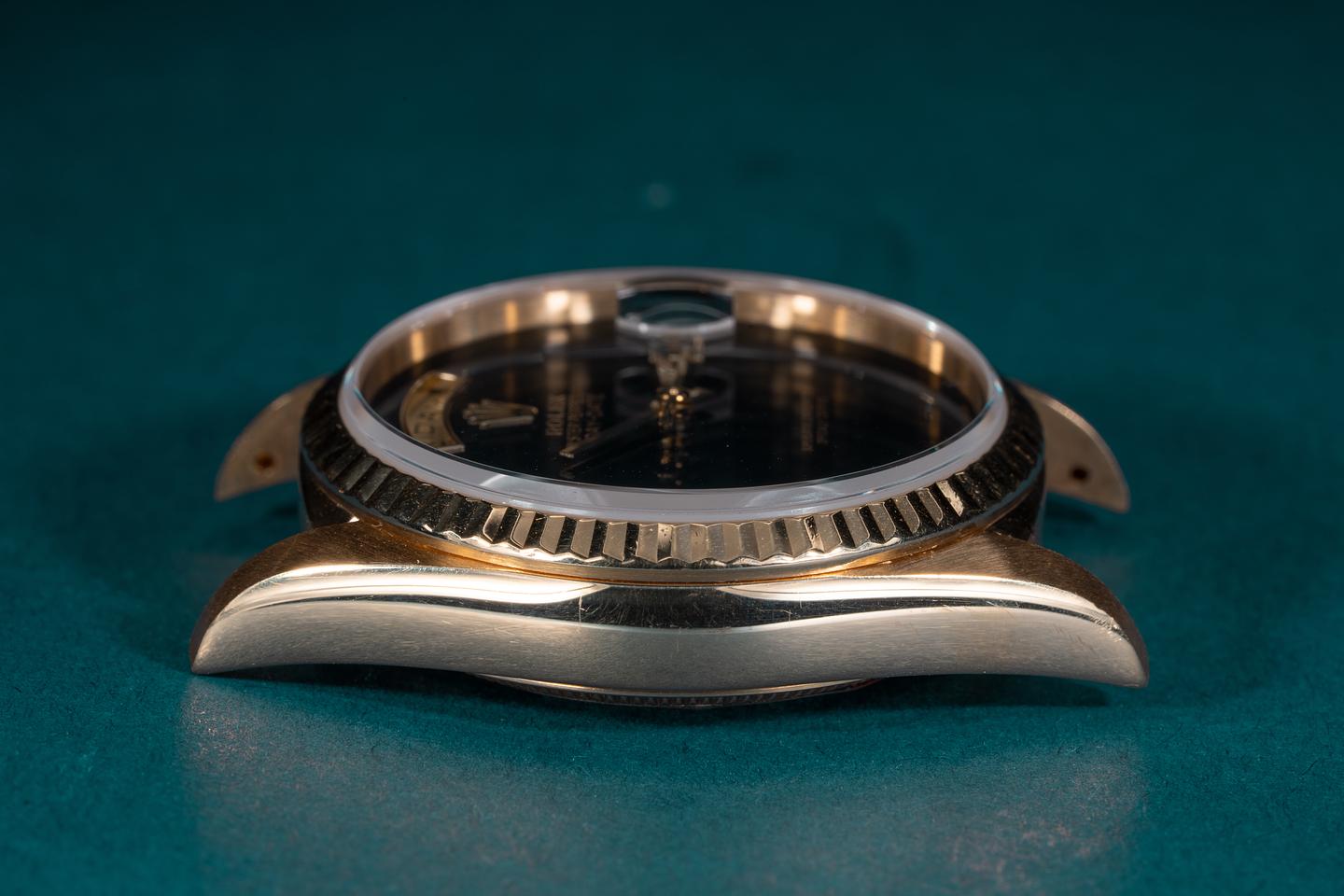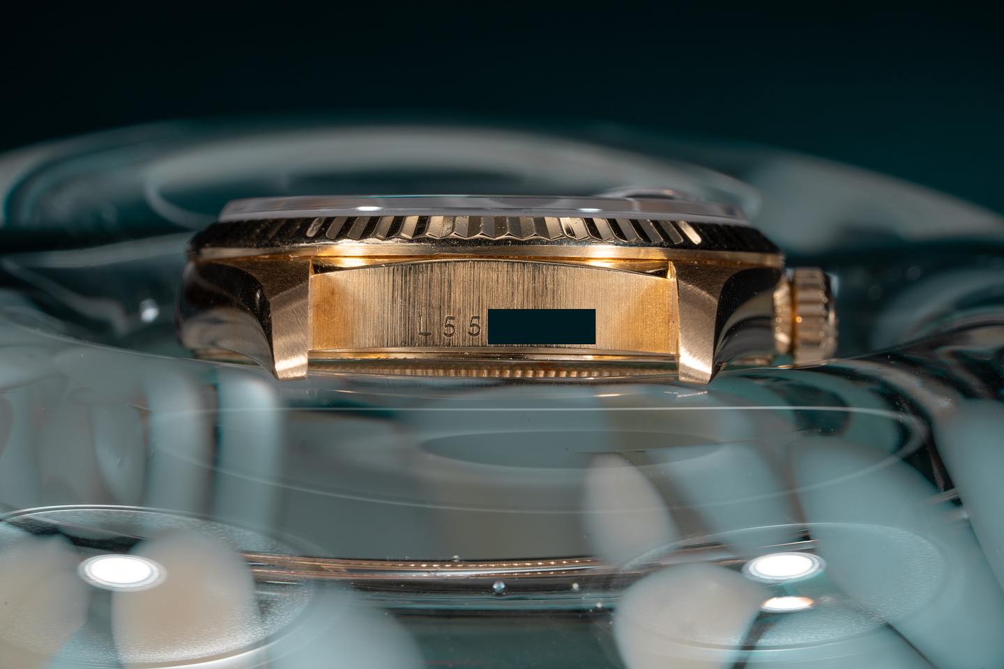 Case: The thick and even 18k yellow gold case has been polished recently showing only very light wear from use. The sharp 18k yellow gold fluted bezel is also in excellent condition showing only very light wear from use.