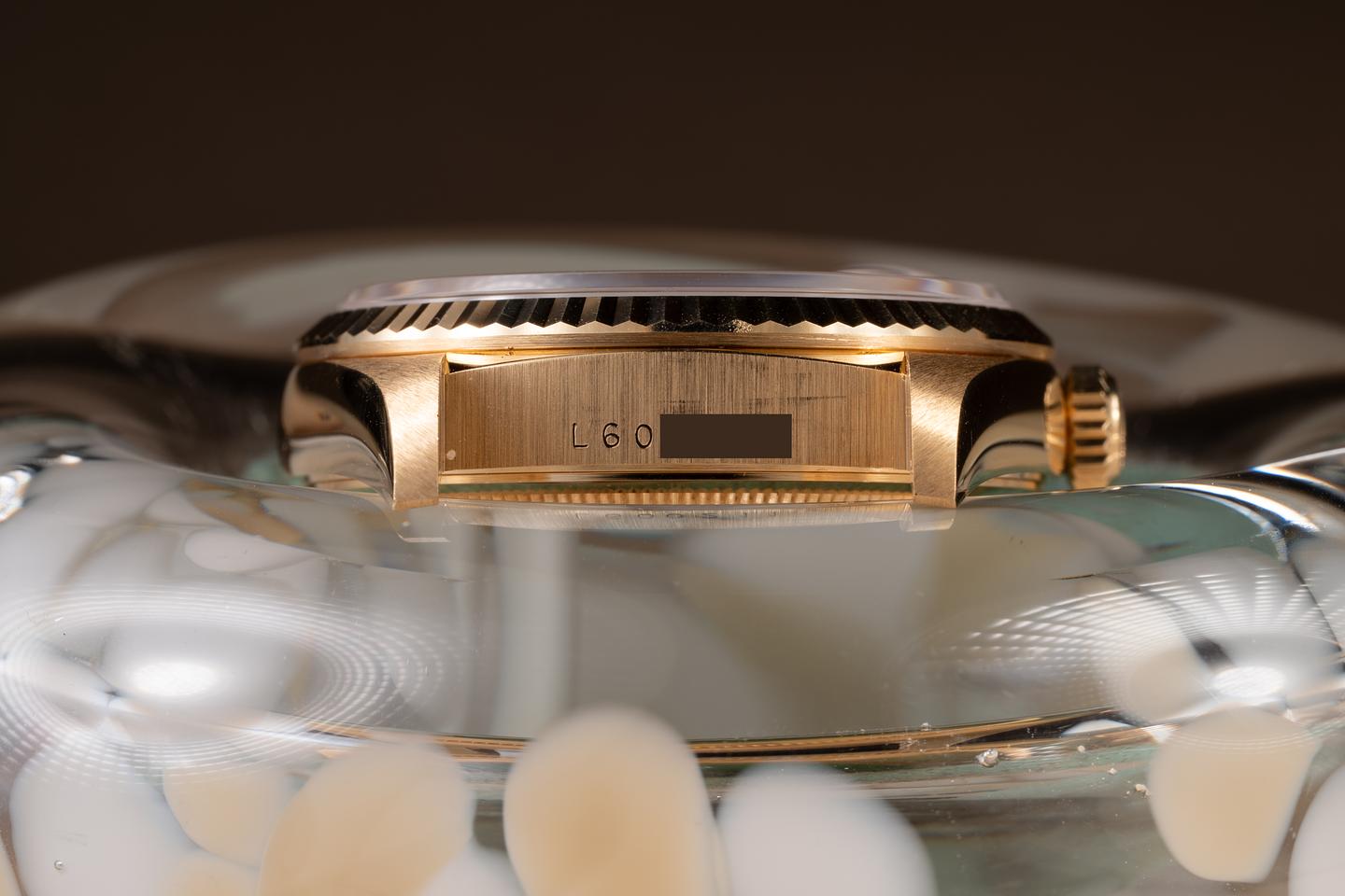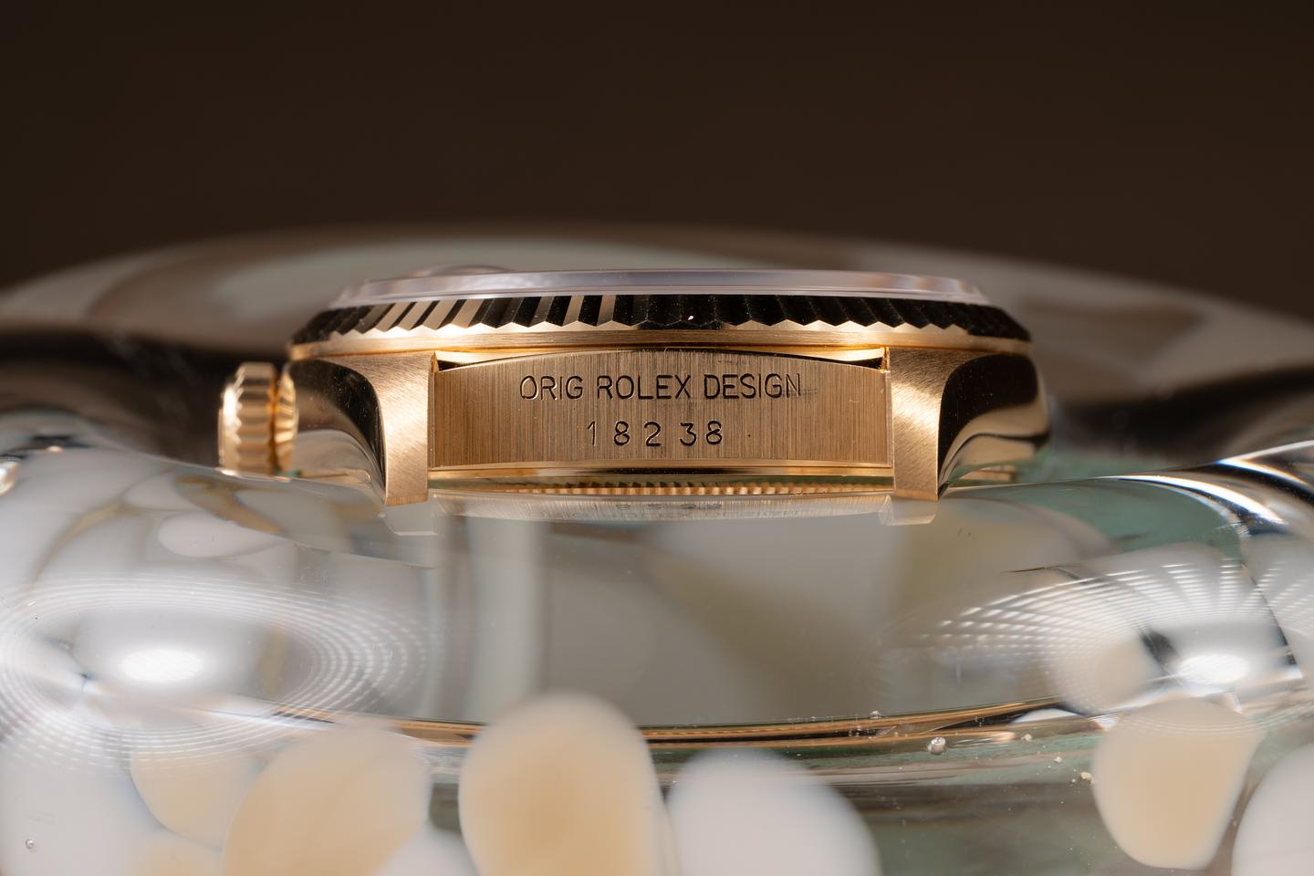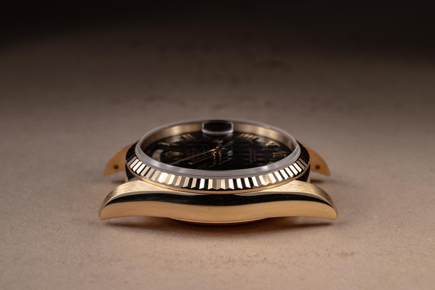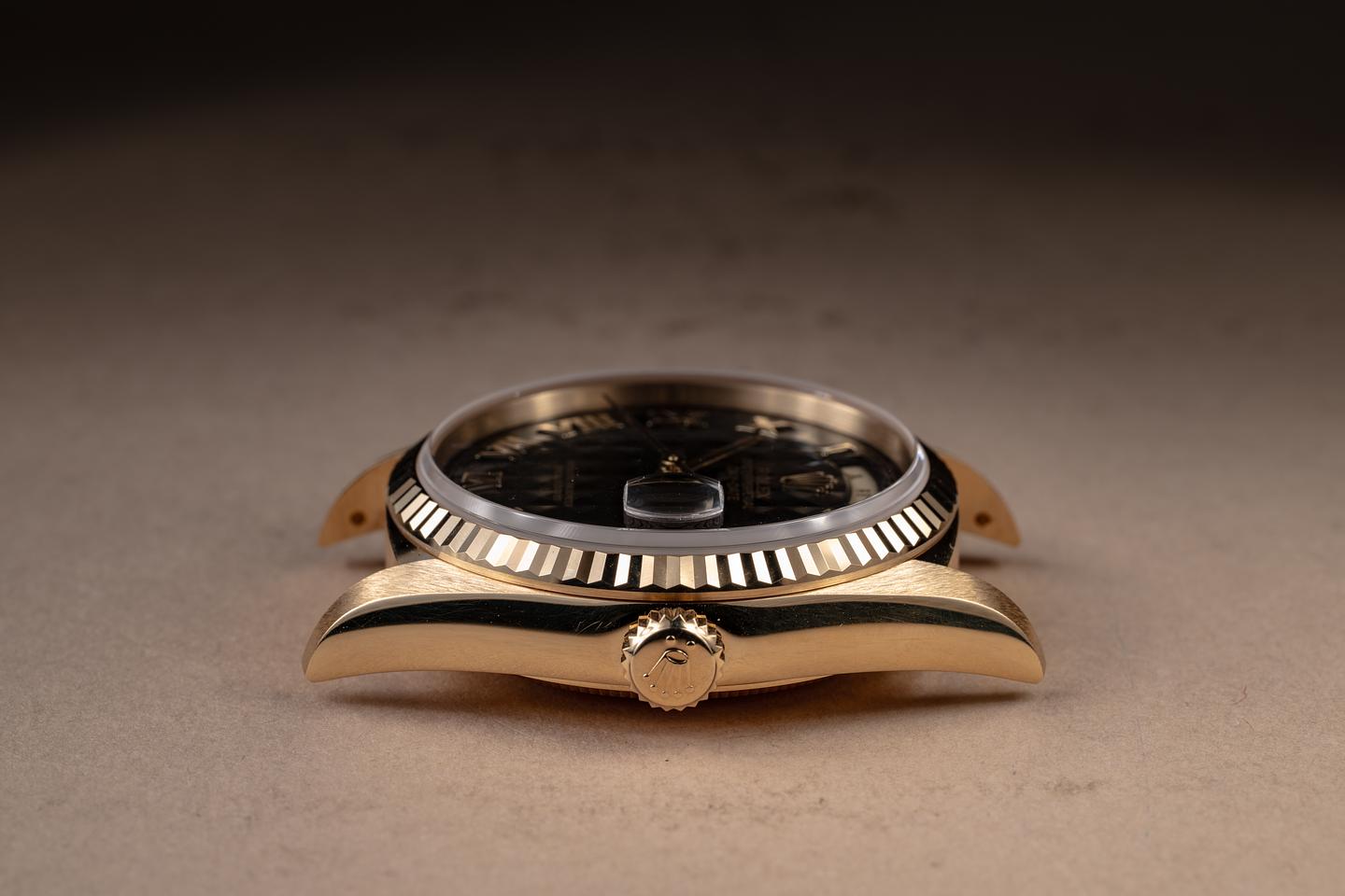 Case: The sharp 36mm 18K yellow gold case is excellent, showing only very light wear from use. The sharp 18K yellow gold fluted bezel is also in excellent condition, showing only very light wear from use.