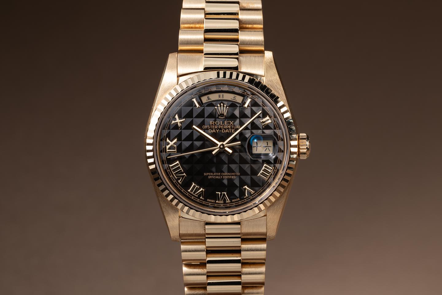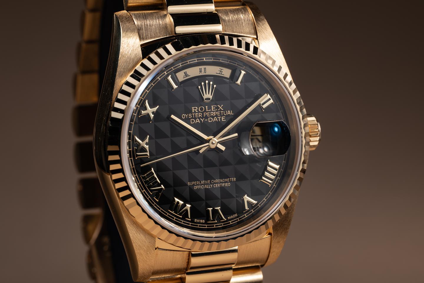Dial: The black pyramid dial is excellent, showing no visible wear. The original factory no lume hands are matching. The watch comes with an uncommon Chinese Day-Date Disk.