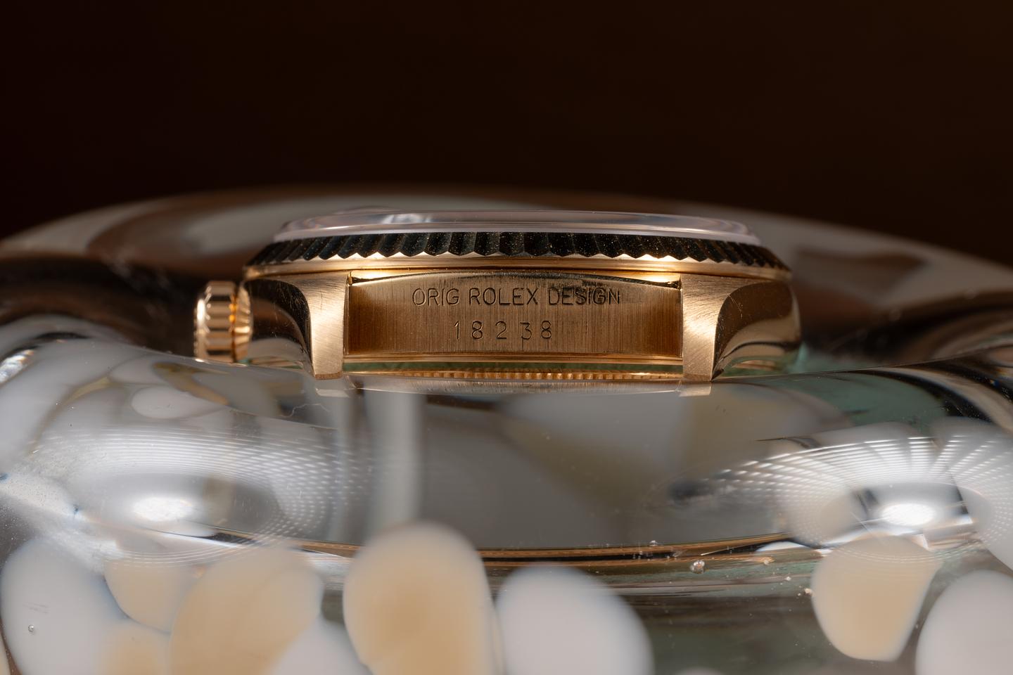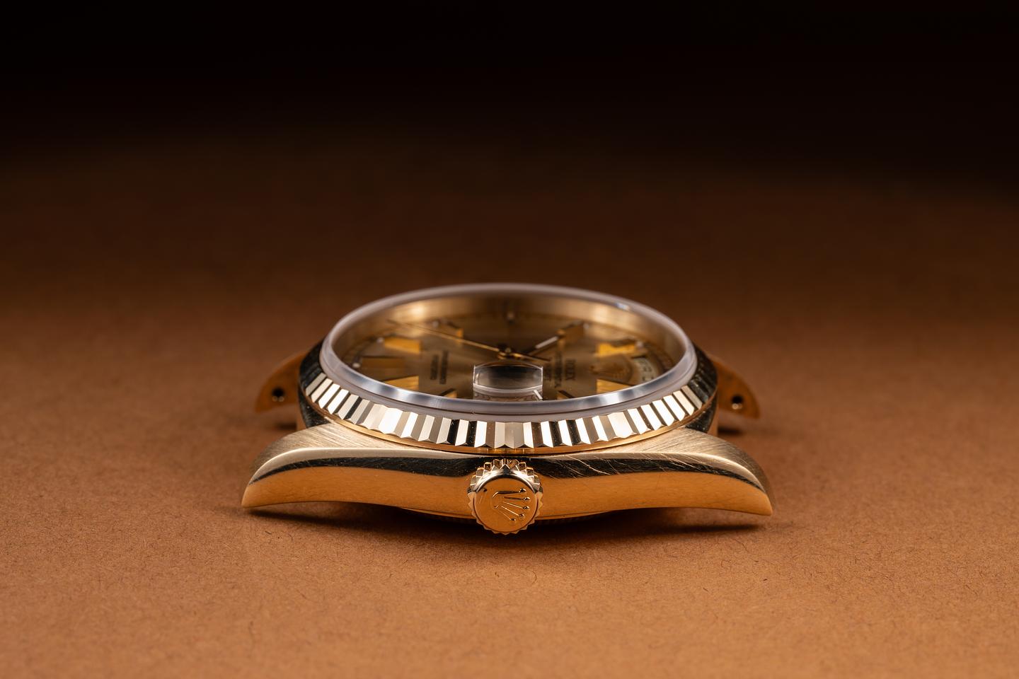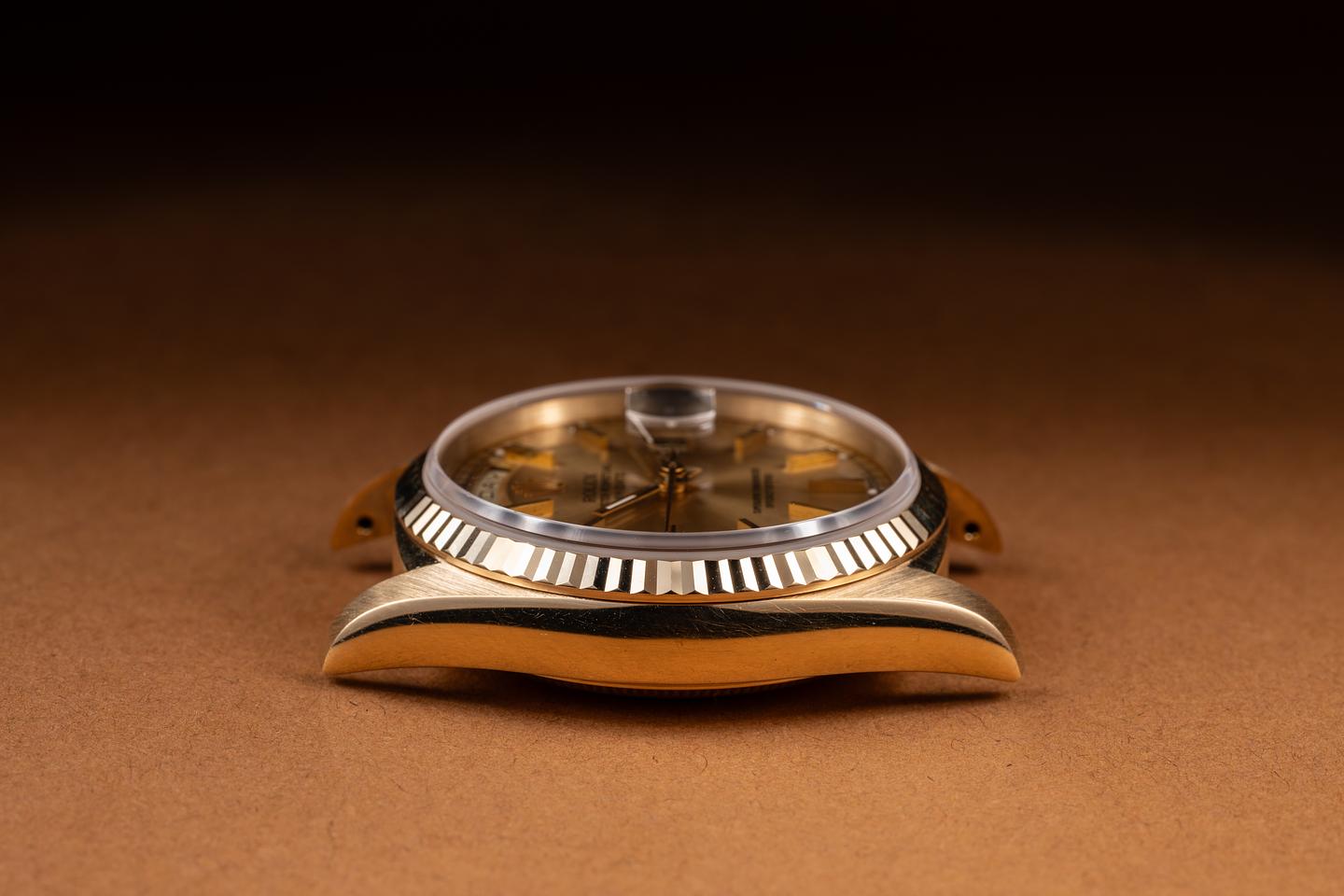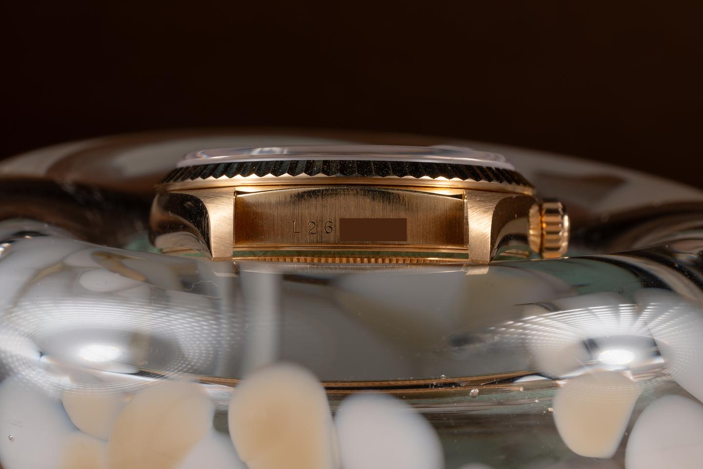 Case: The thick and even 18K yellow gold case is excellent, showing only light wear from use. The sharp 18K yellow gold fluted bezel is also in excellent condition, showing only light wear from use.