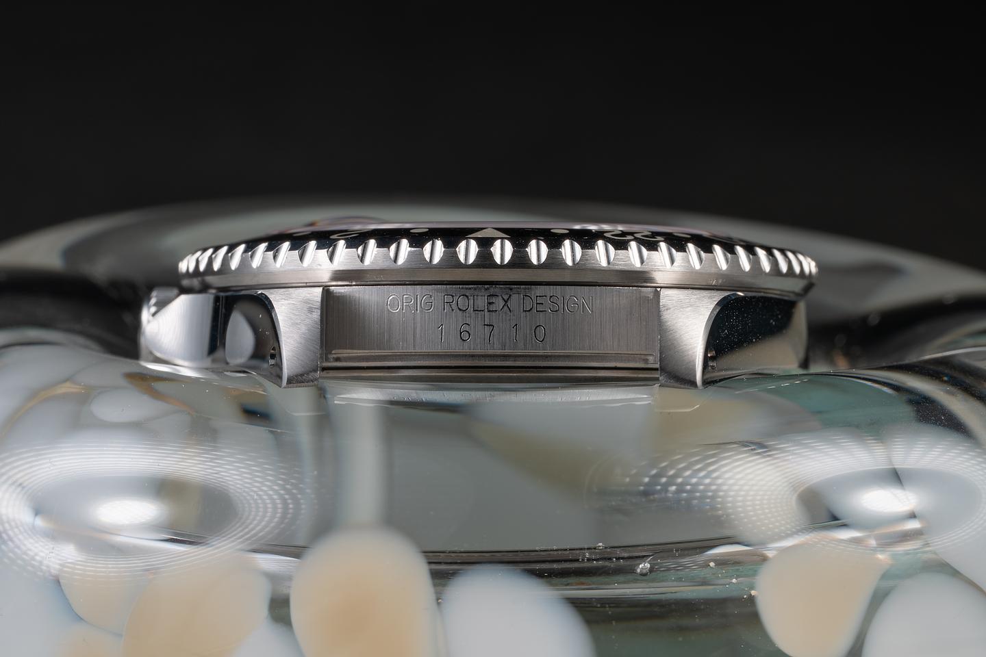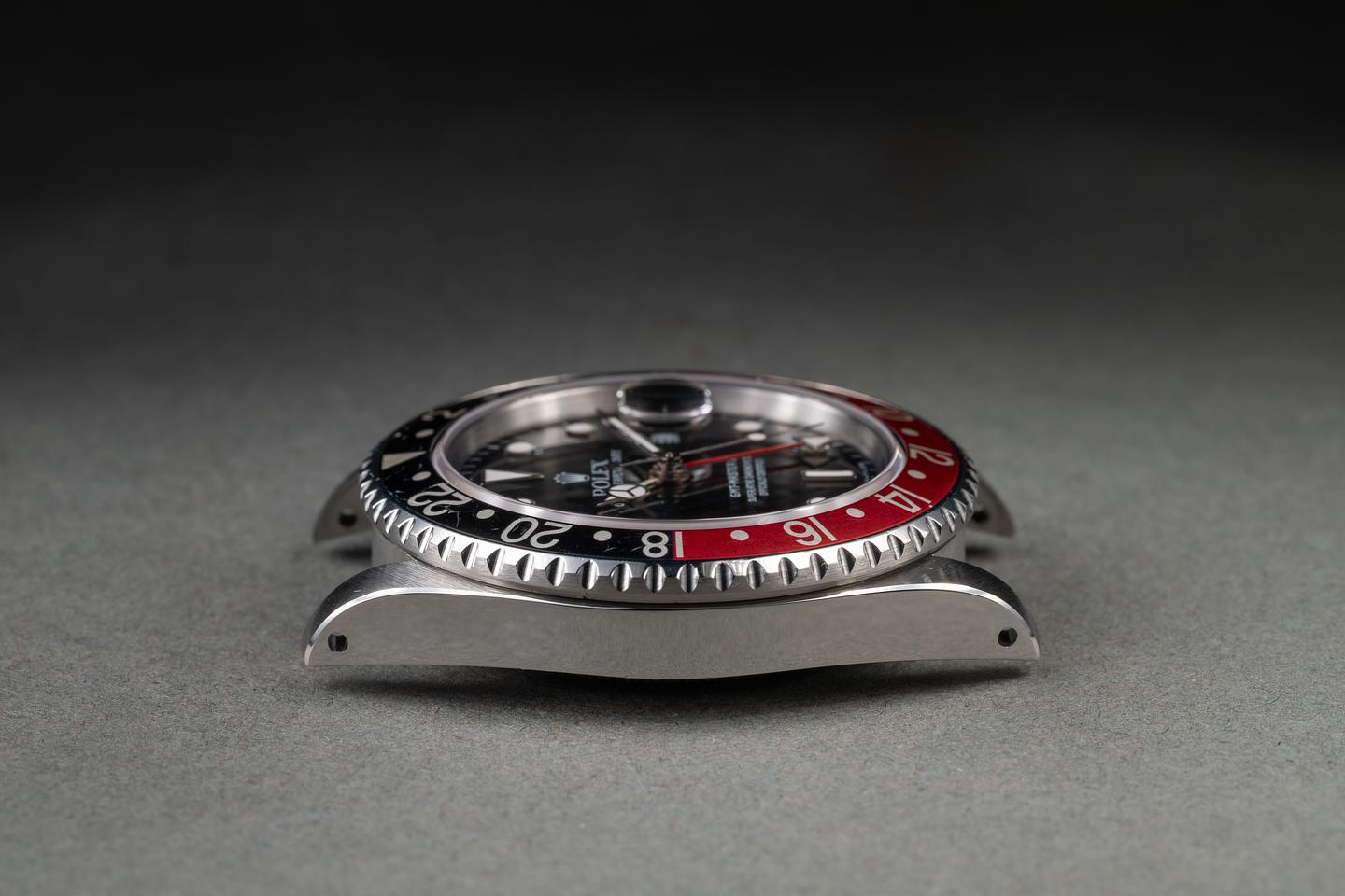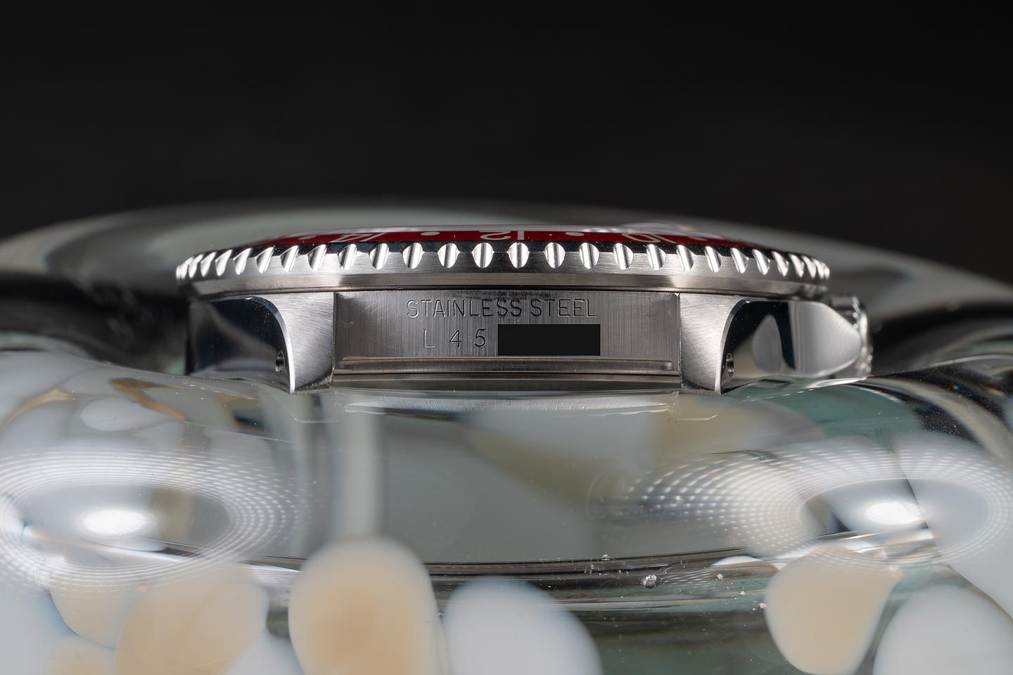 Case: The recently polished case is excellent, showing sharp, prominent bevels and only very light wear. The red and black "Coke" bezel insert is also in excellent condition, showing some light fading to the red portion of the insert and only light wear from use.